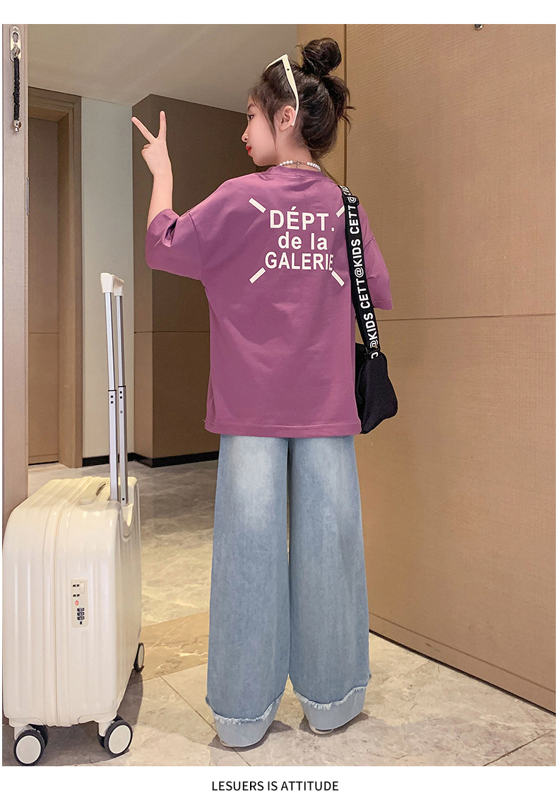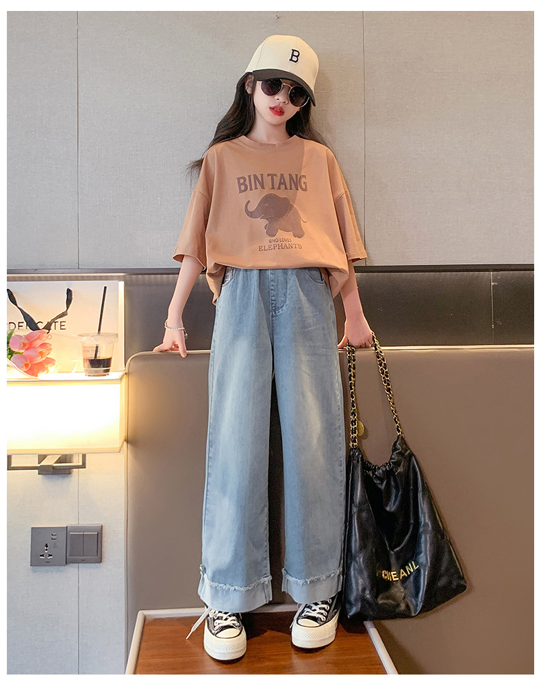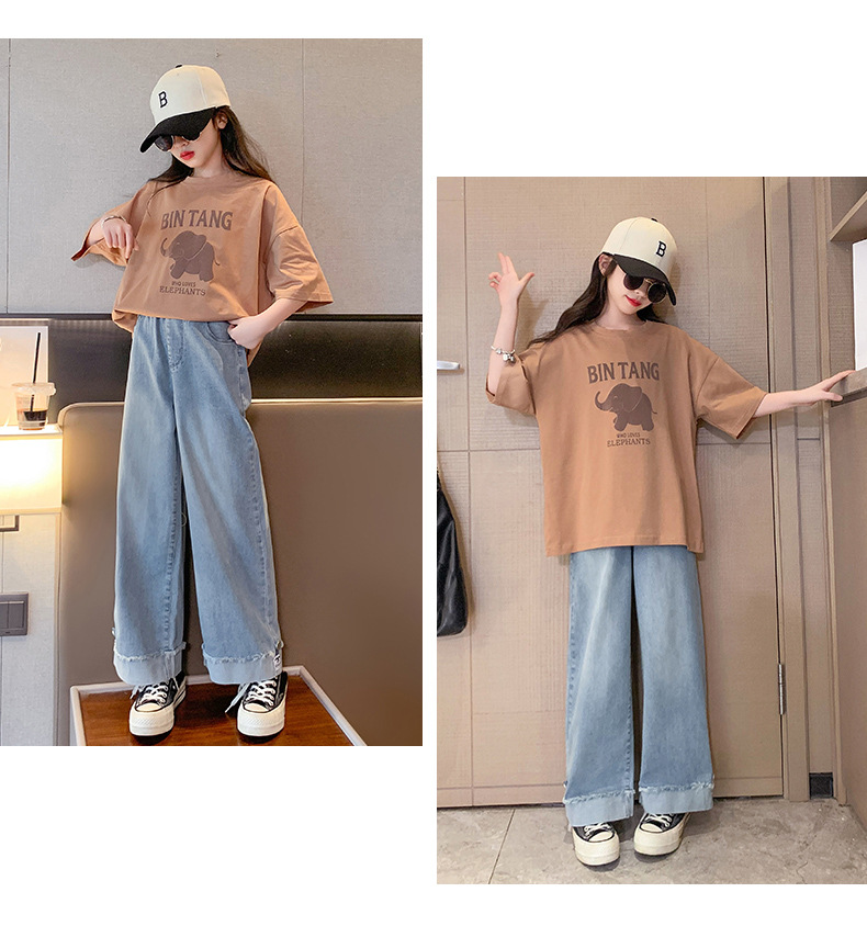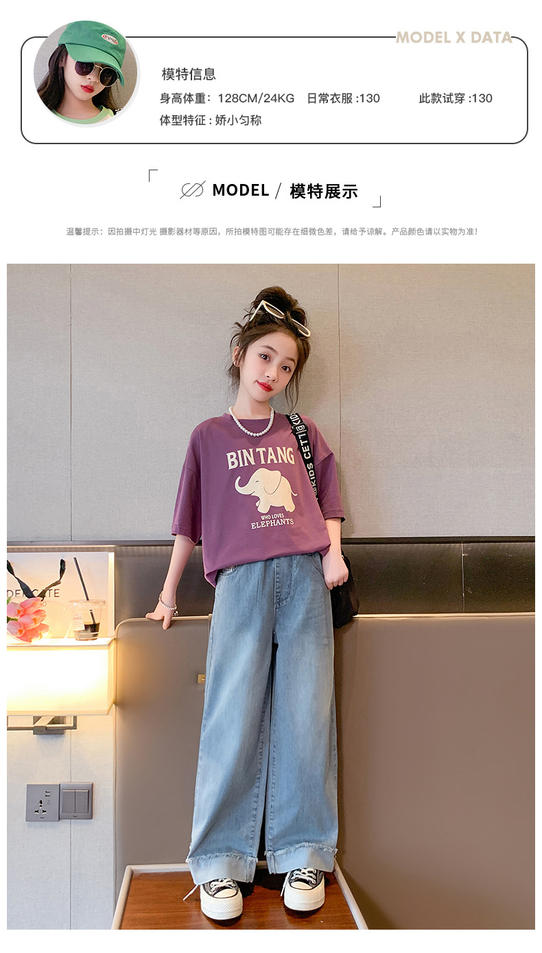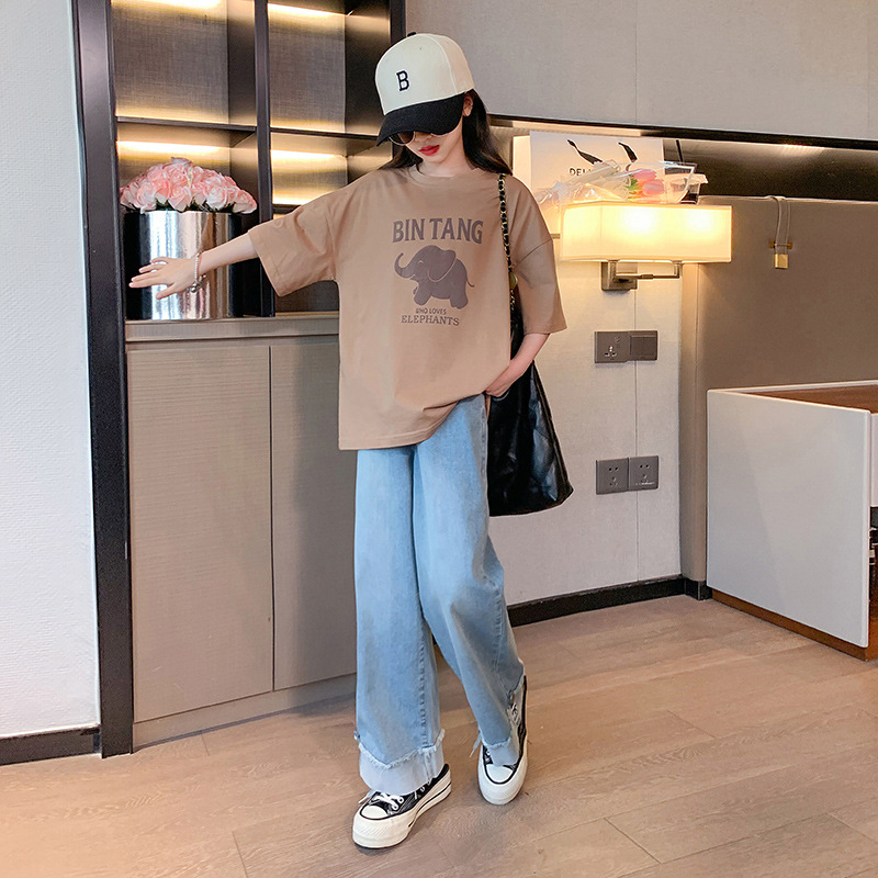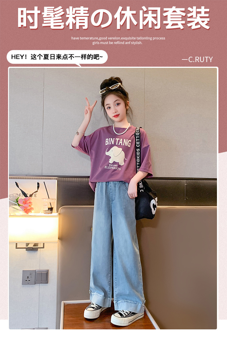 소녀 여름 세트 2024 새로운 어린이 면 반팔 티셔츠 얇은 청바지 여름 투피스 세트스토어 가기