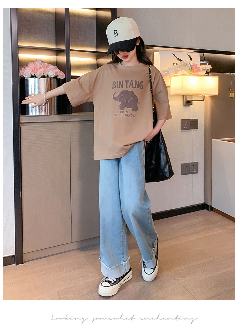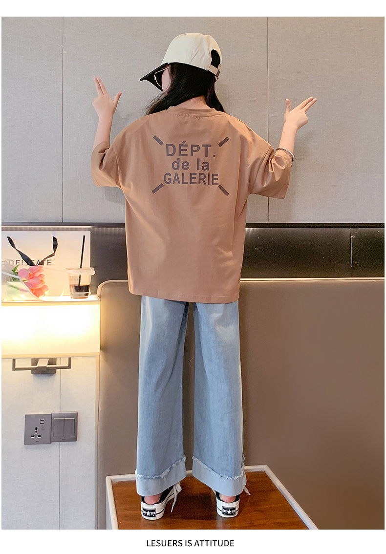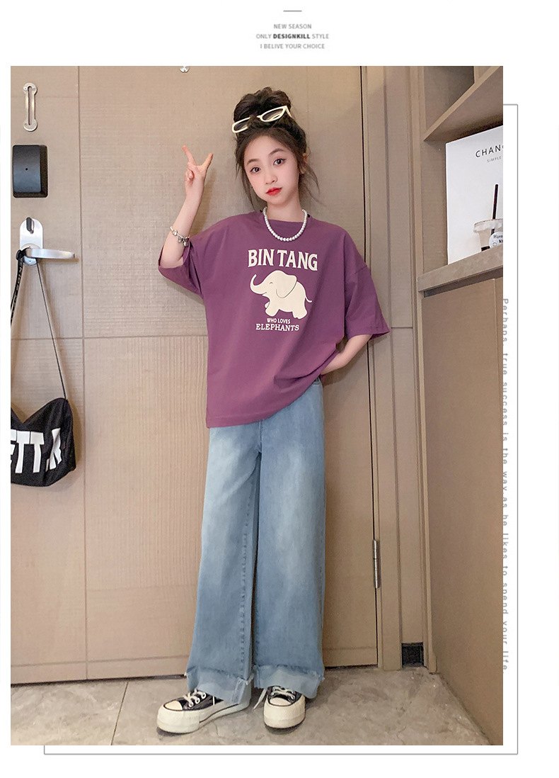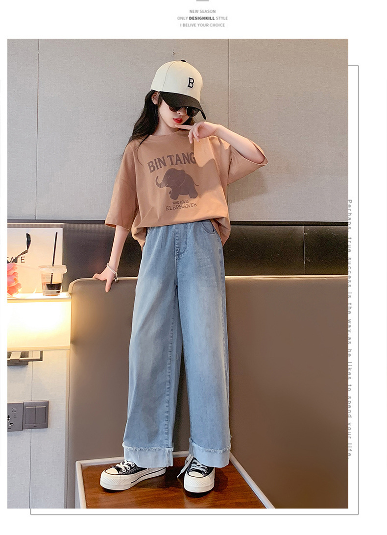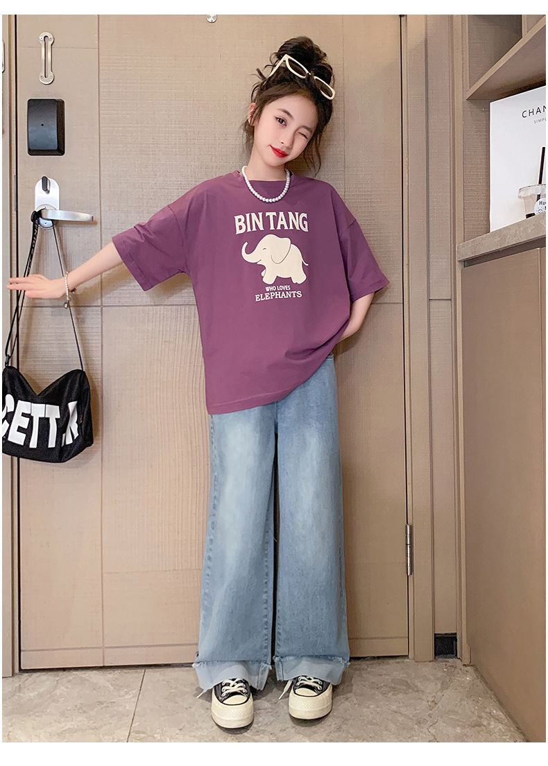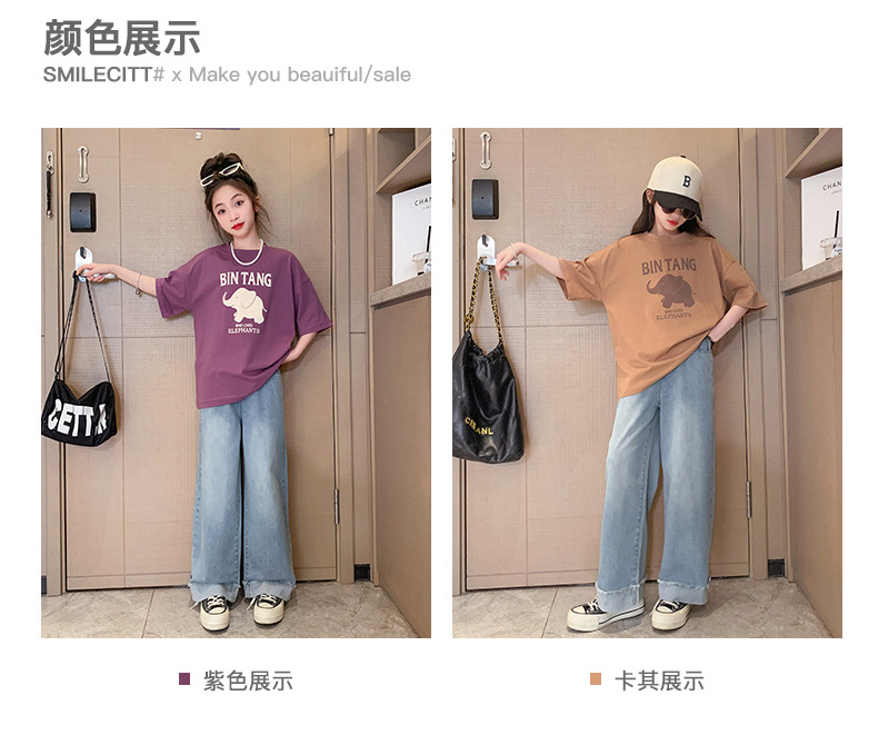 소녀 여름 세트 2024 새로운 어린이 면 반팔 티셔츠 얇은 청바지 여름 투피스 세트스토어 가기