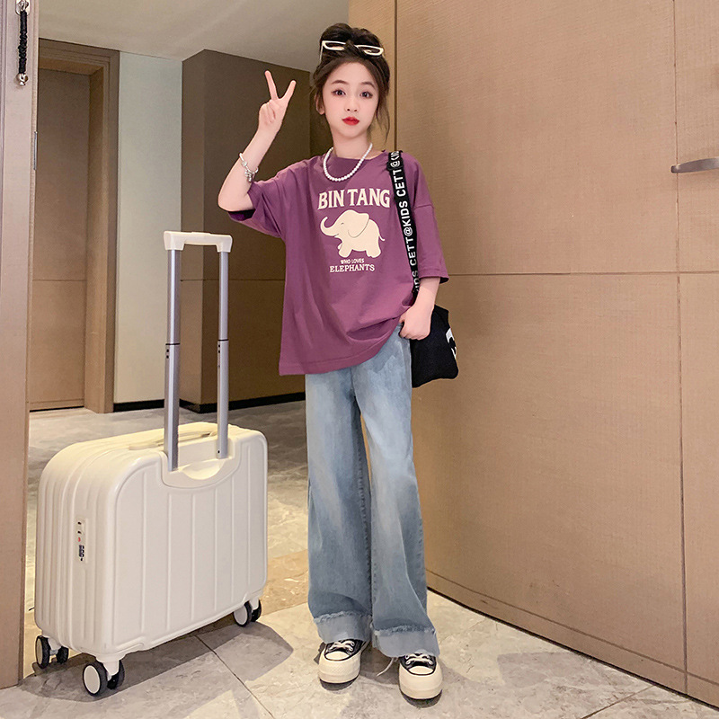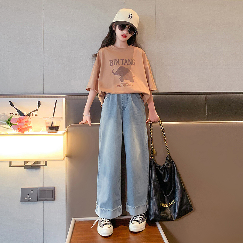 소녀 여름 세트 2024 새로운 어린이 면 반팔 티셔츠 얇은 청바지 여름 투피스 세트