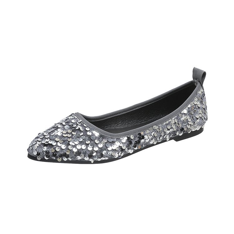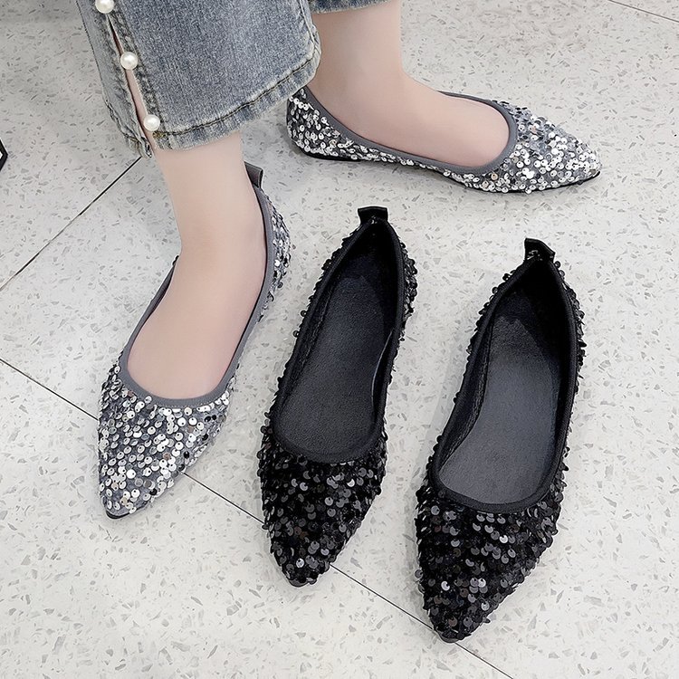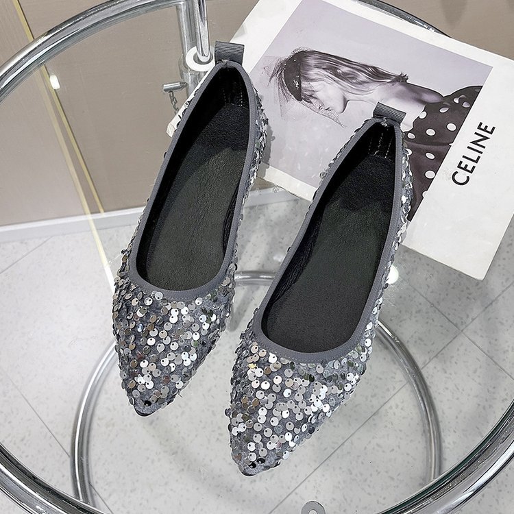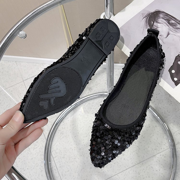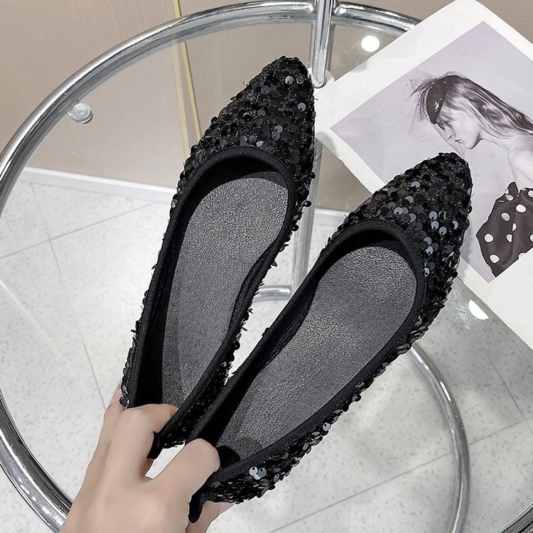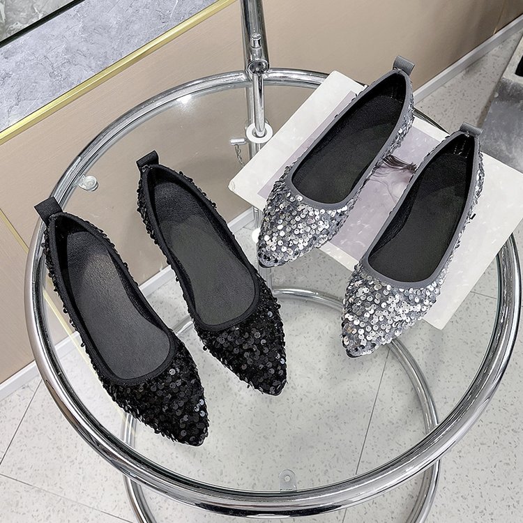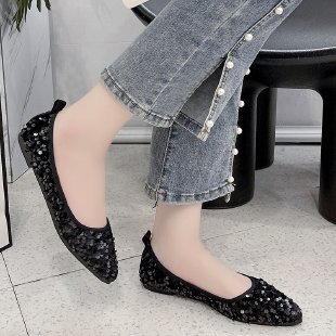 뾰족한 발가락 싱글 레이어 신발 여성의 평평한 바닥 스팽글 낮은 입 2024 새로운 스타일의 기질 다재다능한 부드러운 바닥 국자 신발 대형 여성 신발 41-43스토어 가기