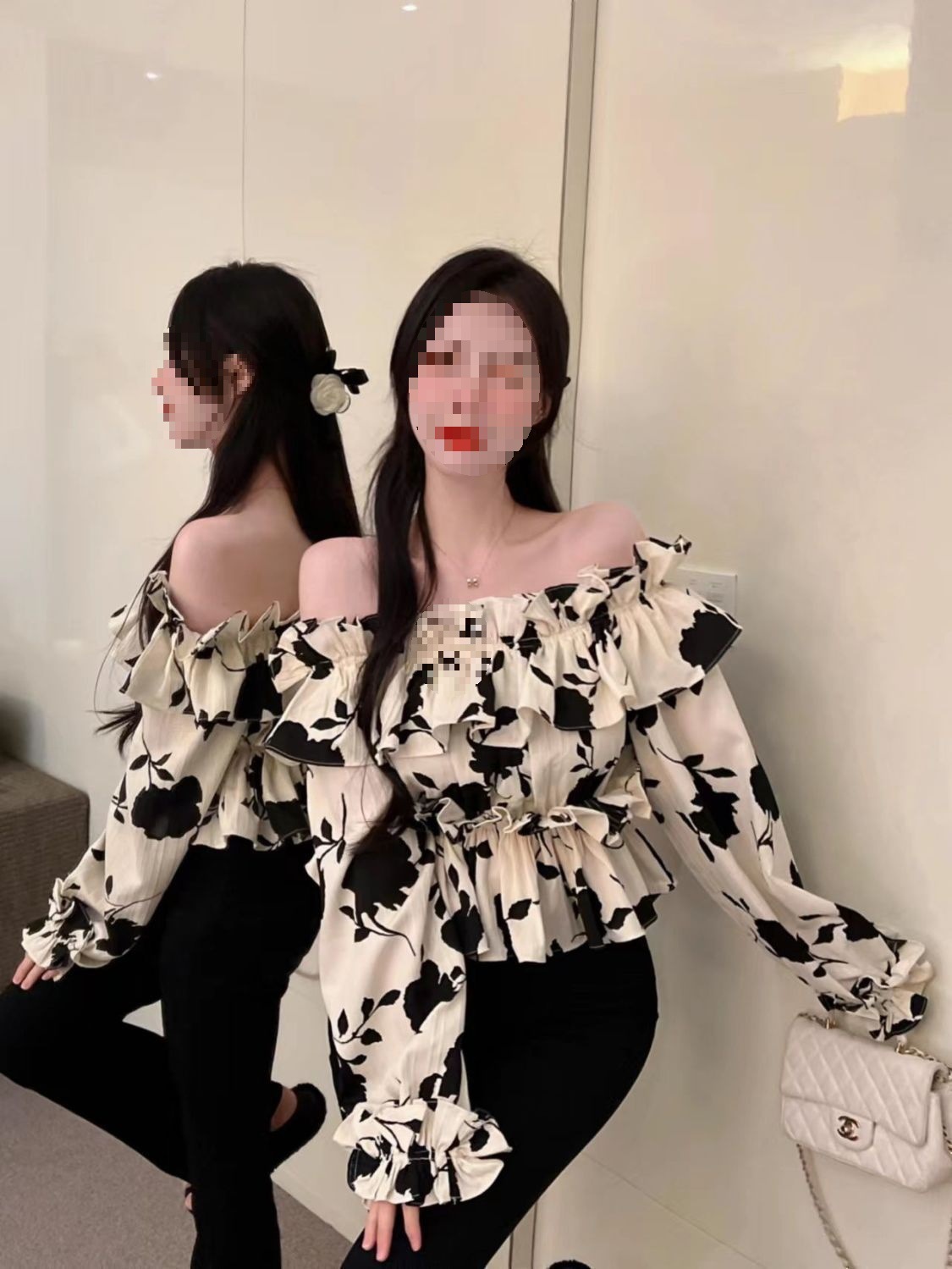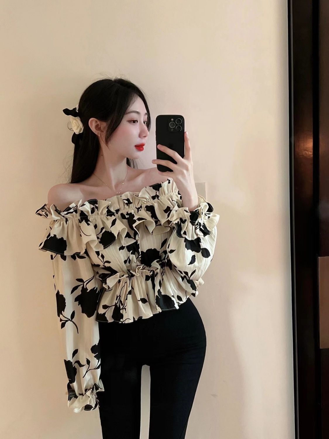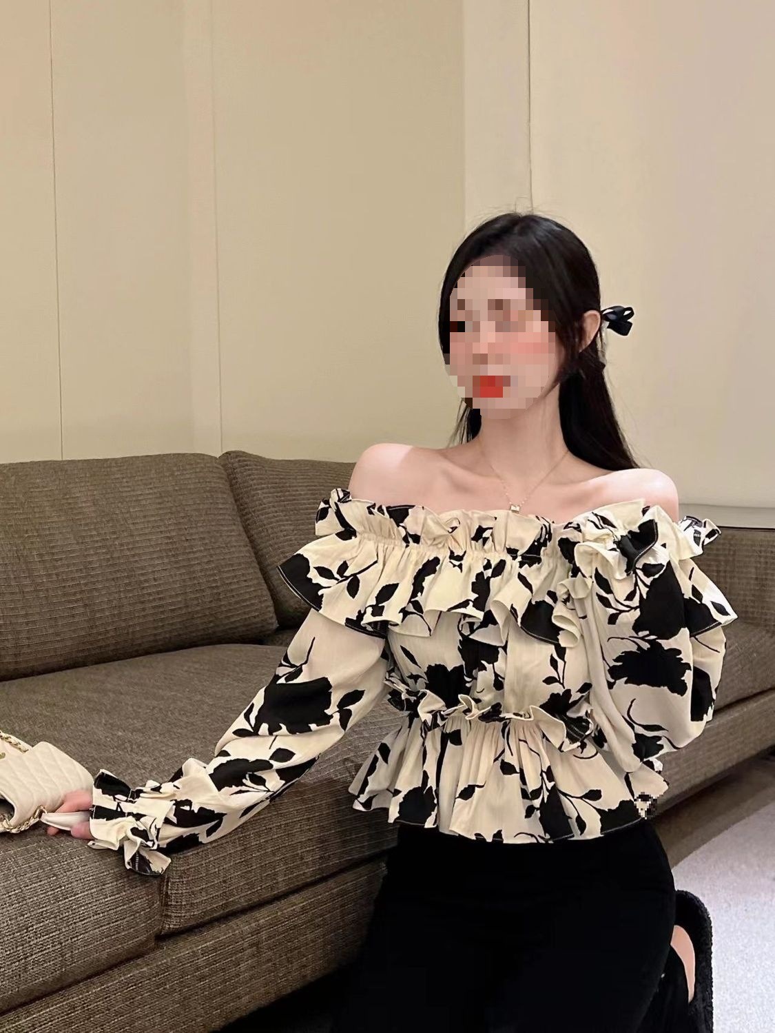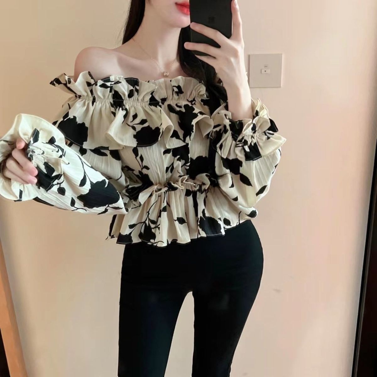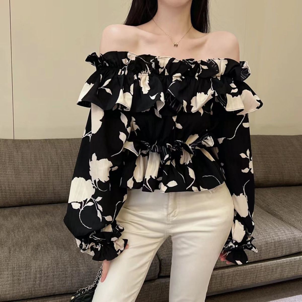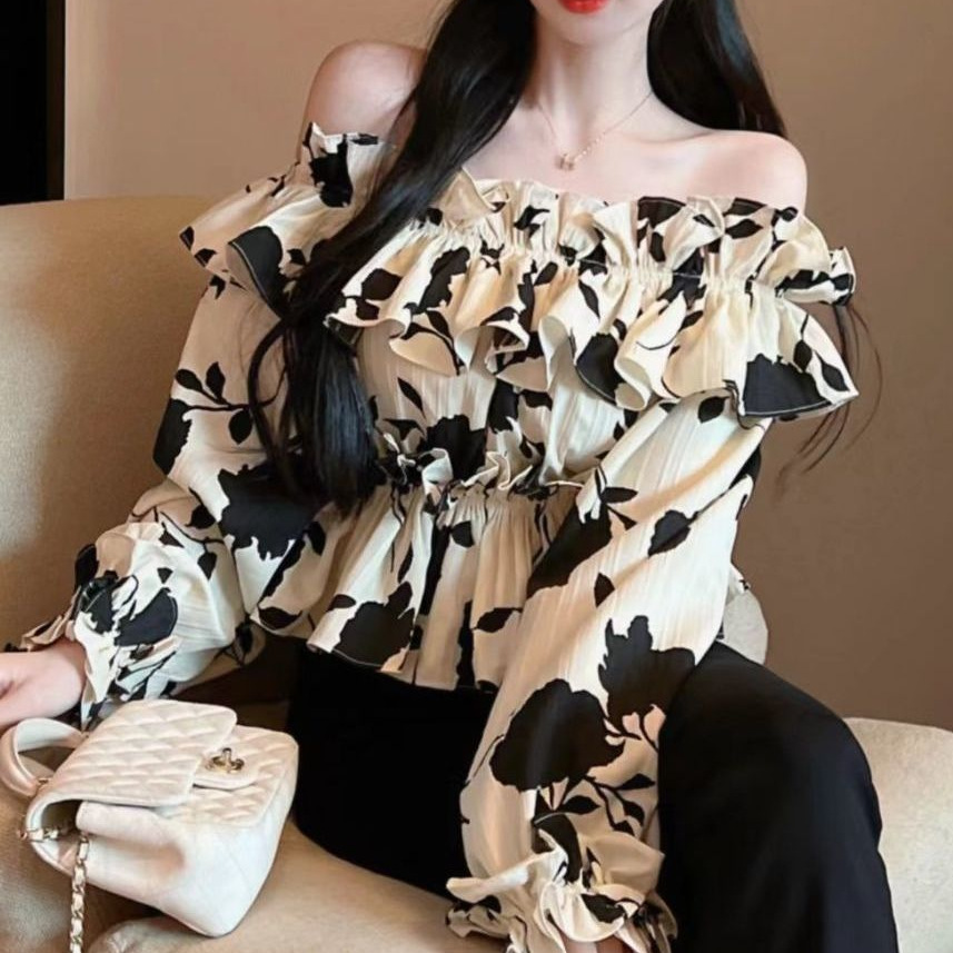 2024 년 가을 새로운 프랑스 스타일 세련된 오프 숄더 탑 인터넷 인기있는 꽃 러플 숄더 올 매치 쉬폰 셔츠스토어 가기