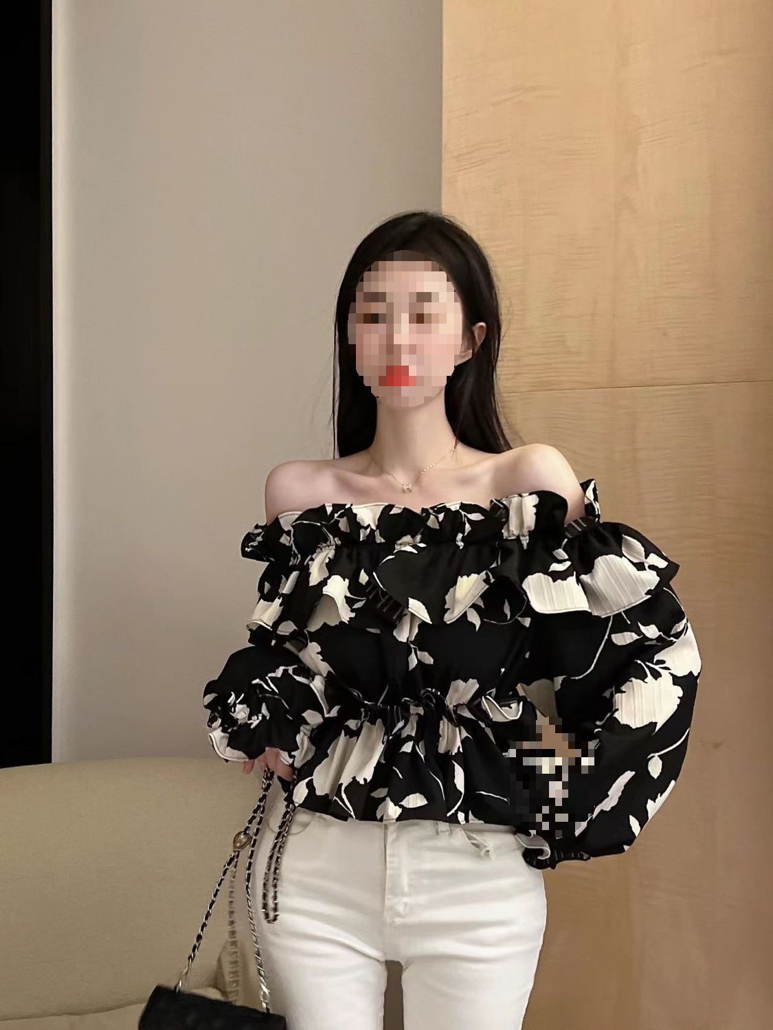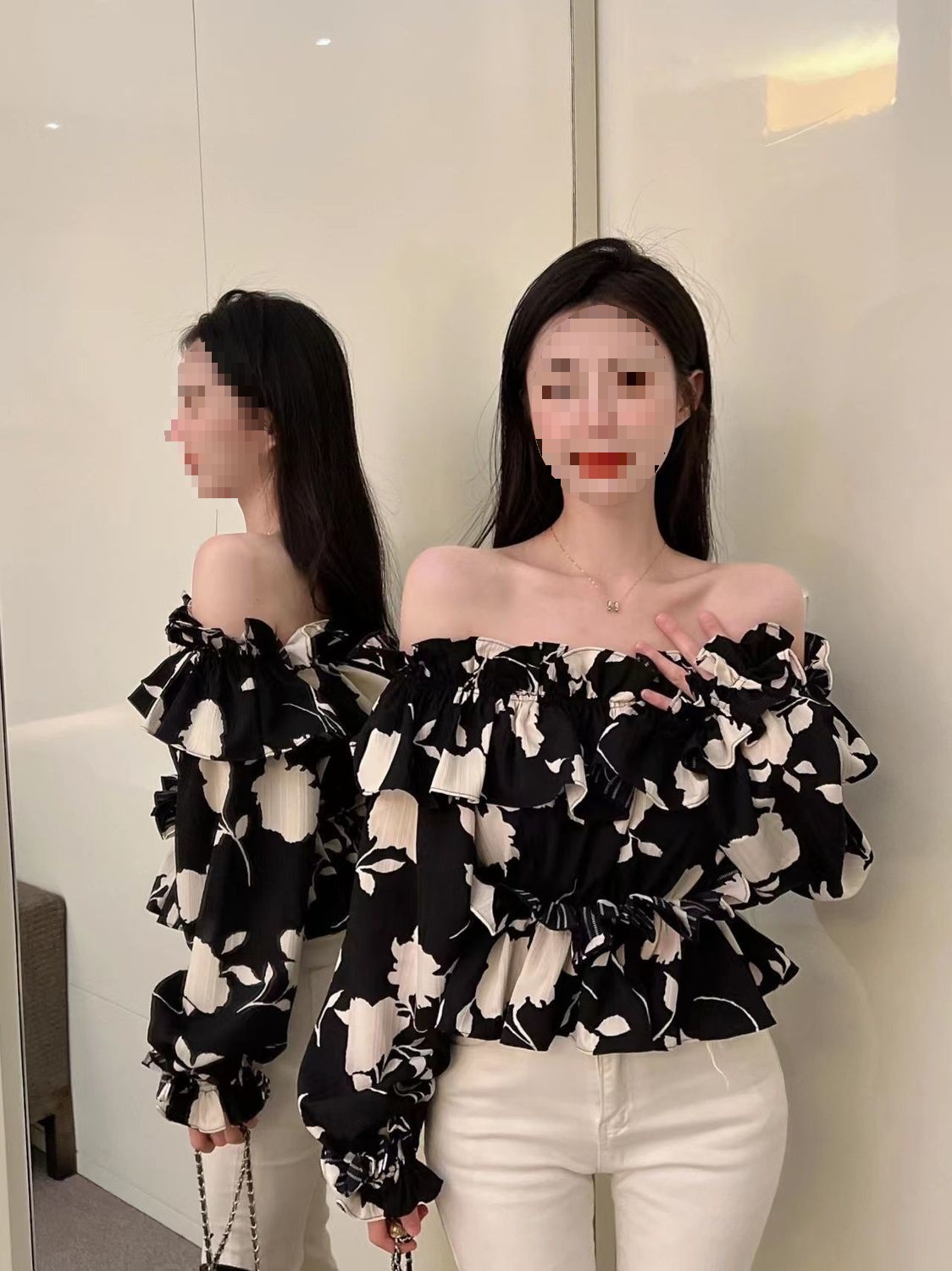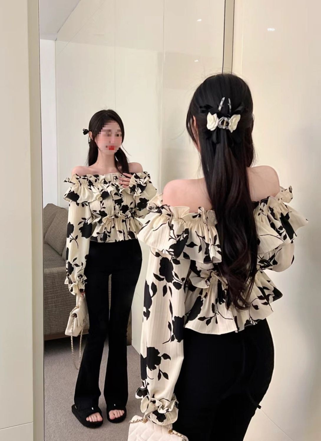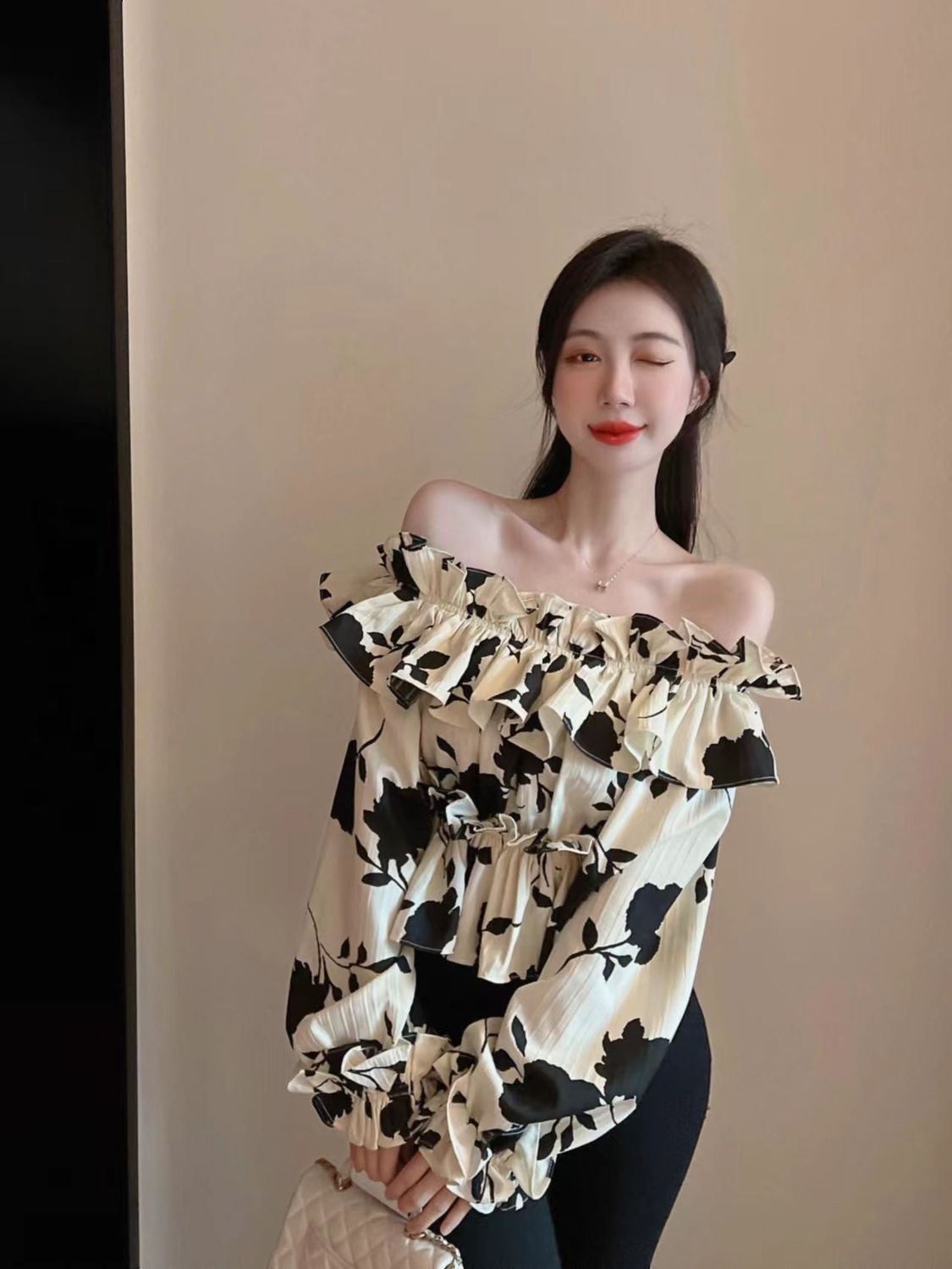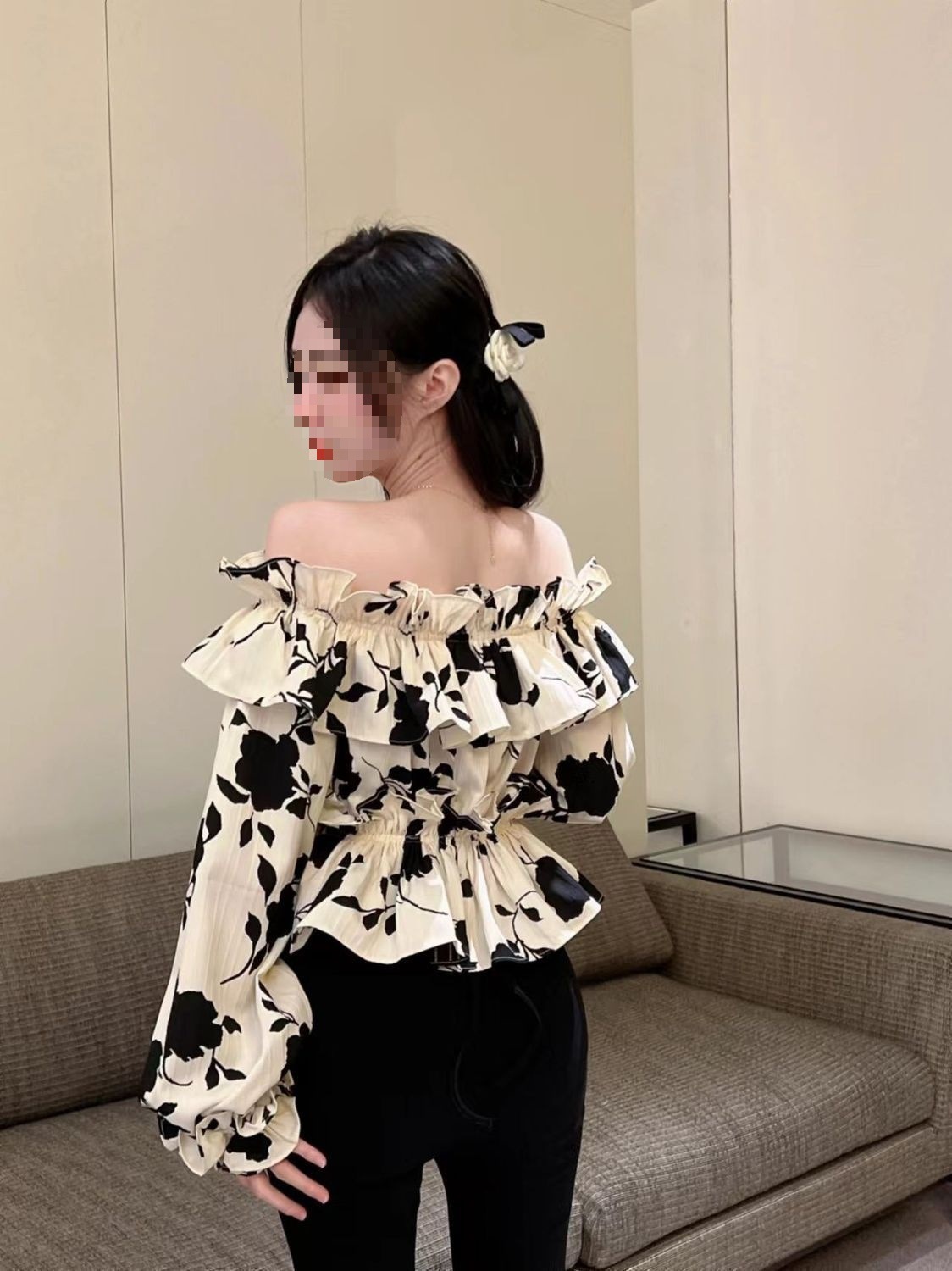 2024 년 가을 새로운 프랑스 스타일 세련된 오프 숄더 탑 인터넷 인기있는 꽃 러플 숄더 올 매치 쉬폰 셔츠스토어 가기