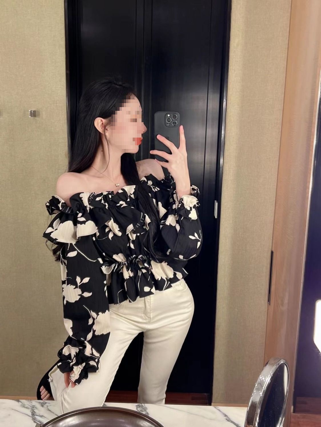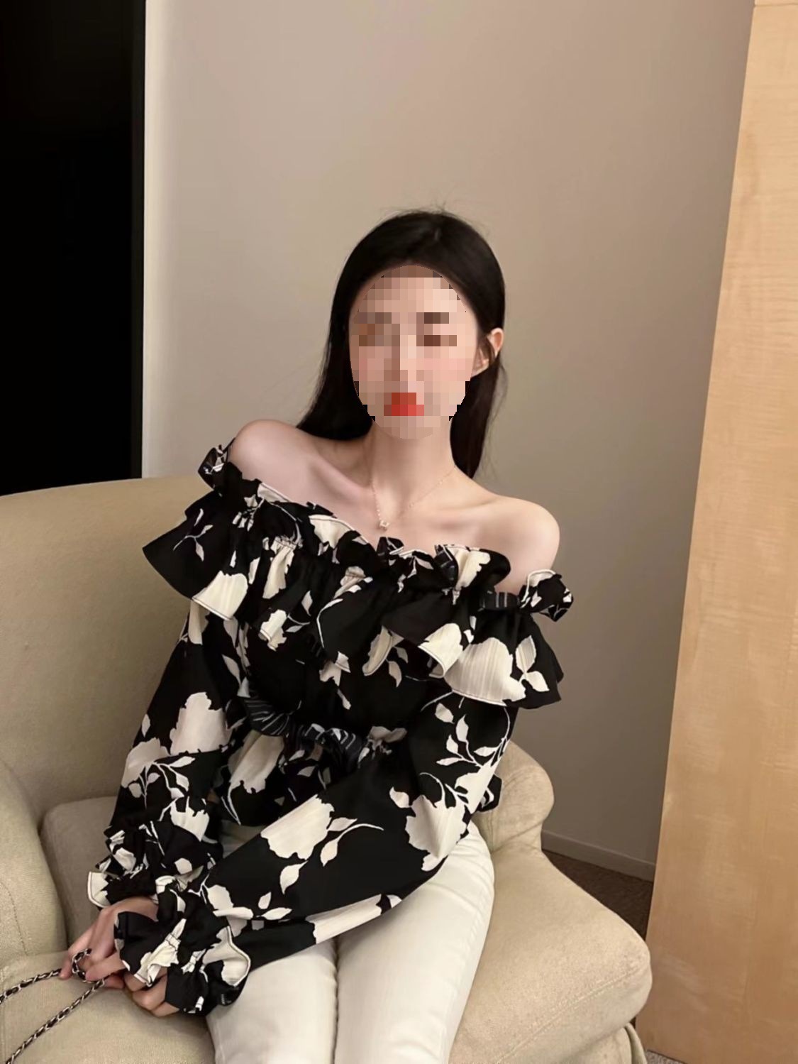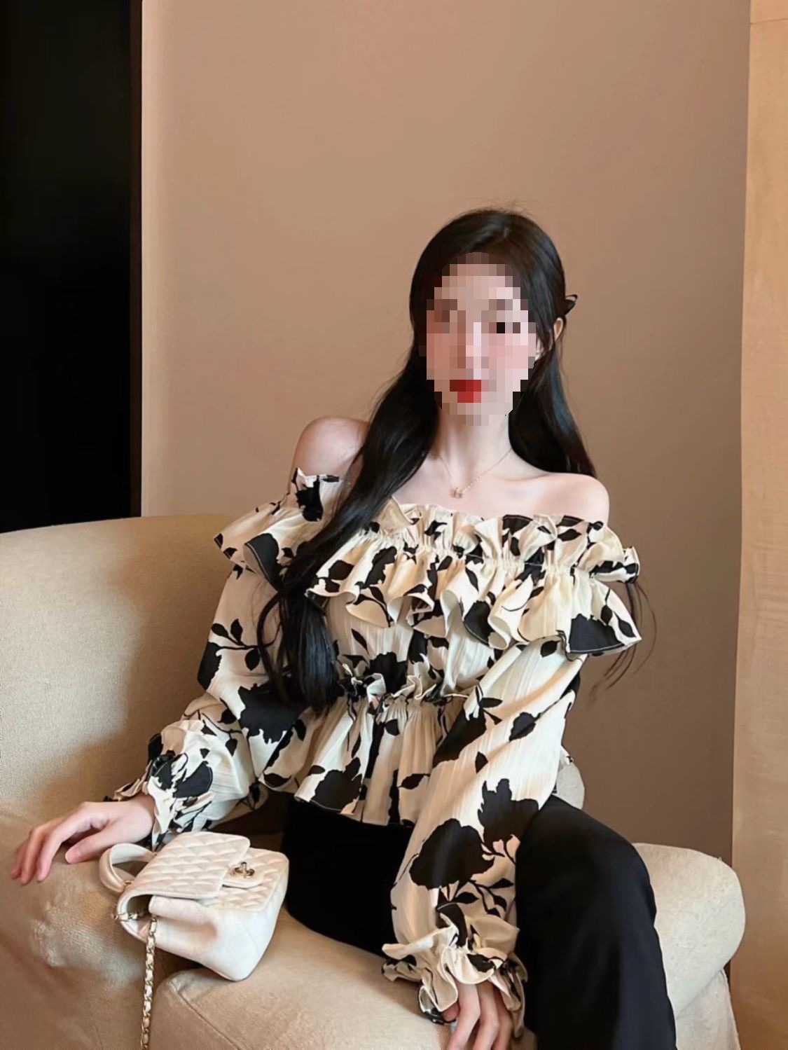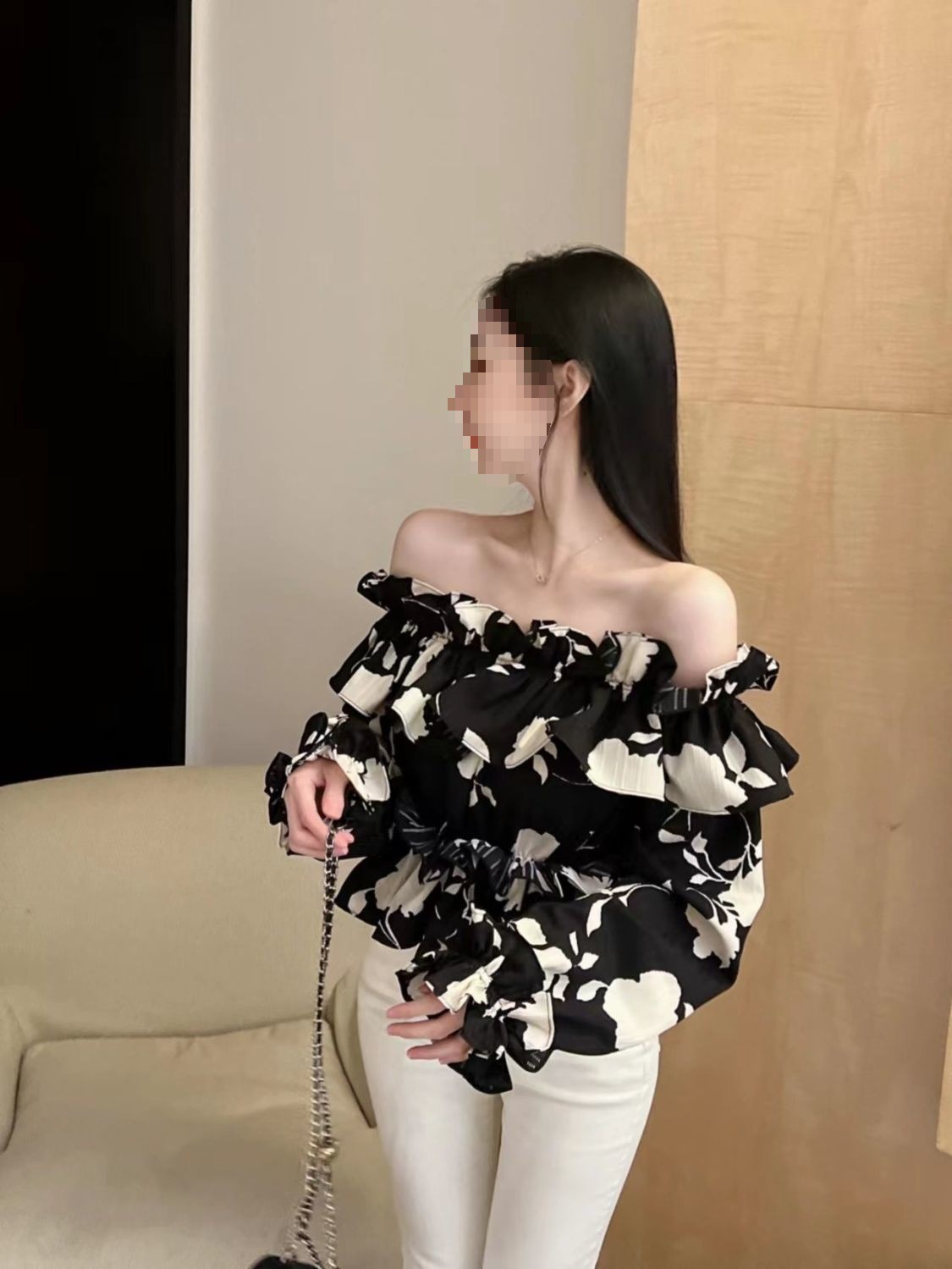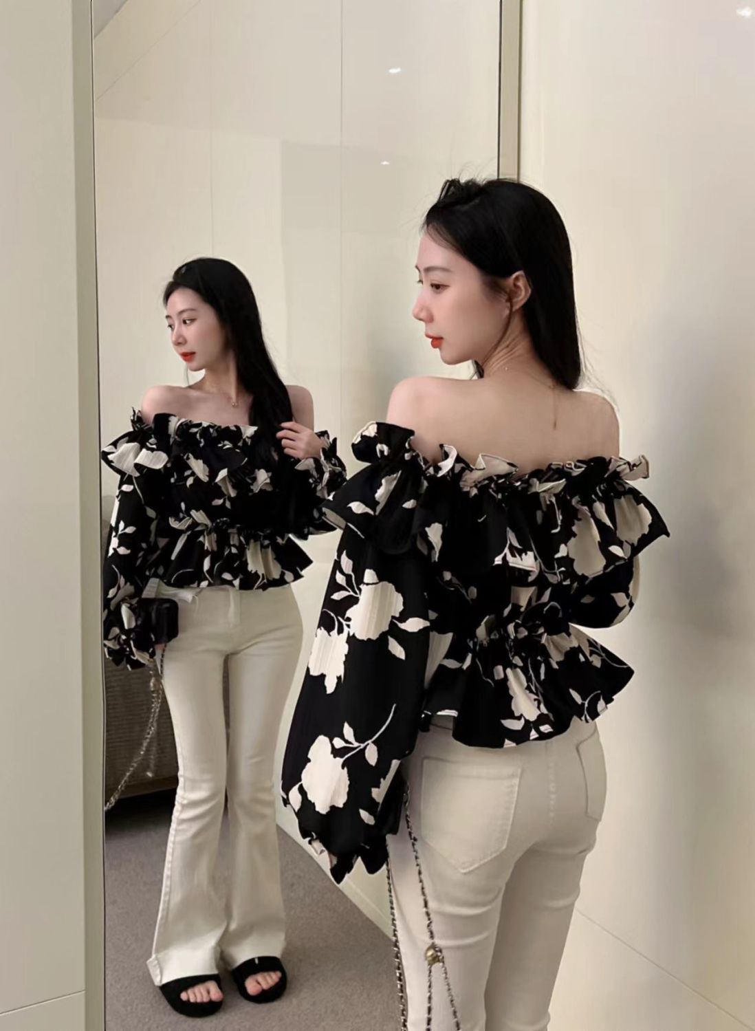 2024 년 가을 새로운 프랑스 스타일 세련된 오프 숄더 탑 인터넷 인기있는 꽃 러플 숄더 올 매치 쉬폰 셔츠스토어 가기