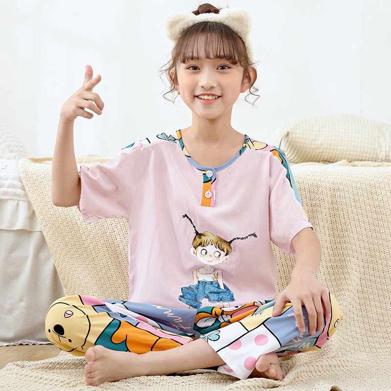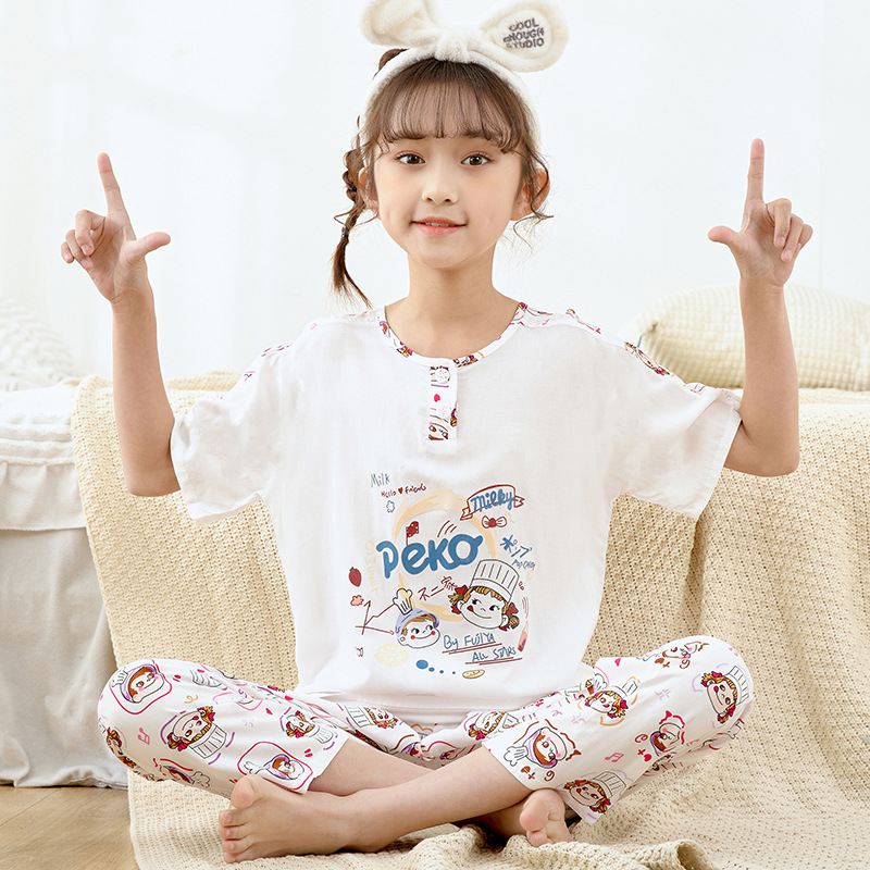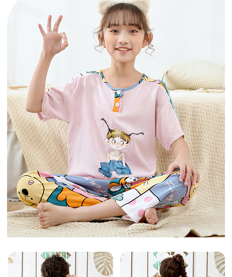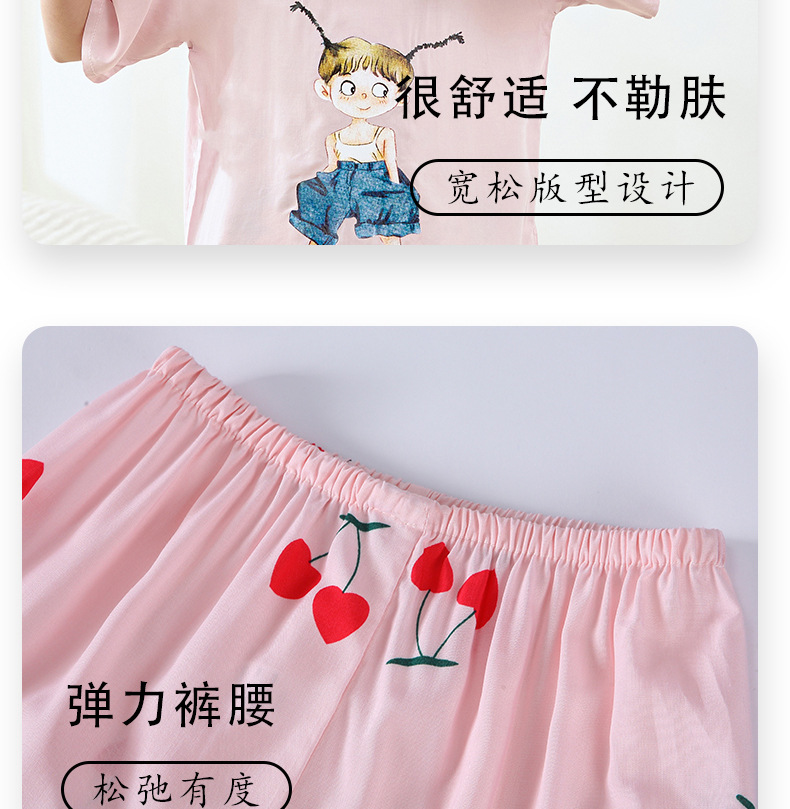 여름 아동면 파자마 짧은 소매 바지면 실크 세트 소년 소녀 에어컨 의류 홈 의류 헤어 세대