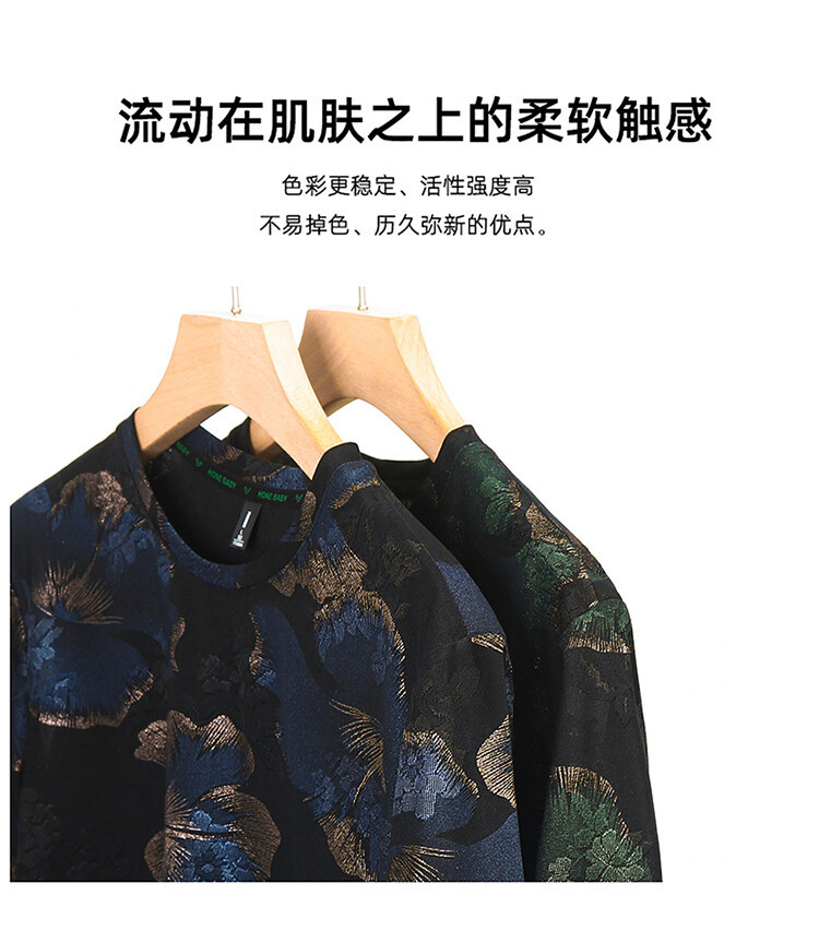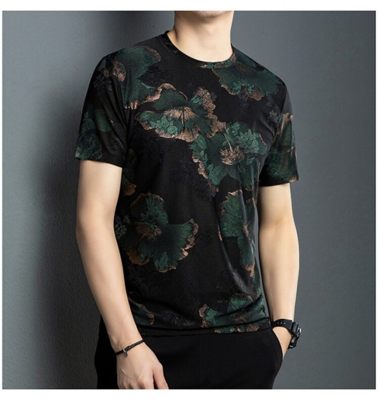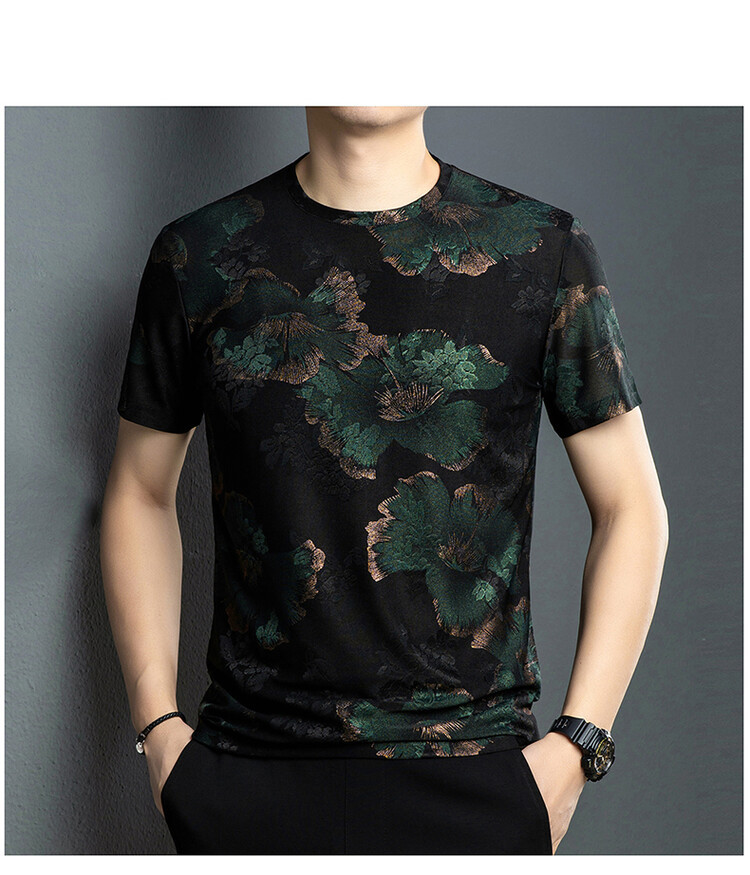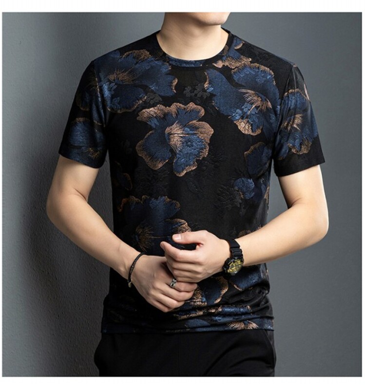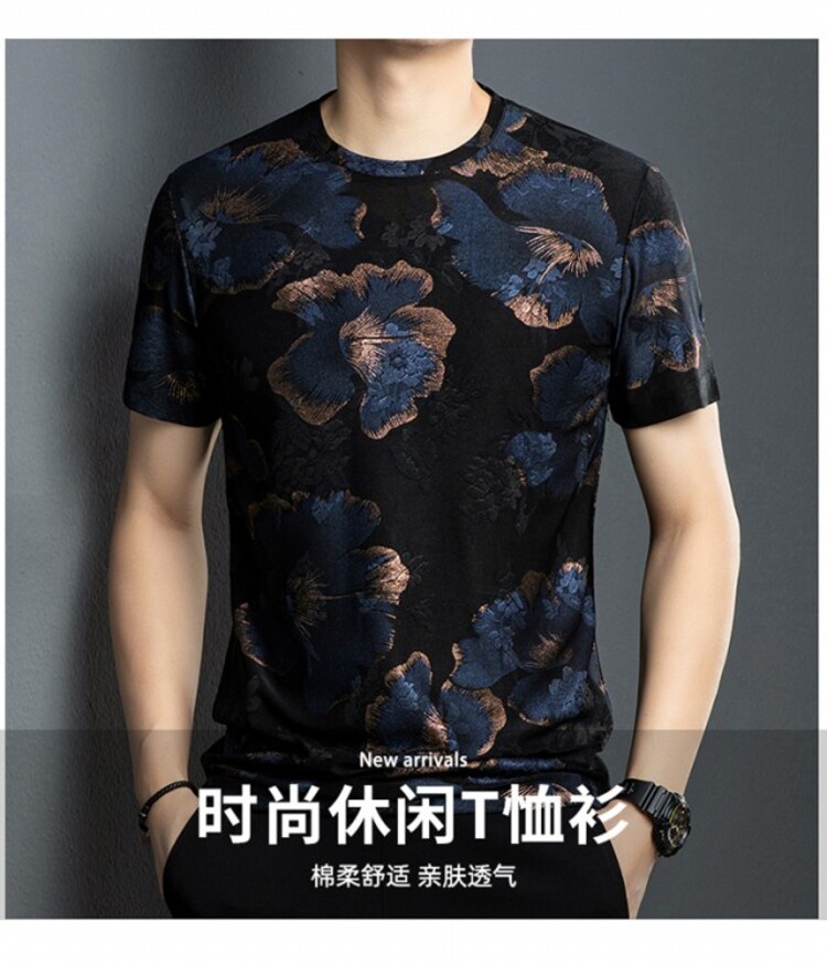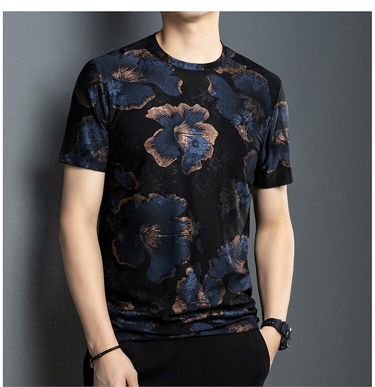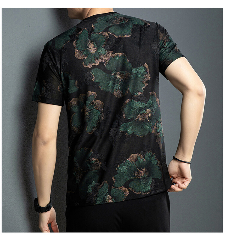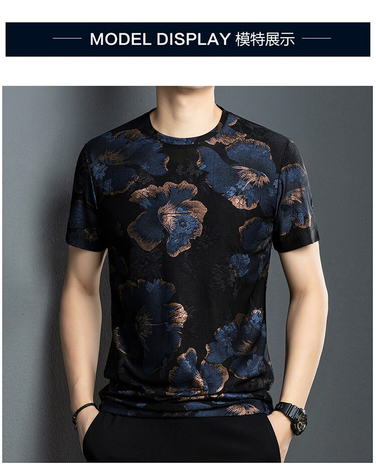 젊고 중년의 둥근 목 3 차원 꽃 하이 엔드 티셔츠 여름 2024 뉴 남성 반팔 아이스 실크 티셔츠베이스 셔츠 남성용스토어 가기