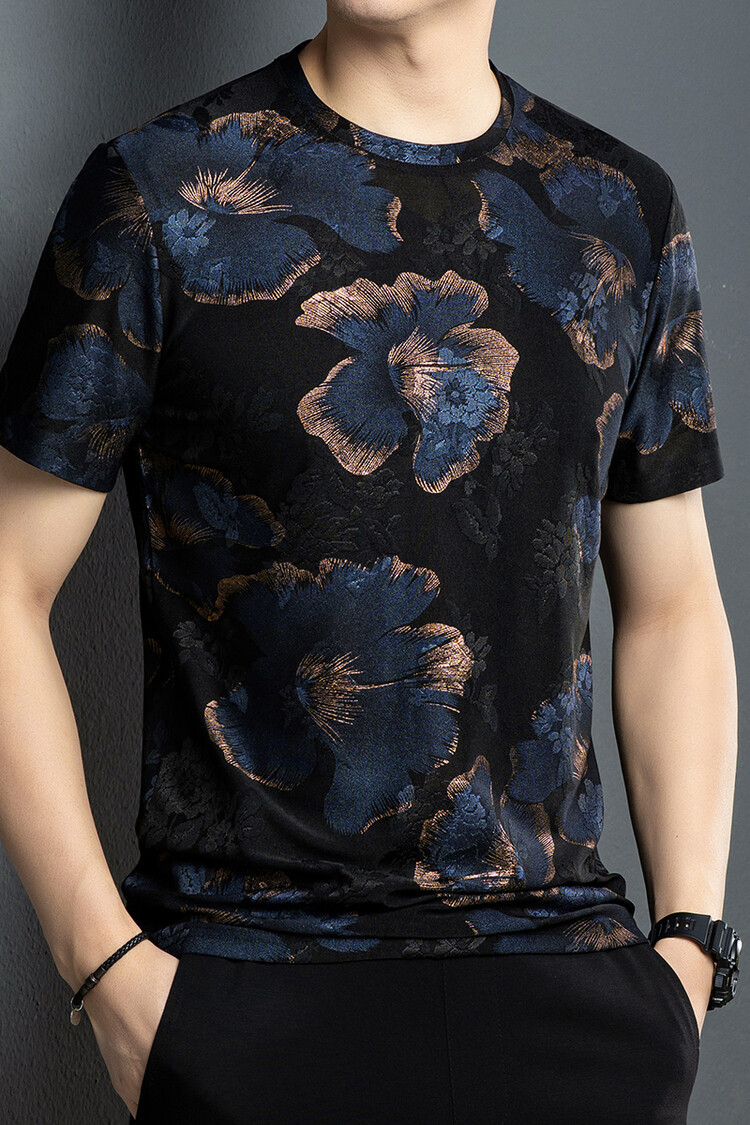 젊고 중년의 둥근 목 3 차원 꽃 하이 엔드 티셔츠 여름 2024 뉴 남성 반팔 아이스 실크 티셔츠베이스 셔츠 남성용