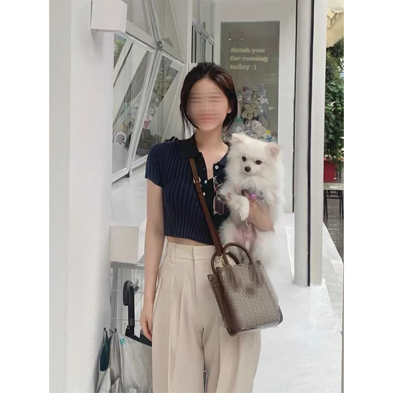 스폿 자오 루시 2024 얇은 옷깃 슬림 니트 짧은 소매 스타 하이 허리 캐주얼 바지 투피스 세트스토어 가기