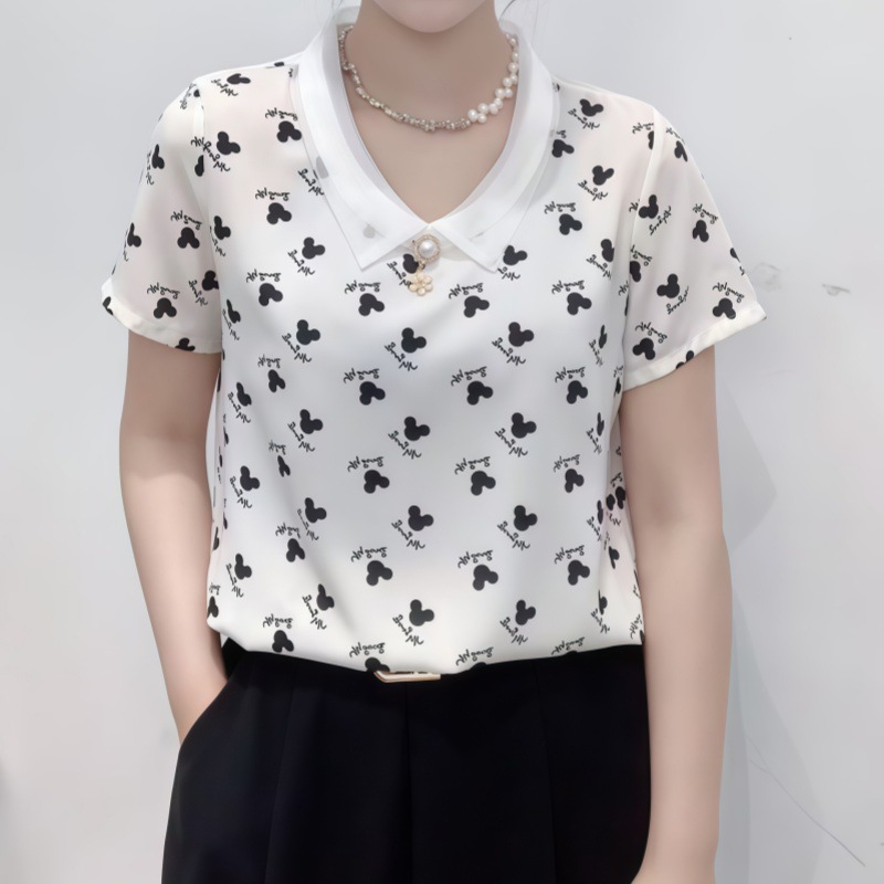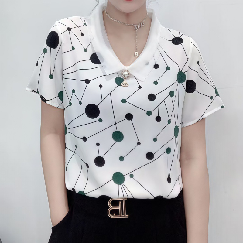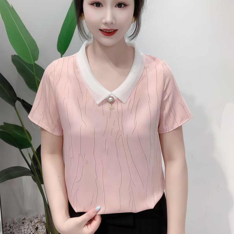 고급 쉬폰 셔츠 폭발 여름 새로운 인형 칼라 에이지 감소 어머니의웨어 슬리밍 벨리 커버 여성용 느슨한 반팔 셔츠
