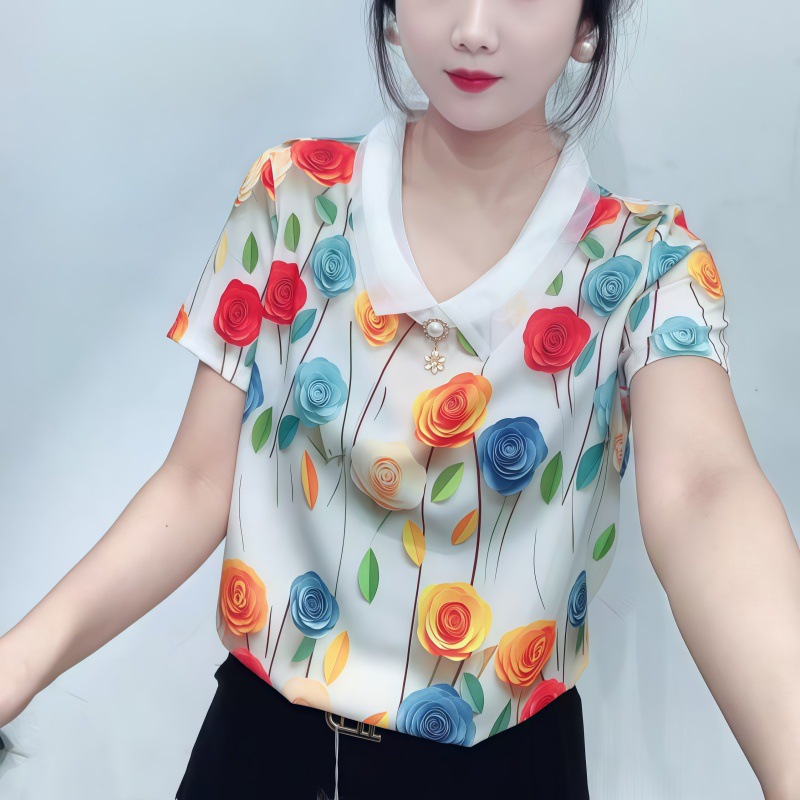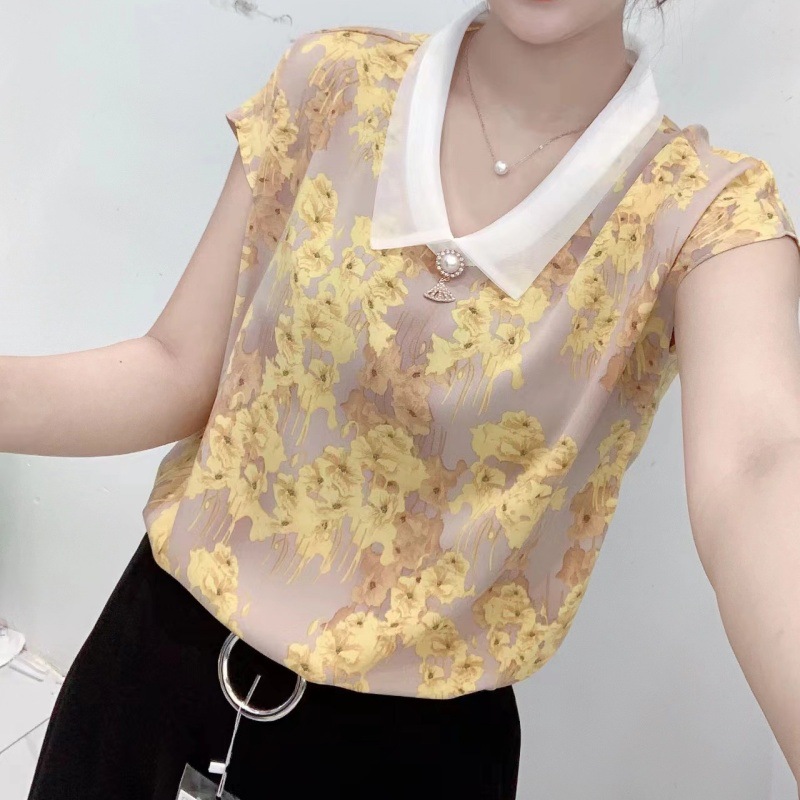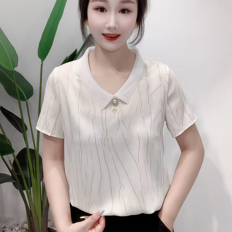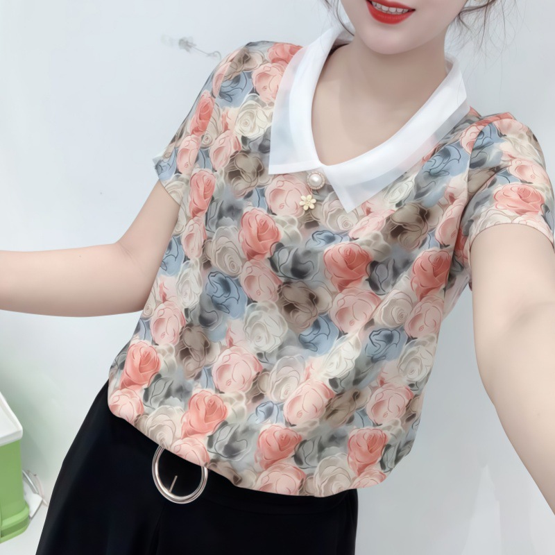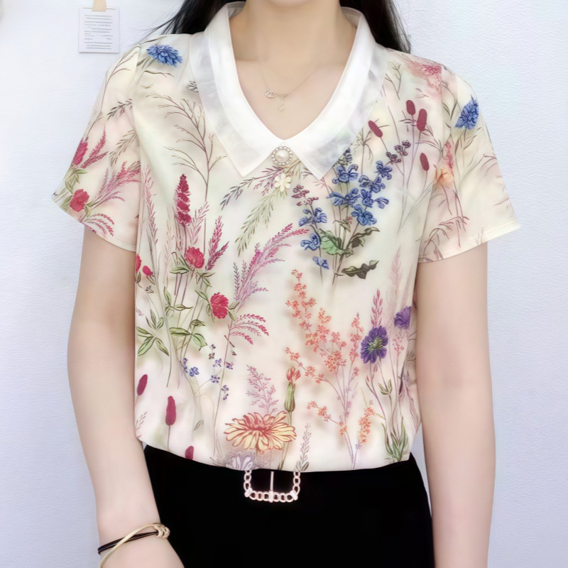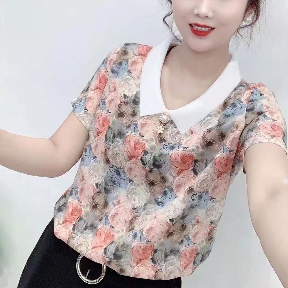 고급 쉬폰 셔츠 폭발 여름 새로운 인형 칼라 에이지 감소 어머니의웨어 슬리밍 벨리 커버 여성용 느슨한 반팔 셔츠스토어 가기