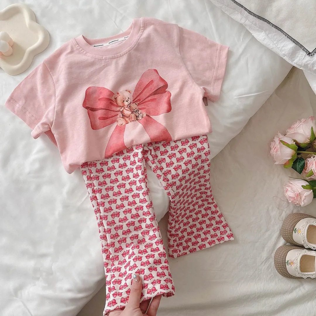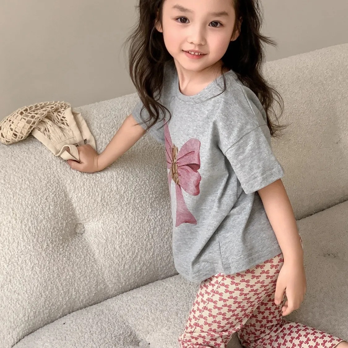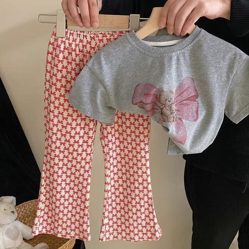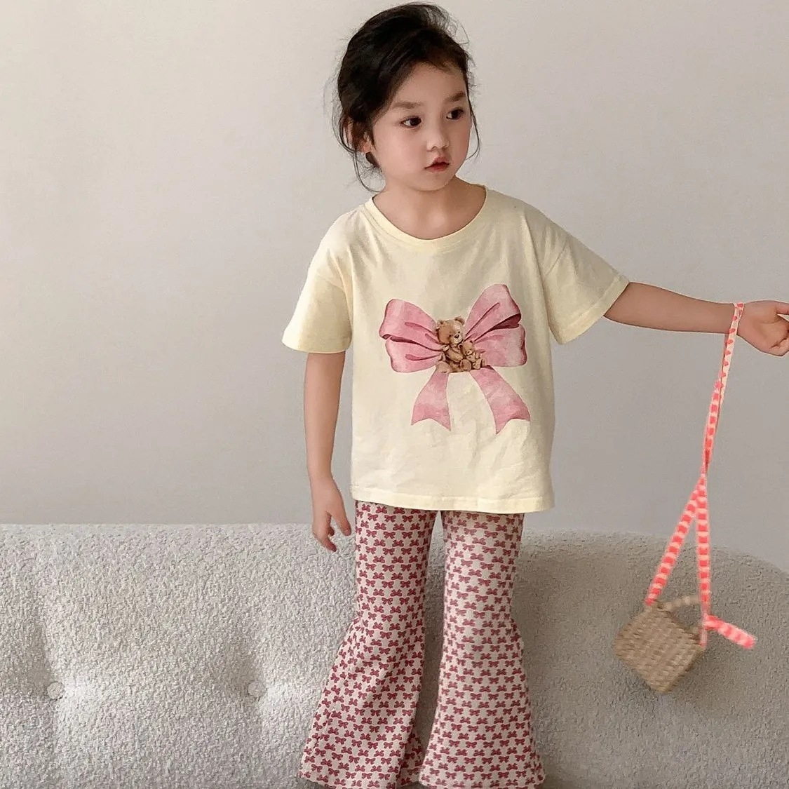 2024 년 여름 새로운 어린이 서양식 세트 소녀 아기 반팔 프린트 티셔츠 트럼펫 바지 투피스
