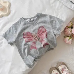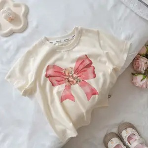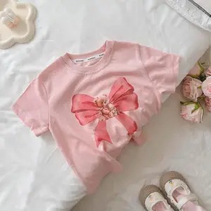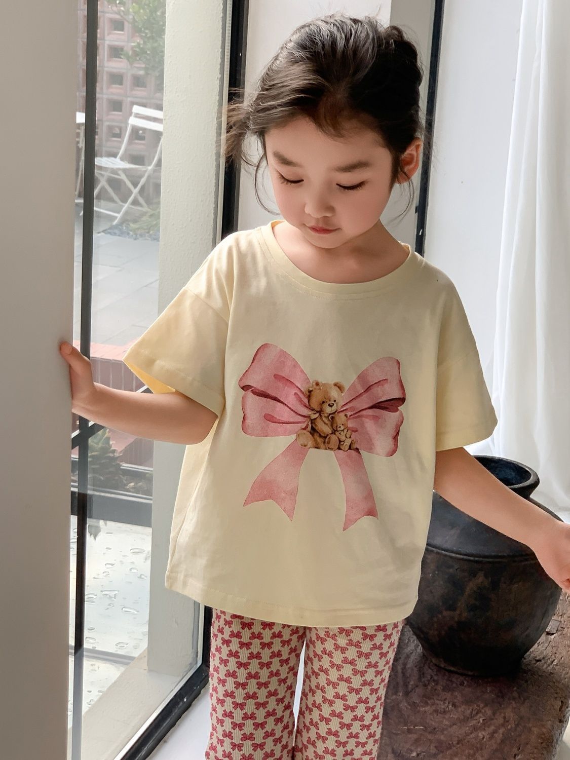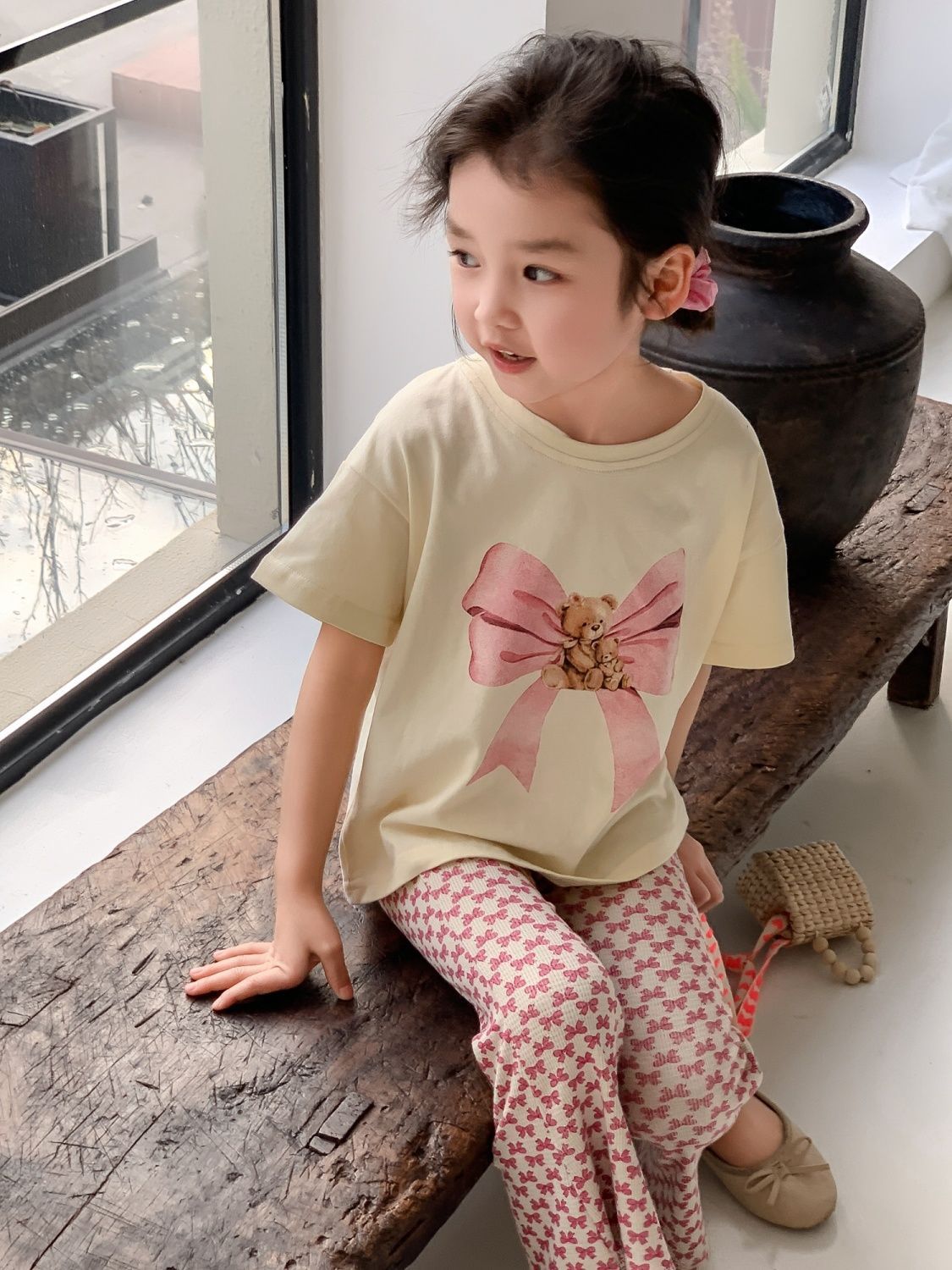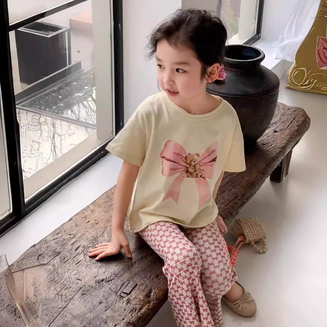2024 년 여름 새로운 어린이 서양식 세트 소녀 아기 반팔 프린트 티셔츠 트럼펫 바지 투피스