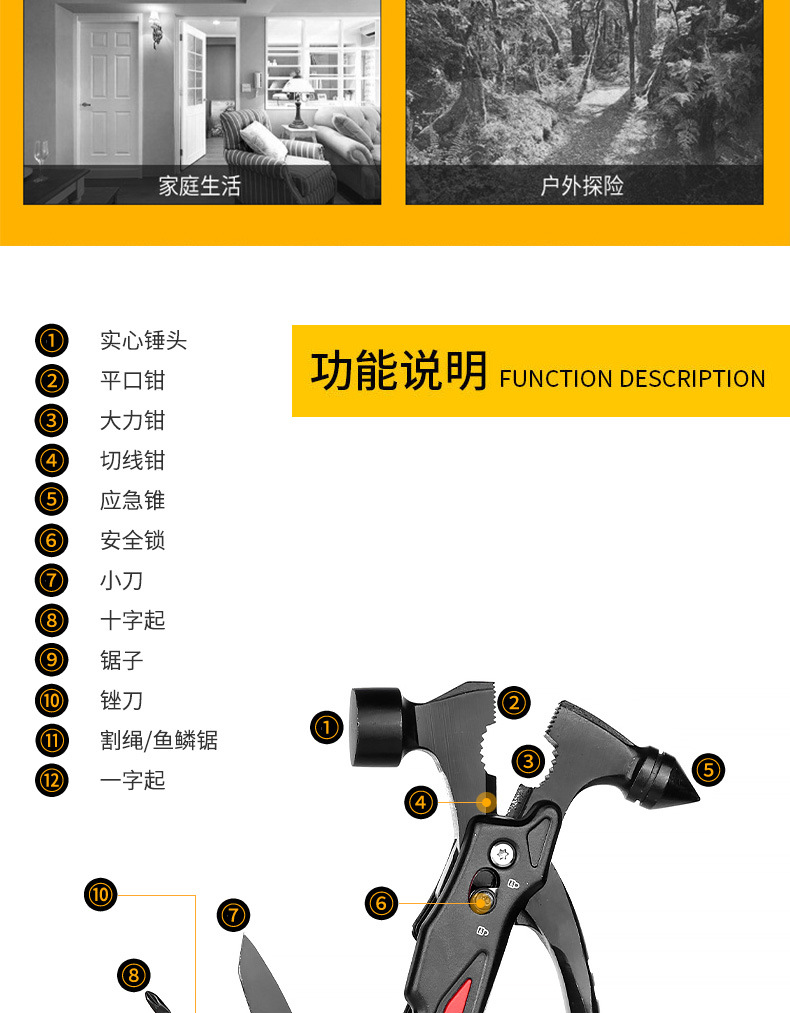 다기능 구명 해머 펜치 자동차 칼 깨진 창 절단 로프 야외 캠핑과 망치 홈 유지 보수 조합 도구스토어 가기