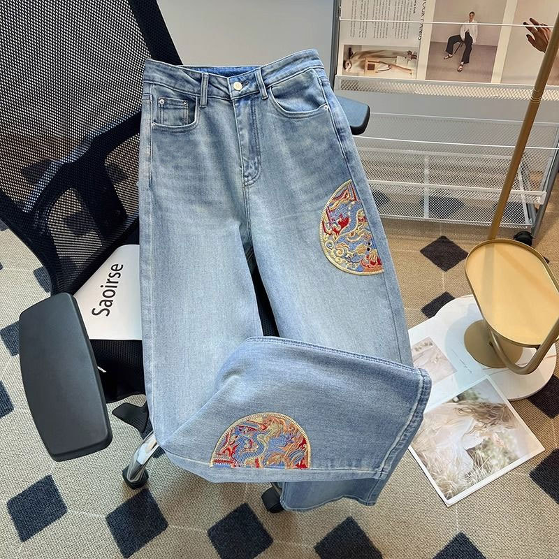 자수 디자인 센스 청바지 여성용 외부 착용 유행 높은 허리 느슨한 스트레이트 새로운 중국 스타일 바지스토어 가기