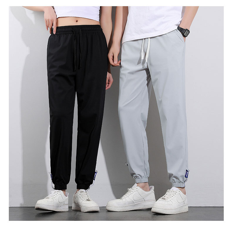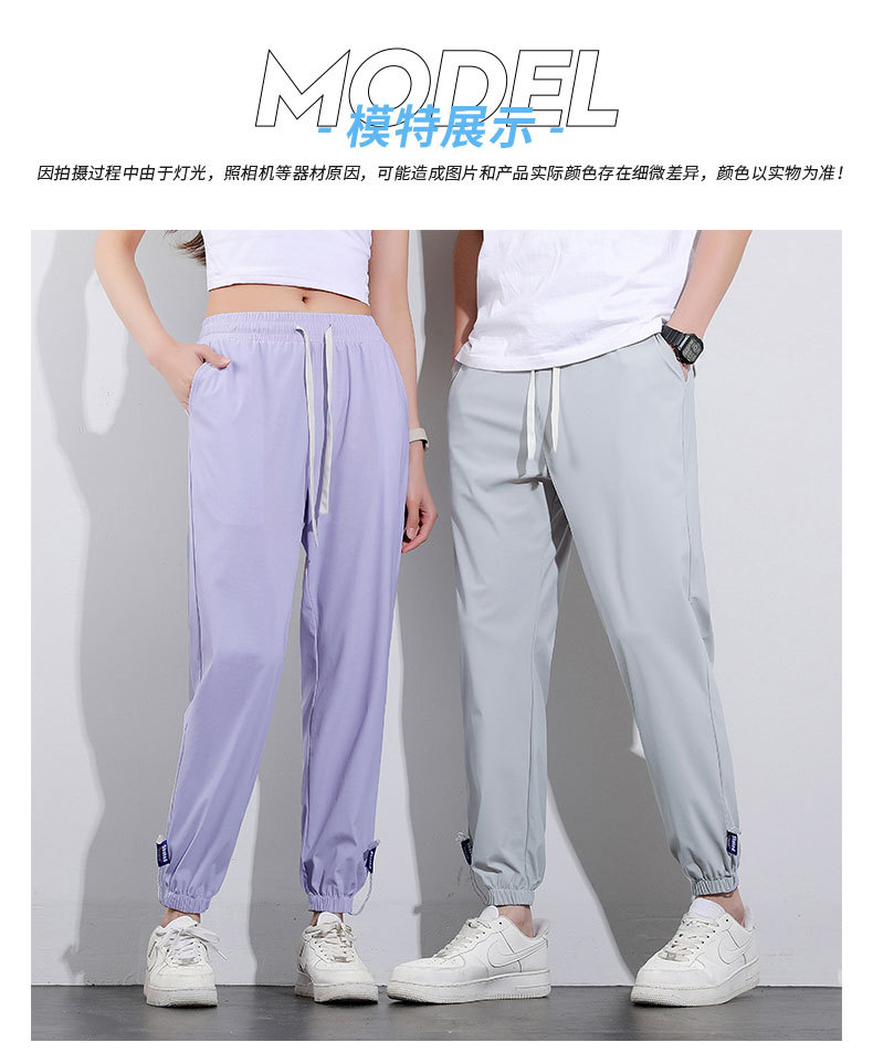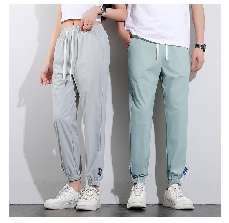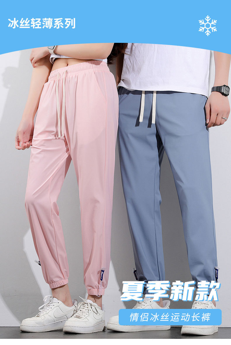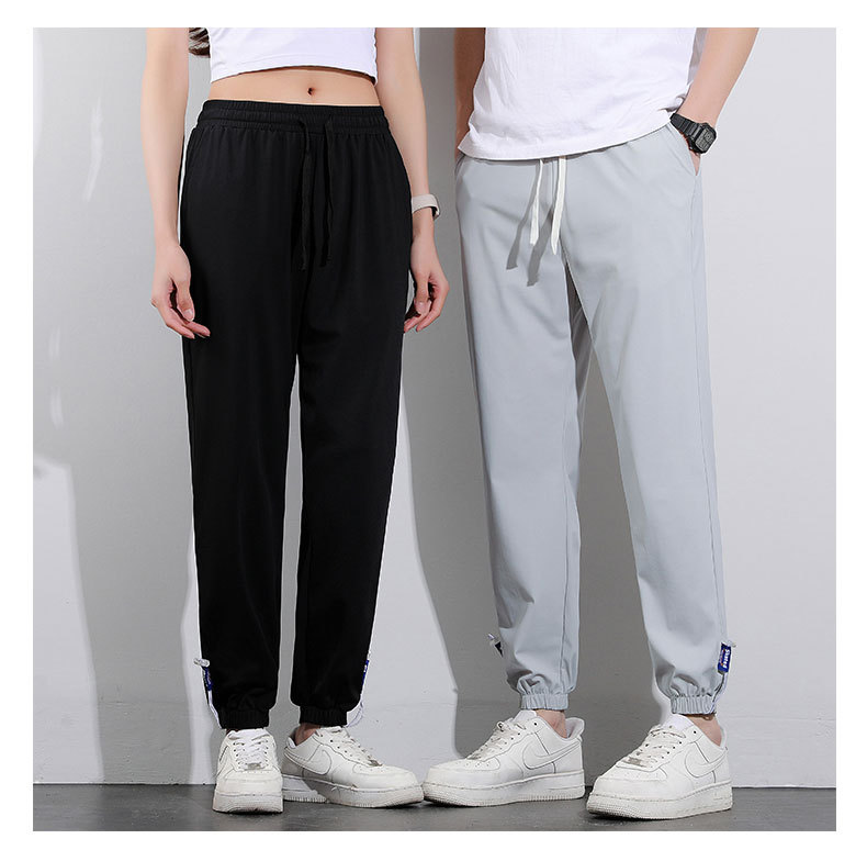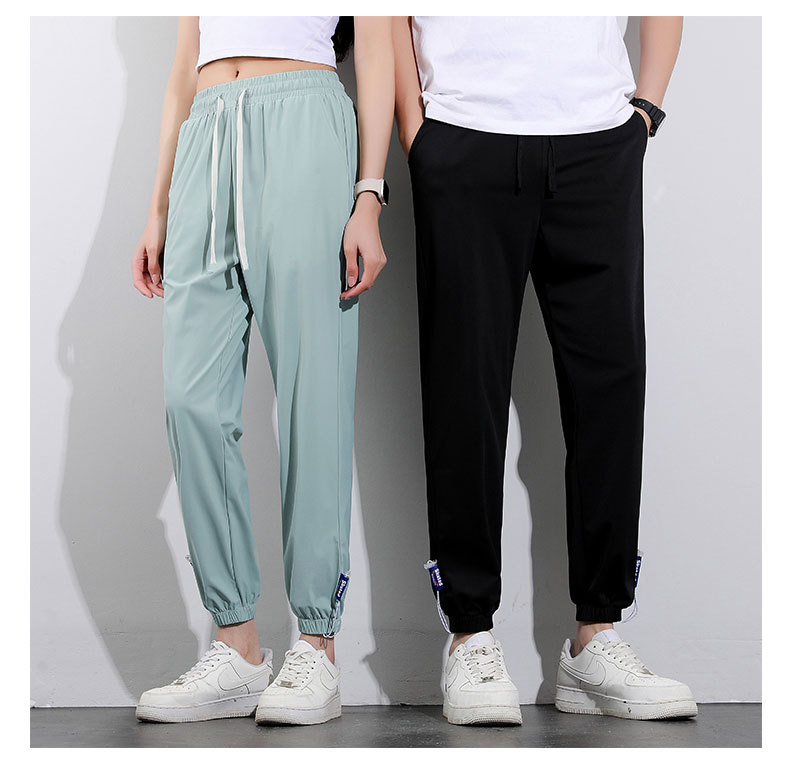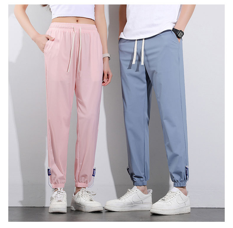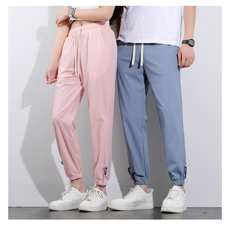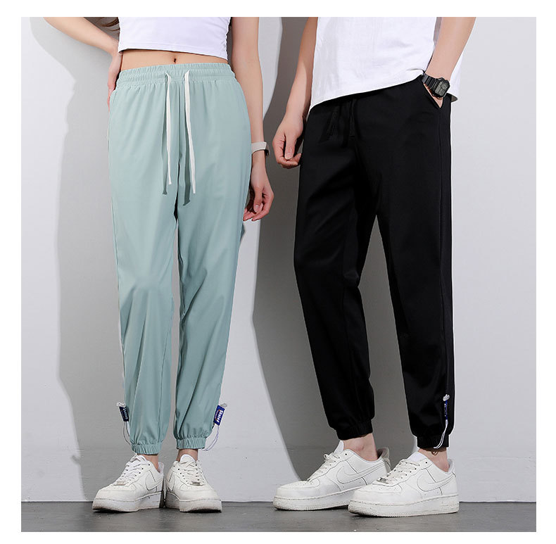 여름 커플의 아이스 실크 바지 얇은 스포츠 캐주얼 바지 남자 9 점 빠른 건조 스트레치 통기성 여성의 트레이드리스 바지