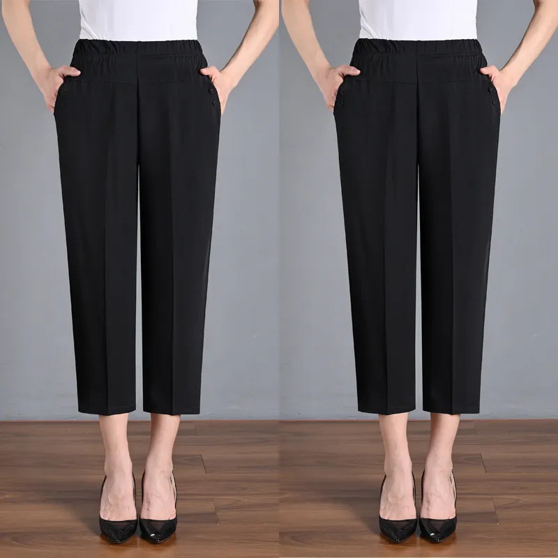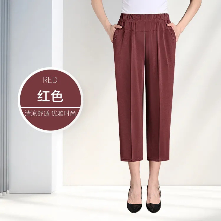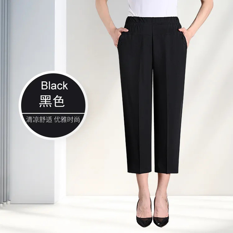 중년 및 노인 여성 바지 아이스 실크 아우터 바지 여름 얇은 어머니와 할머니 느슨한 대형 8 점 스트레이트 바지