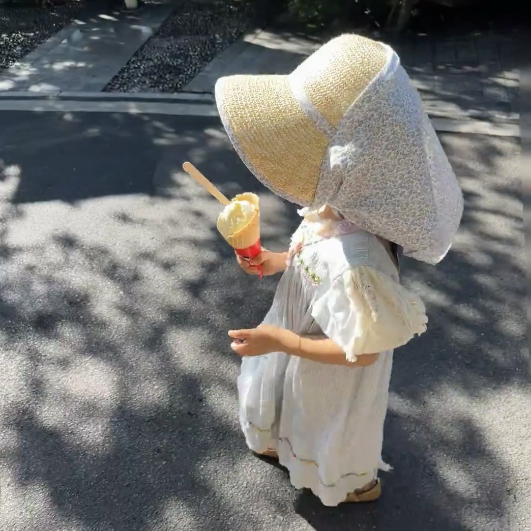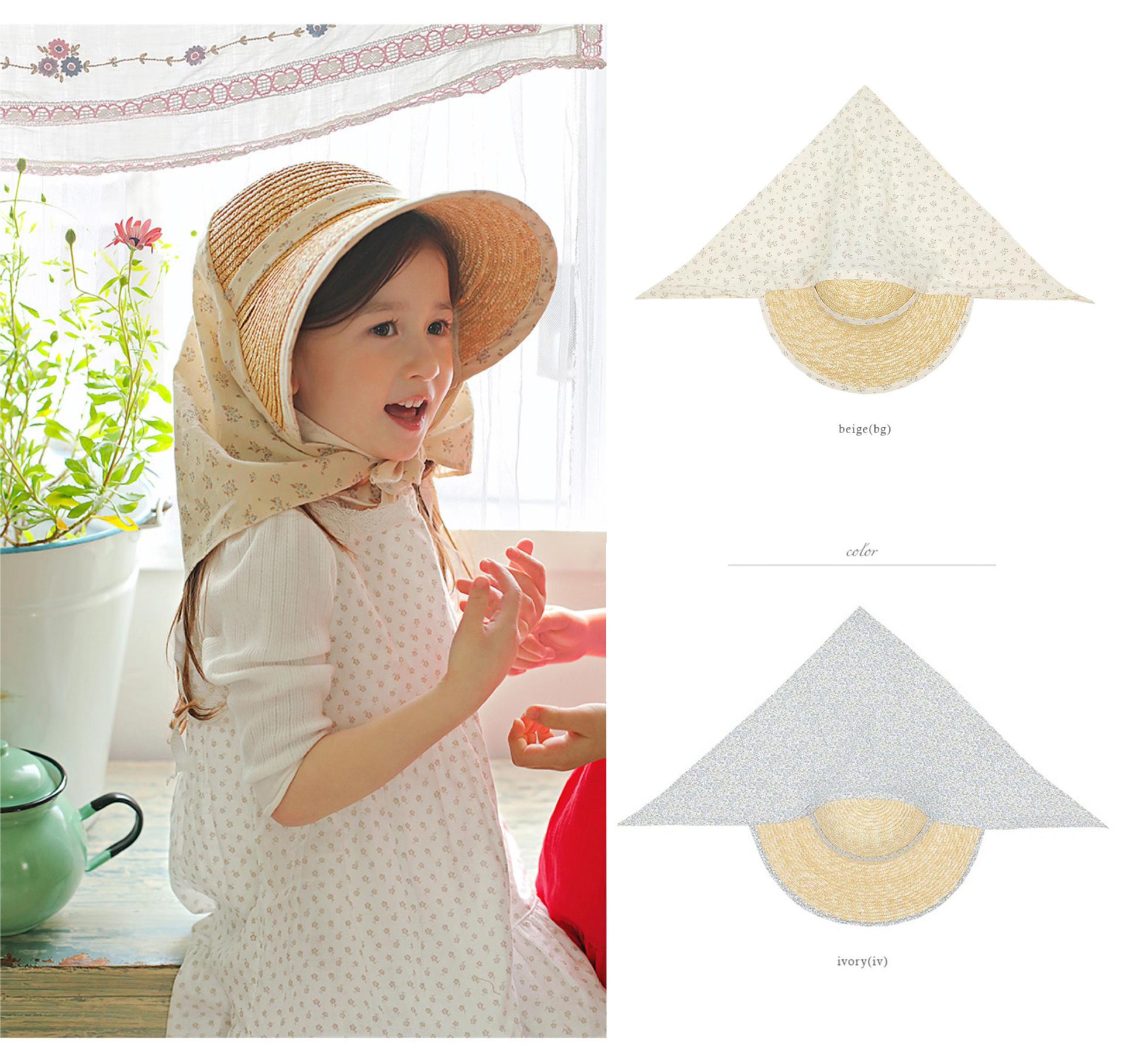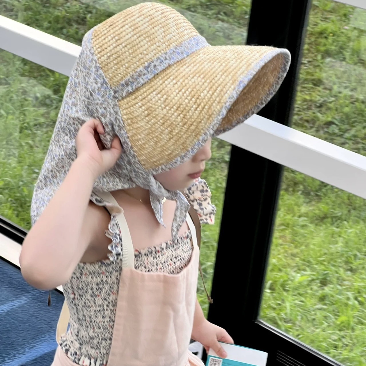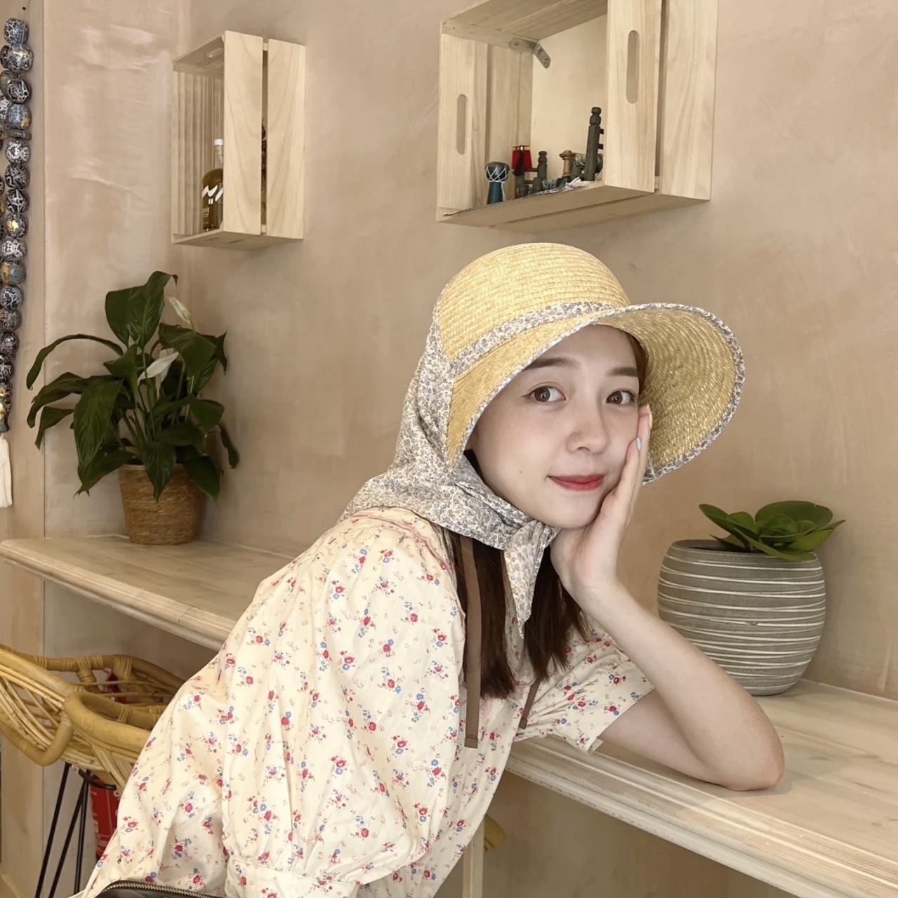大帽檐 ,帽子后半部份像头巾一样的纯棉碎花面料,可以有效保护脖子和侧脸。系带调节帽型包容性非常大,可以和妈妈亲子哦!超级出片呢