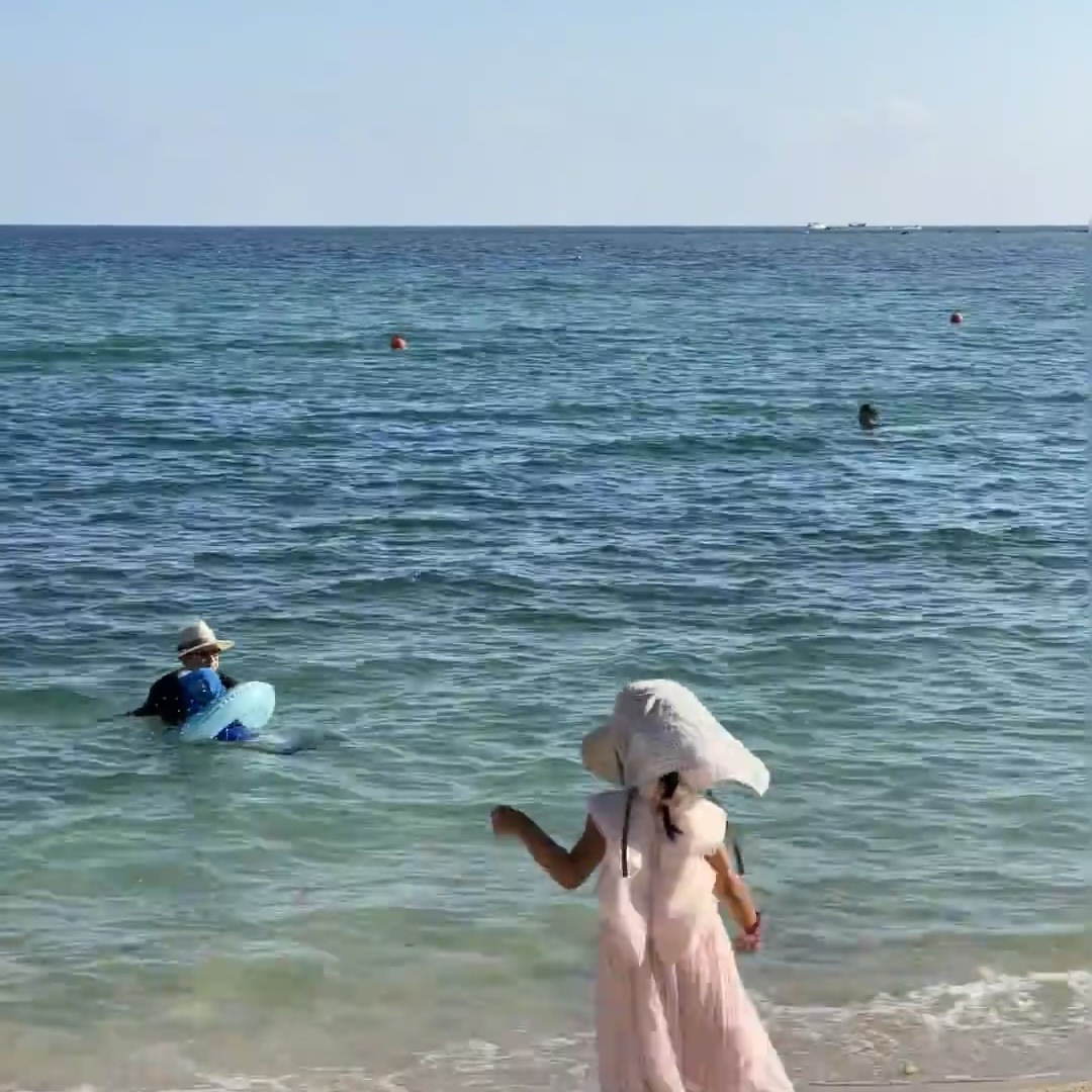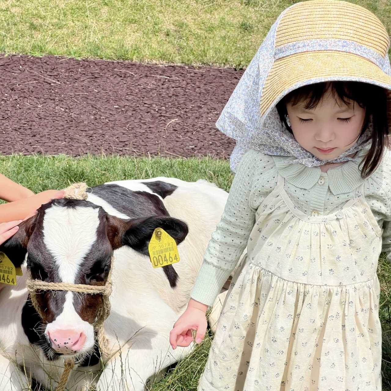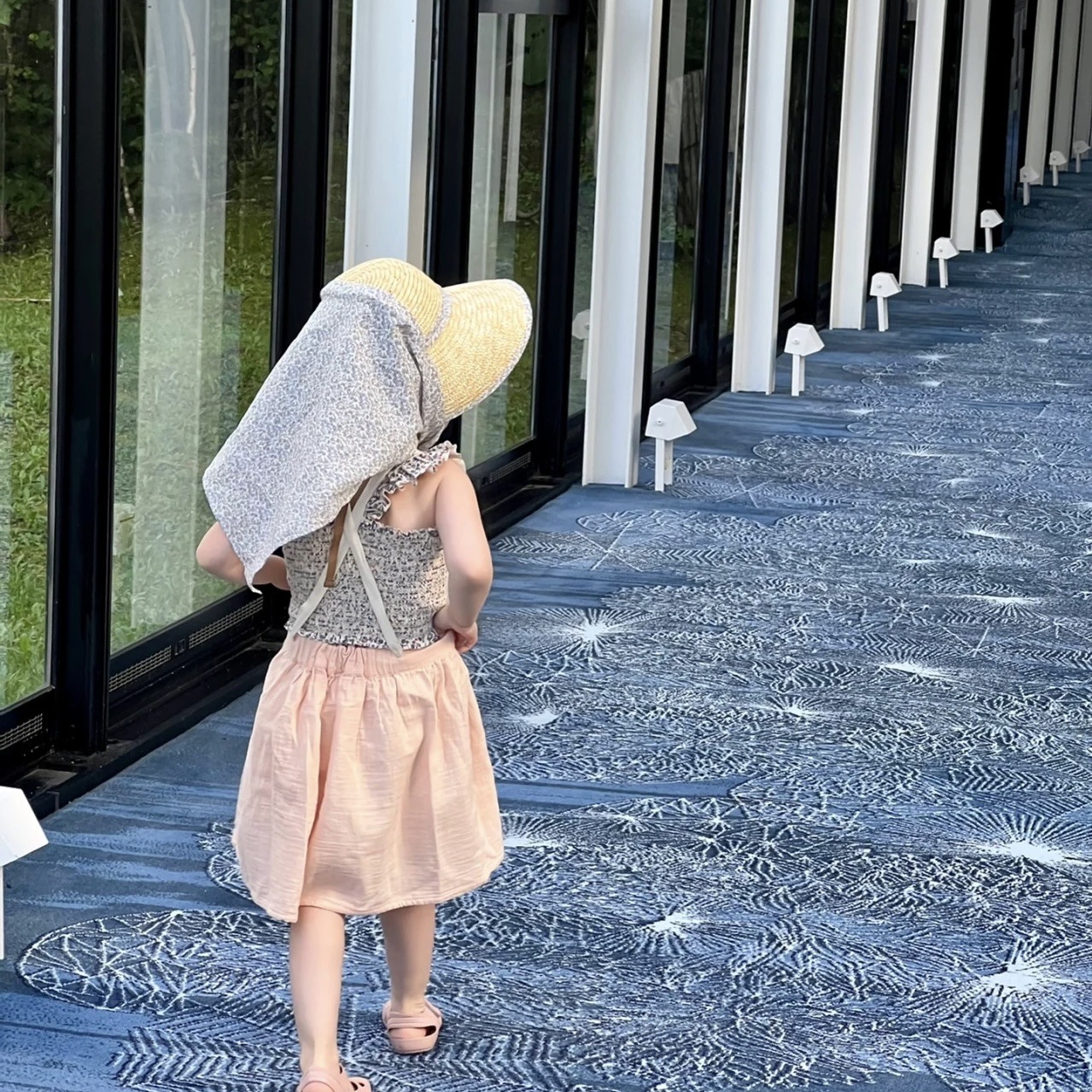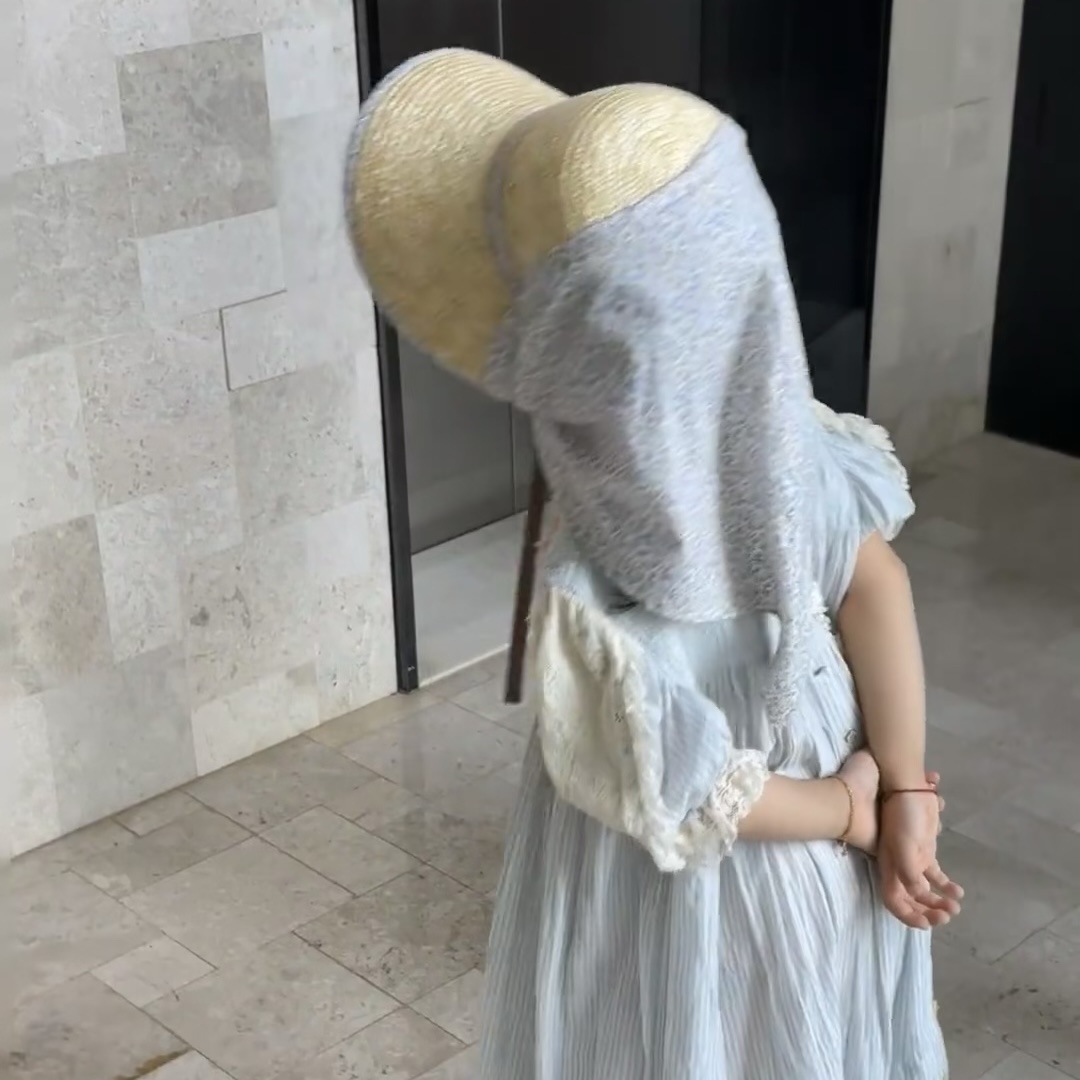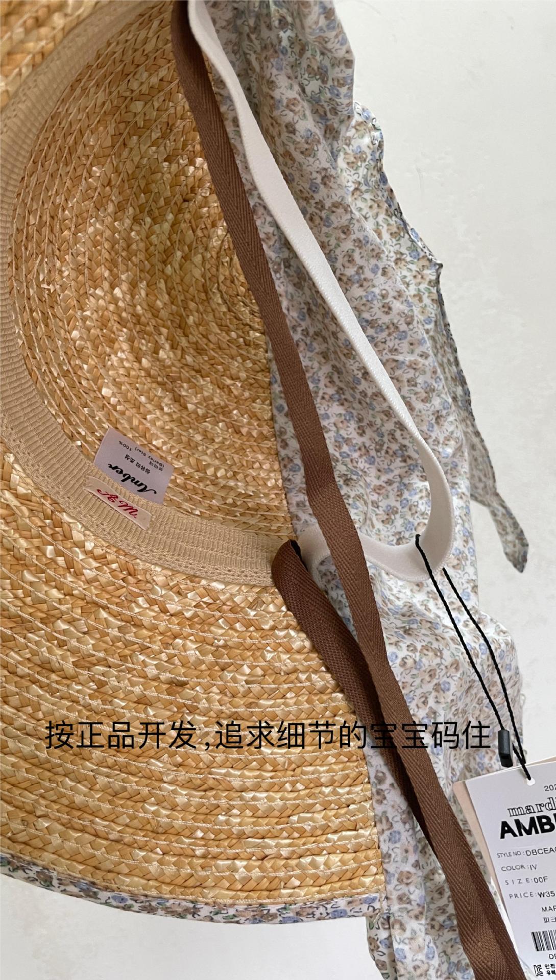 大帽檐 ,帽子后半部份像头巾一样的纯棉碎花面料,可以有效保护脖子和侧脸。系带调节帽型包容性非常大,可以和妈妈亲子哦!超级出片呢