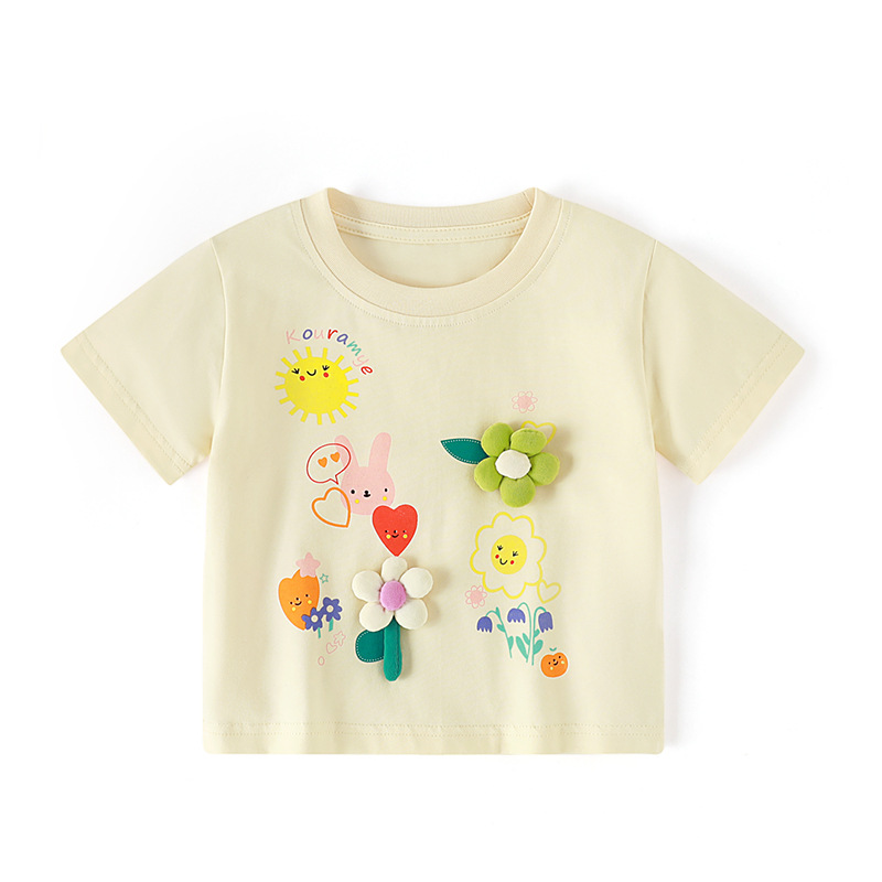 여름 여자 티셔츠 반팔 클래스 코튼 뉴 스타일 여자 한국 스타일 입체 꽃 티셔츠 통기성 라운드 넥 탑 어린이 티셔츠스토어 가기