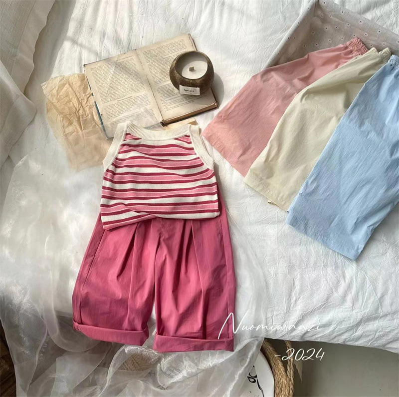 Tongxingyuan 어린이 줄무늬 조끼 2024 여름 소녀의 한국 스타일 컬러 스트라이프 민소매 티셔츠 캐주얼 바지 세트 트렌디스토어 가기