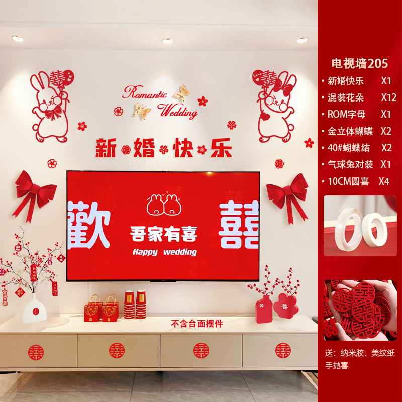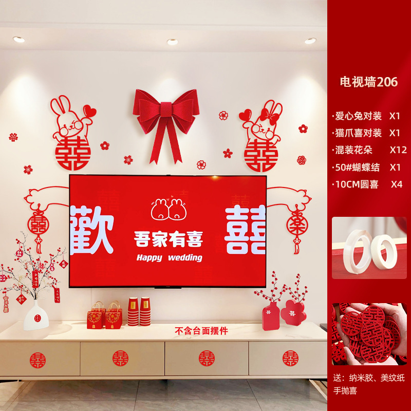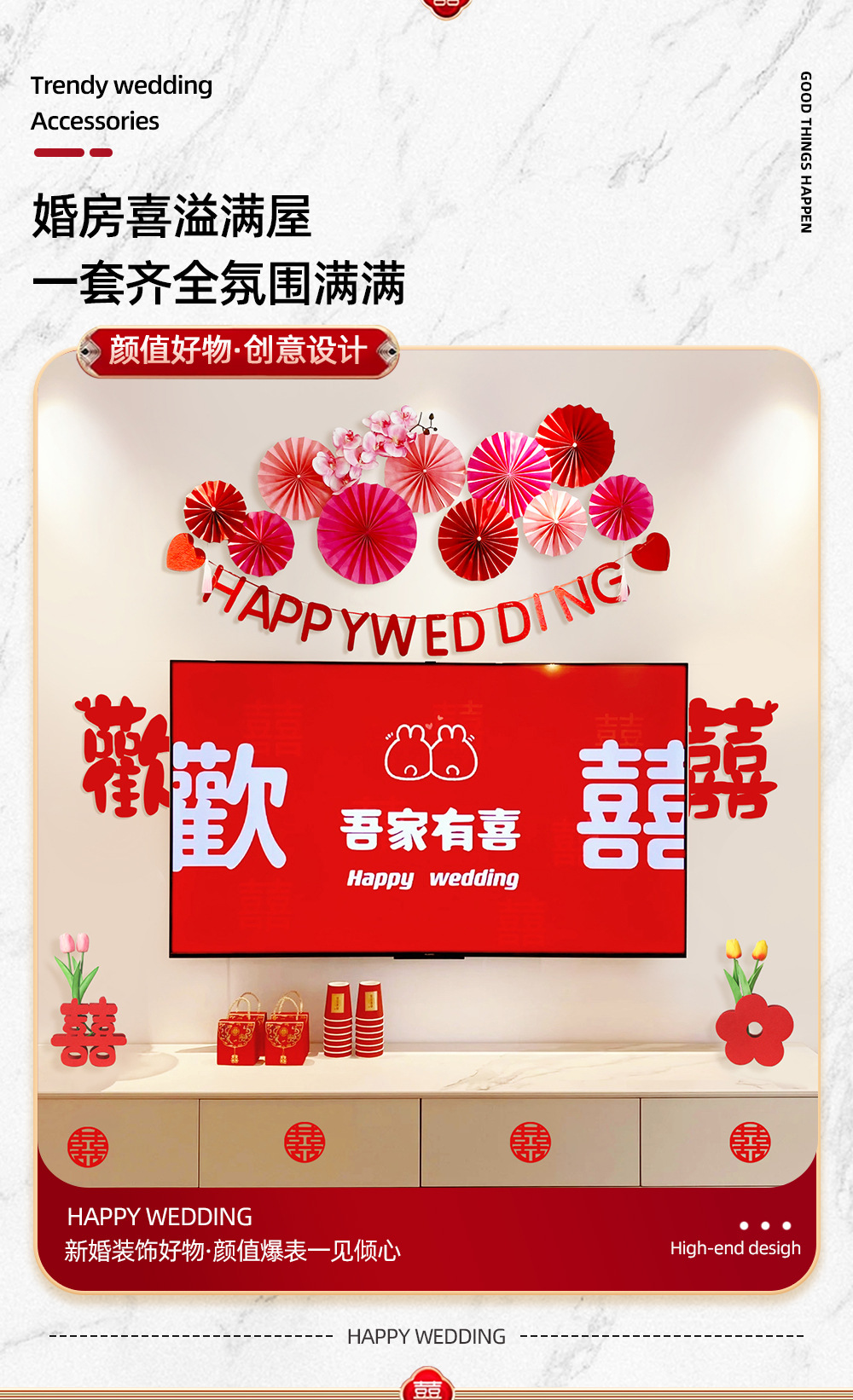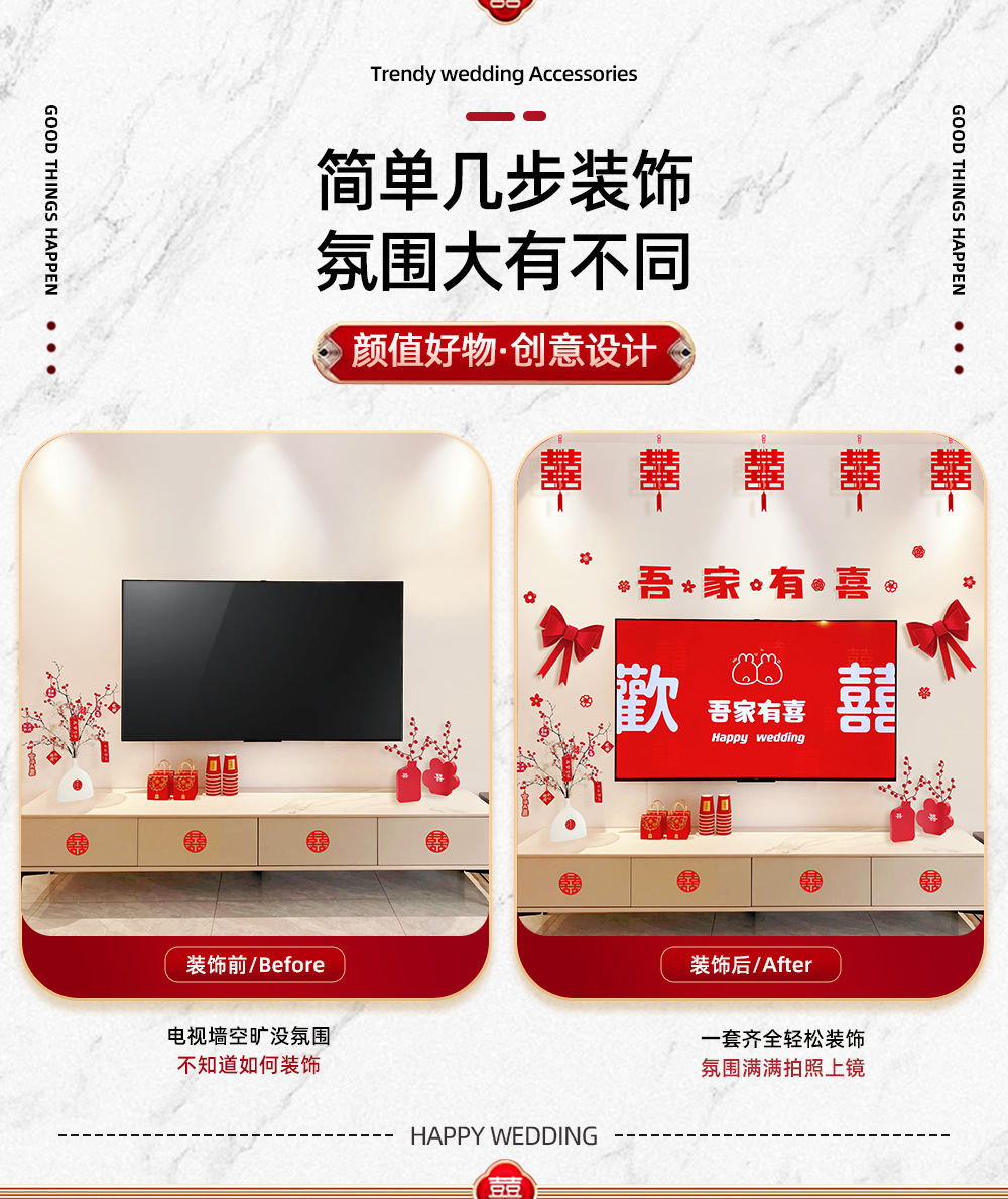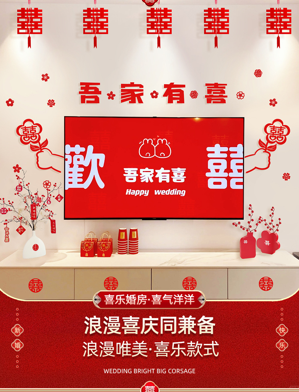 결혼식 TV 배경 벽 장식, '행복' 글자 스티커 세트, 신랑 신부 새집, 웨딩룸, 침실 장식 용품