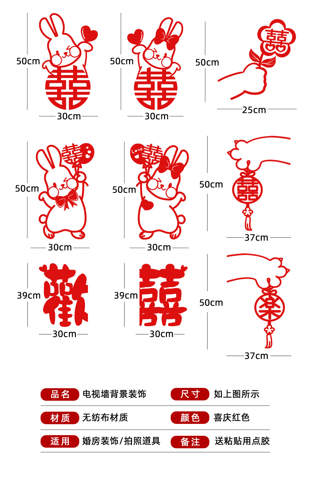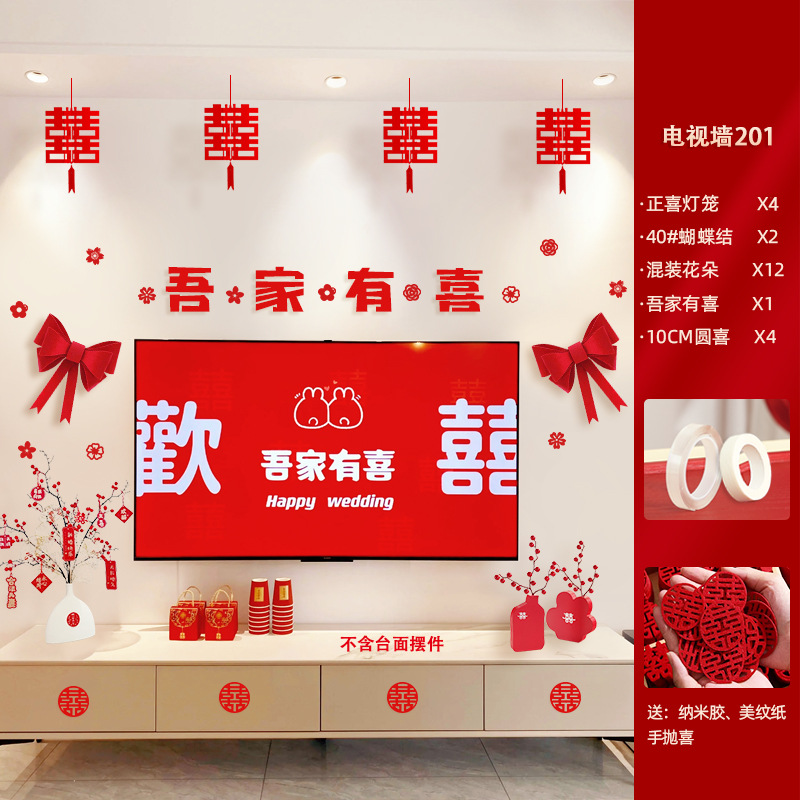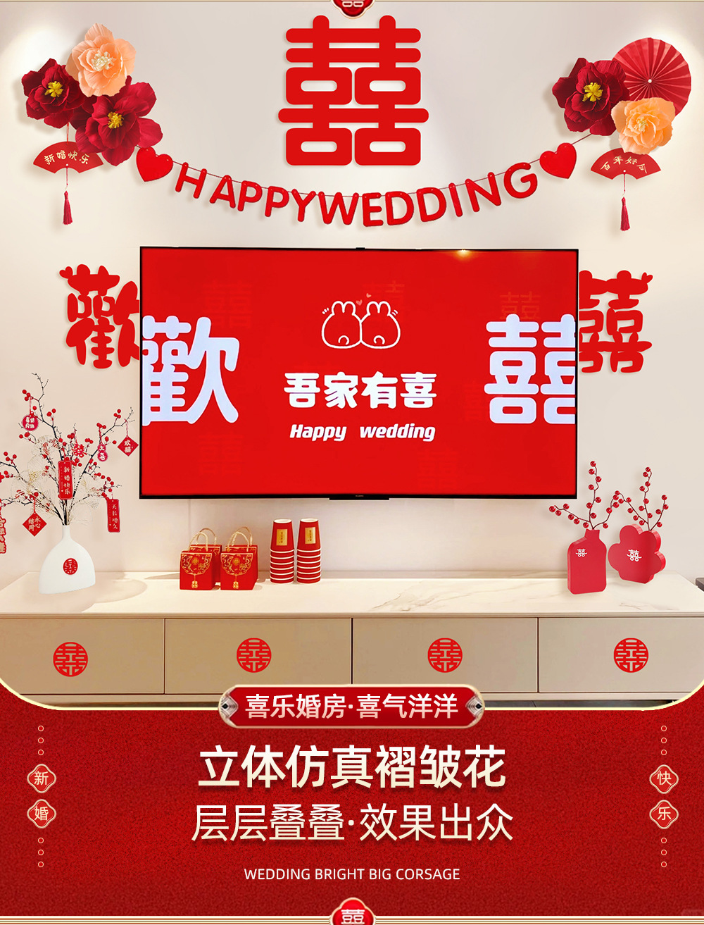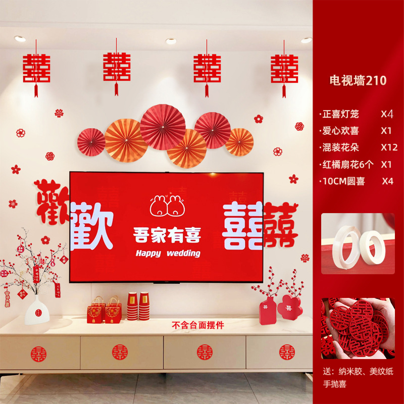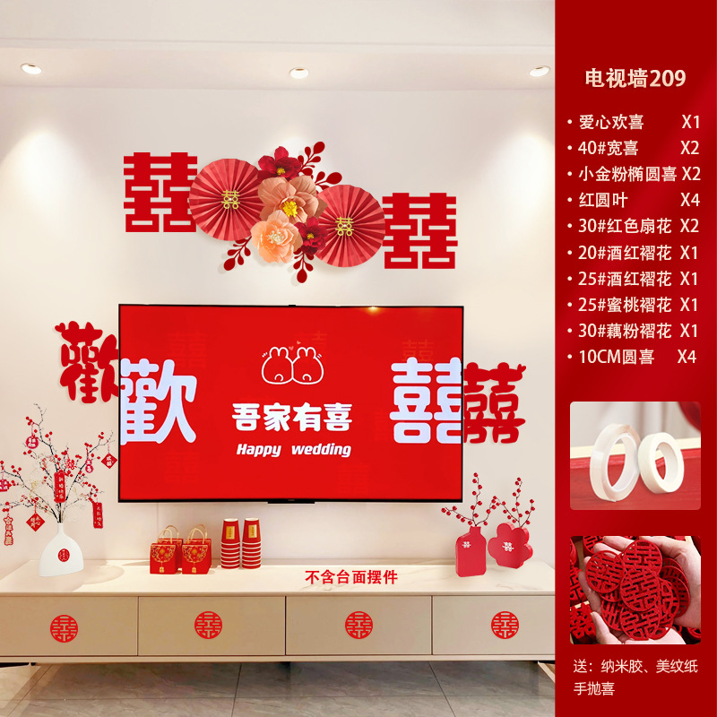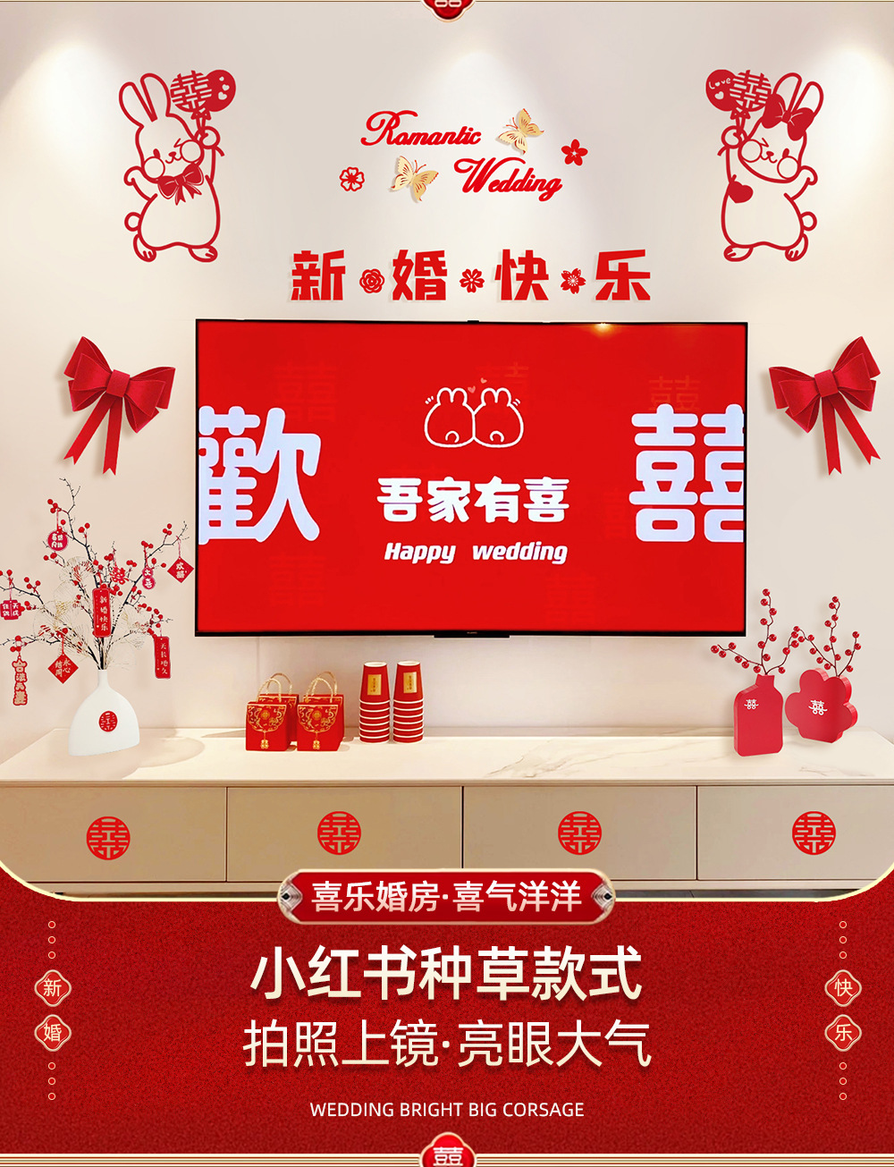 결혼식 TV 배경 벽 장식, '행복' 글자 스티커 세트, 신랑 신부 새집, 웨딩룸, 침실 장식 용품