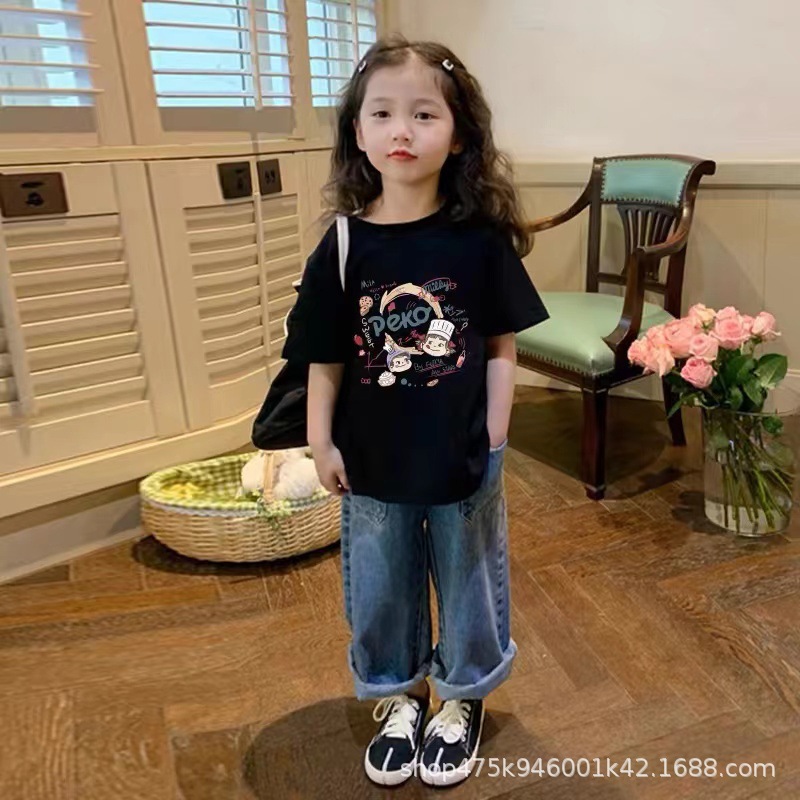 노어 인쇄 반팔 티셔츠 2024 봄과 여름 새로운 도착 여성 흑면 어린이 소녀 반소매 탑