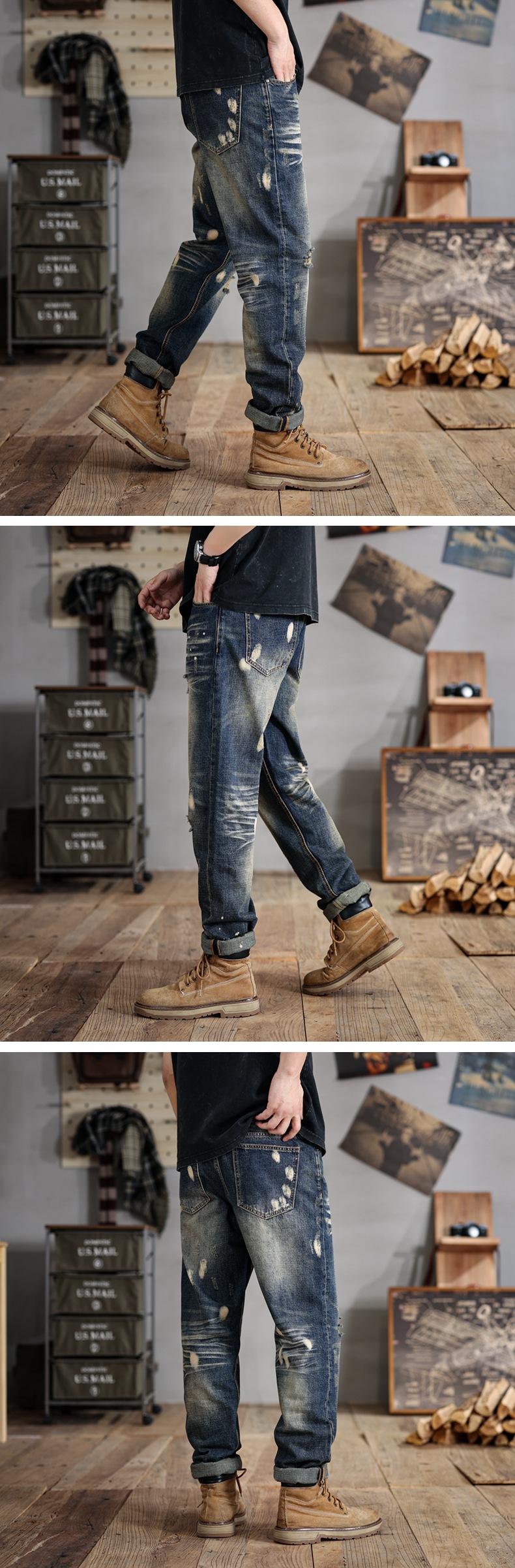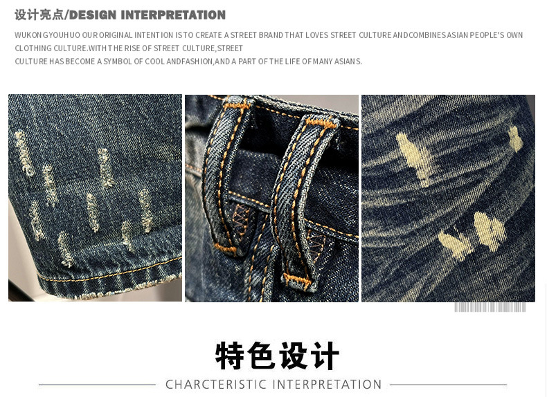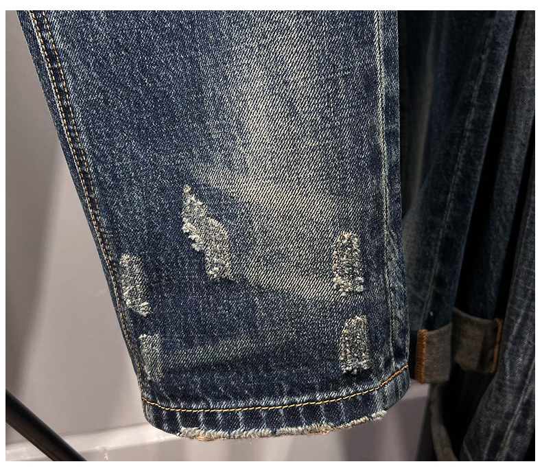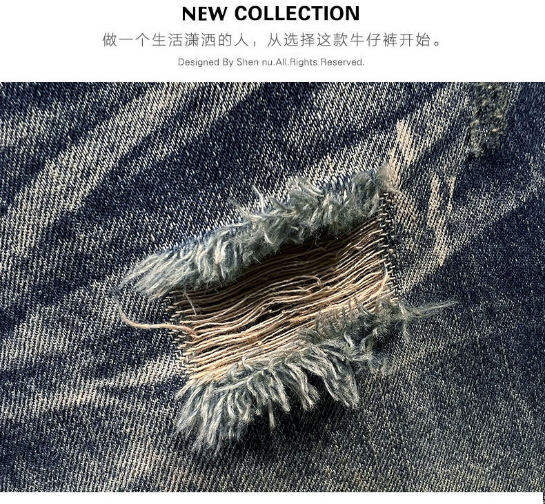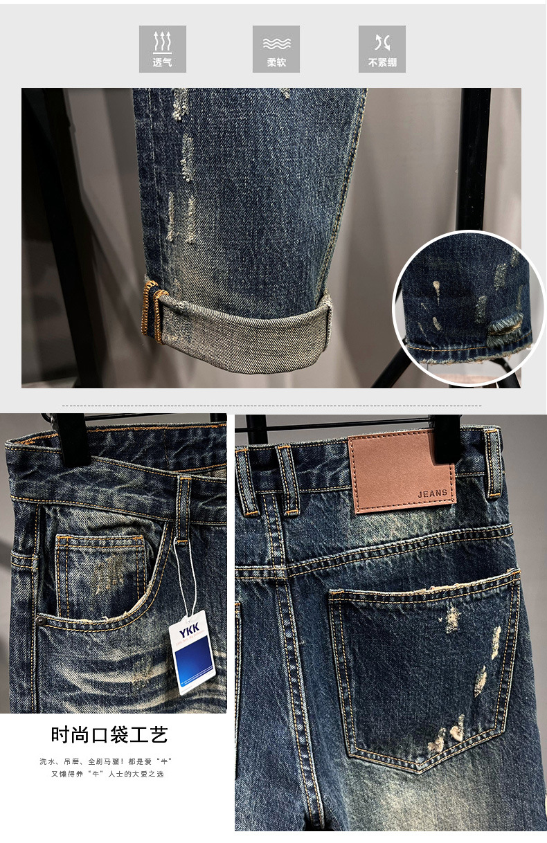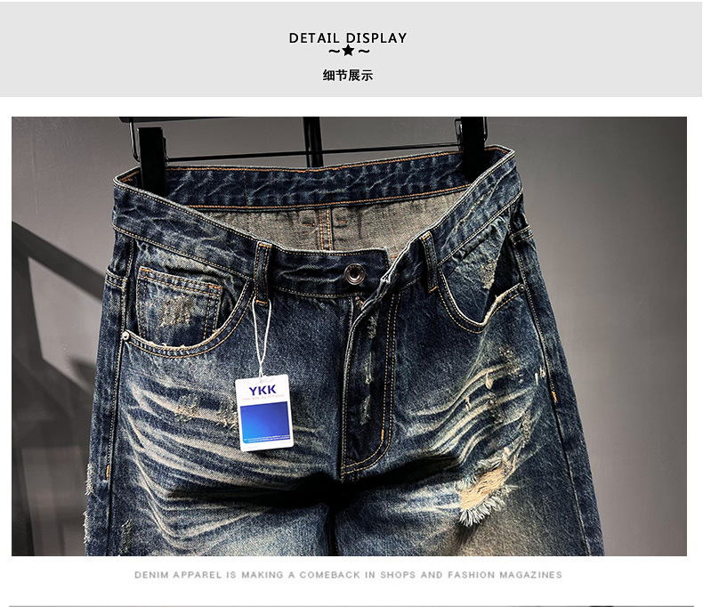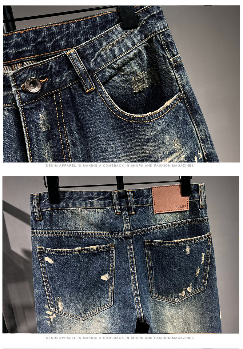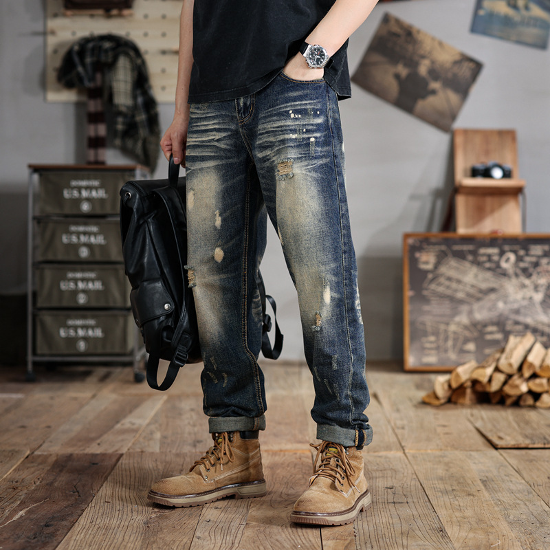 6503 | 대형 남성 여름 새로운 스프레이 그린 찢어진 청바지 느슨한 미국 복고풍 스트레이트 바지스토어 가기