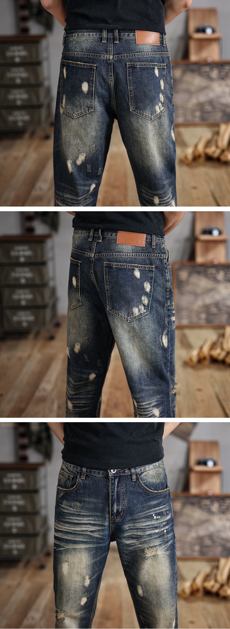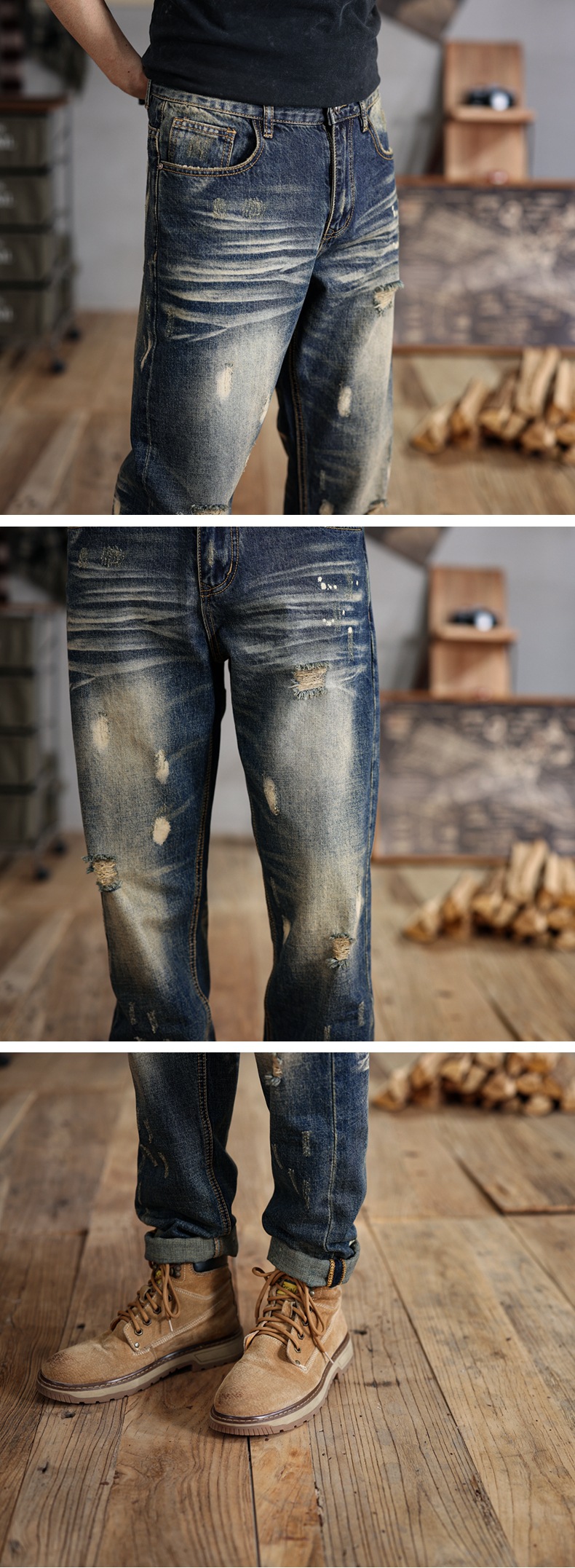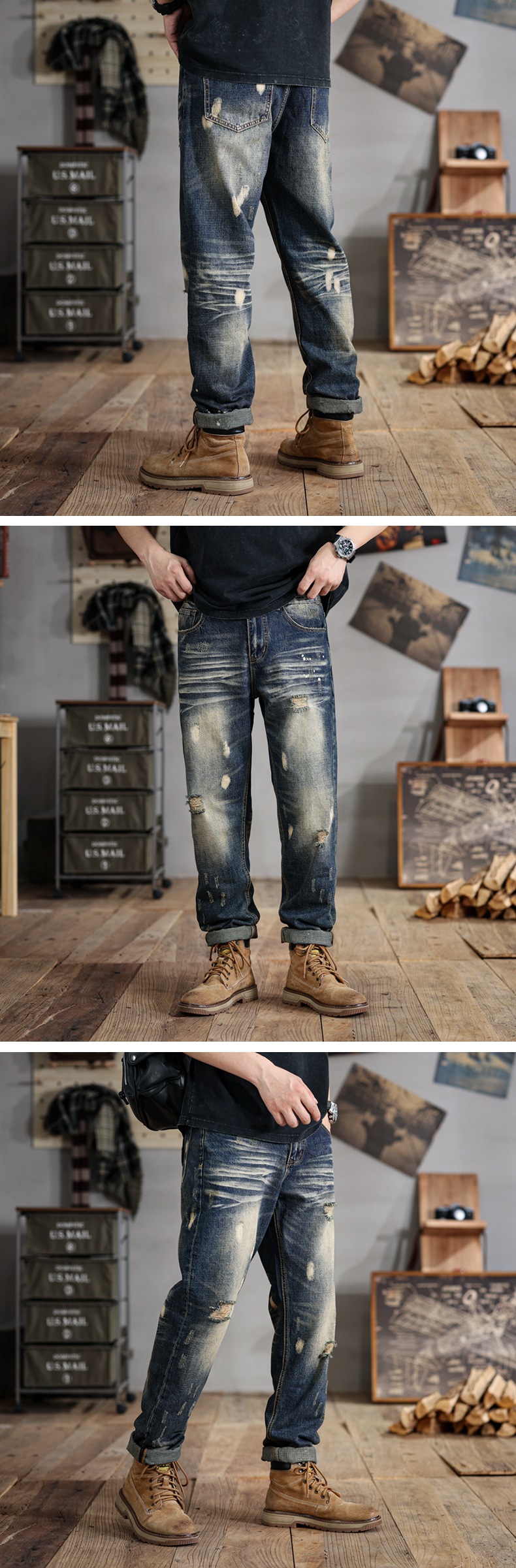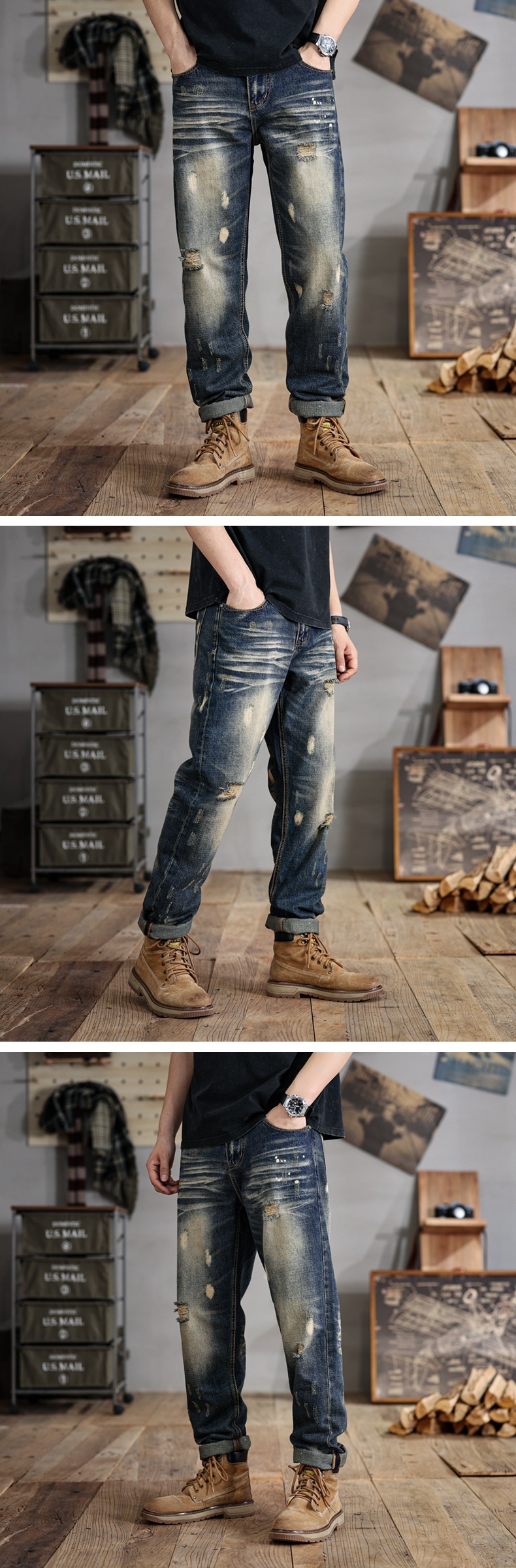 6503 | 대형 남성 여름 새로운 스프레이 그린 찢어진 청바지 느슨한 미국 복고풍 스트레이트 바지스토어 가기