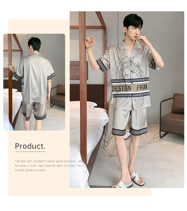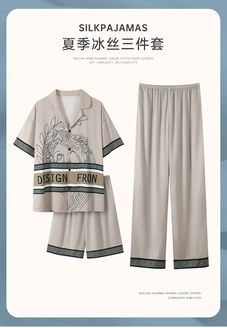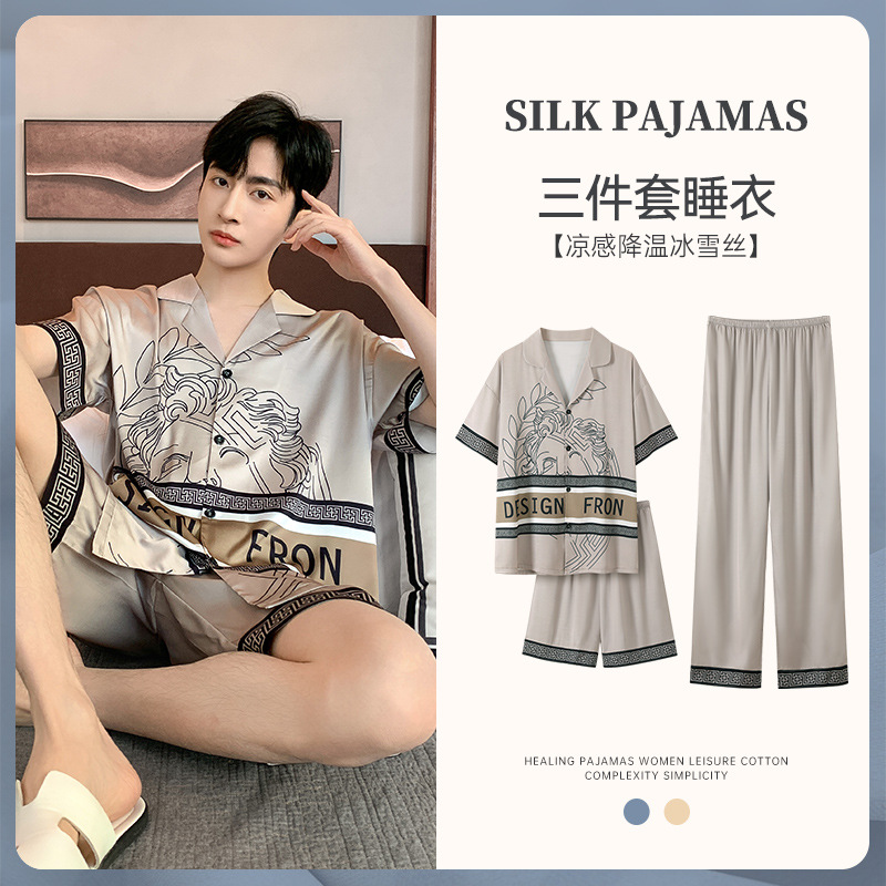 2024 아이스 실크 잠옷 남자 여름 반팔 바지 반바지 얇은 대형 3 피스 십대 홈 세트