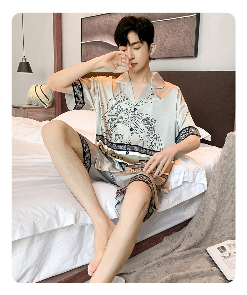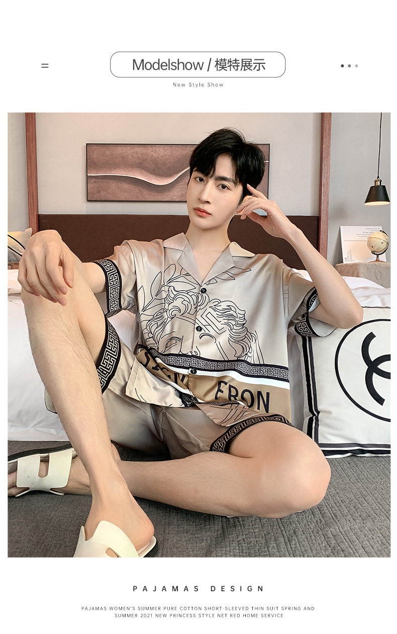 2024 아이스 실크 잠옷 남자 여름 반팔 바지 반바지 얇은 대형 3 피스 십대 홈 세트스토어 가기