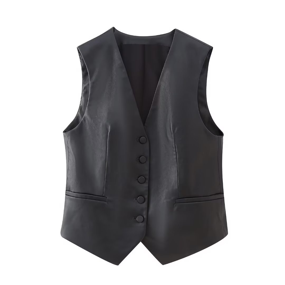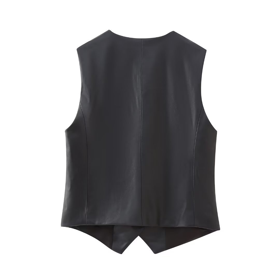 유럽과 미국의 새로운 세련된 조끼 가을 거리 패션 국경 조끼 민소매 블랙 2023 여성 PU 가짜 가죽