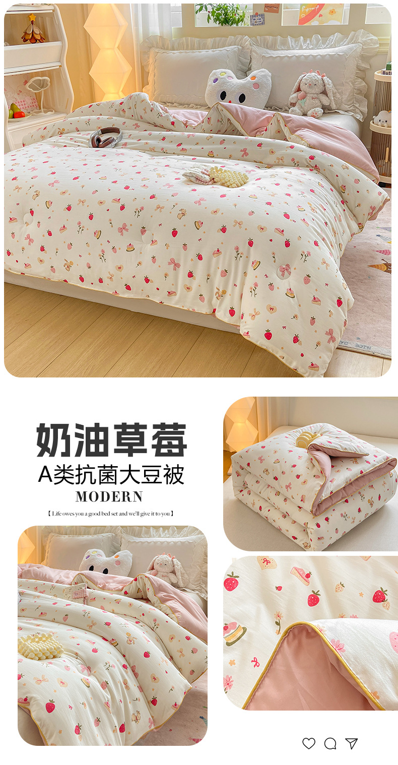 • 워셔블 더블 레이어 거즈 여름 이불 - 크림 스트로베리 [품질검사 완료, 세탁 가능]