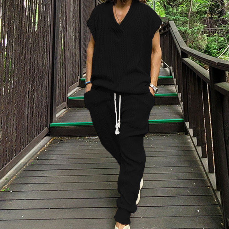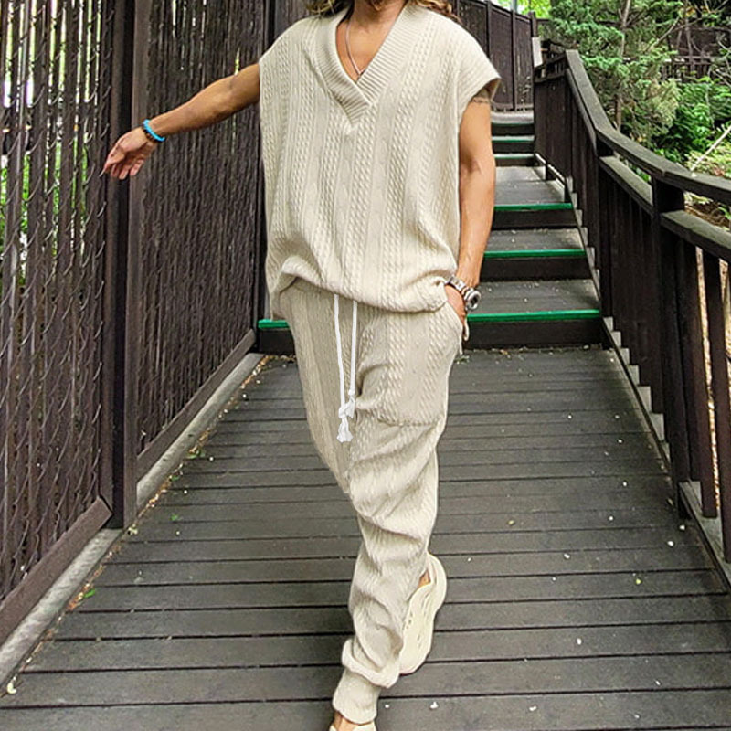 2024 아마존 여름 새로운 캐주얼 자카드 남자 느슨한 민소매 조끼 바지 남자 스포츠 세트 남자스토어 가기