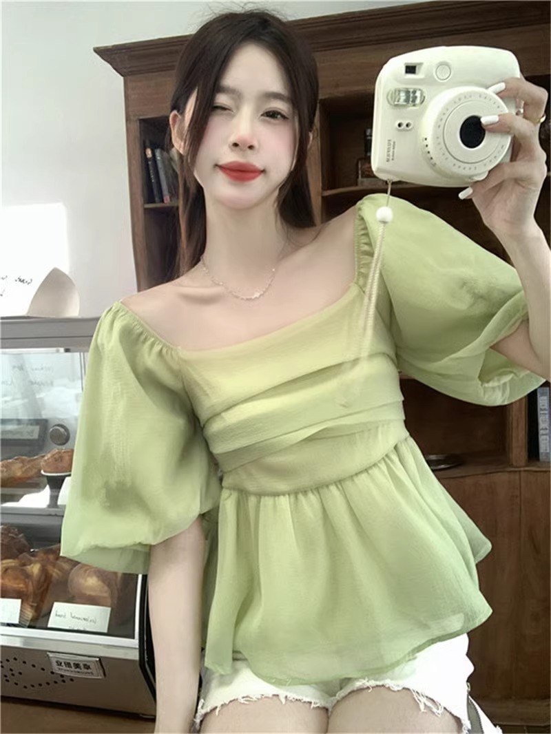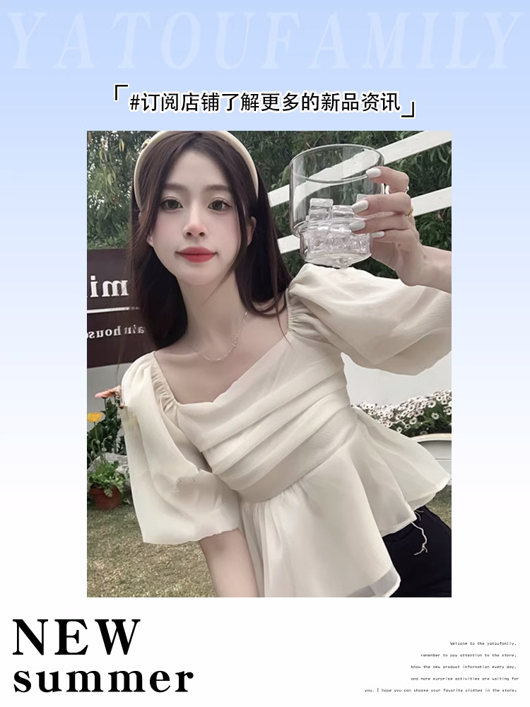 달콤한 스퀘어 칼라 살구색 쉬폰 셔츠 여성 여름 랩 가슴 주름 퍼프 슬리브 탑 웨이스트 슬림 핏 쇼트베이스 셔츠스토어 가기