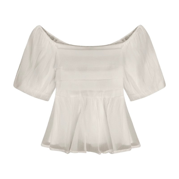 달콤한 스퀘어 칼라 살구색 쉬폰 셔츠 여성 여름 랩 가슴 주름 퍼프 슬리브 탑 웨이스트 슬림 핏 쇼트베이스 셔츠