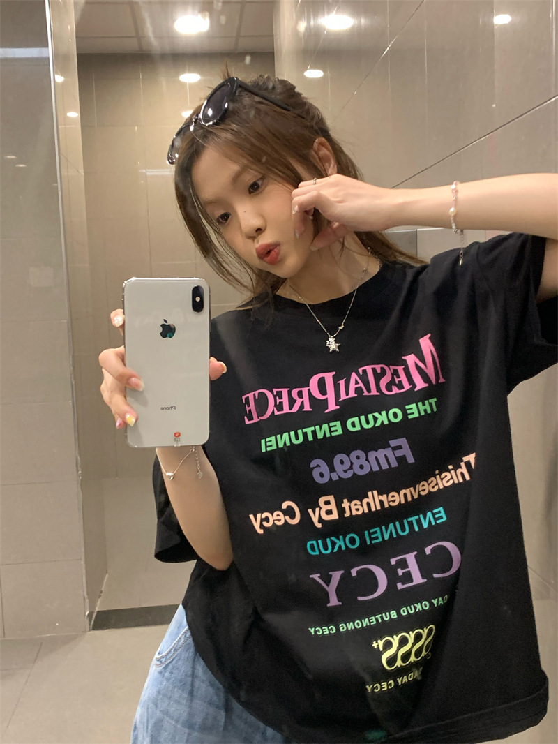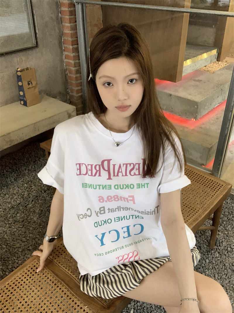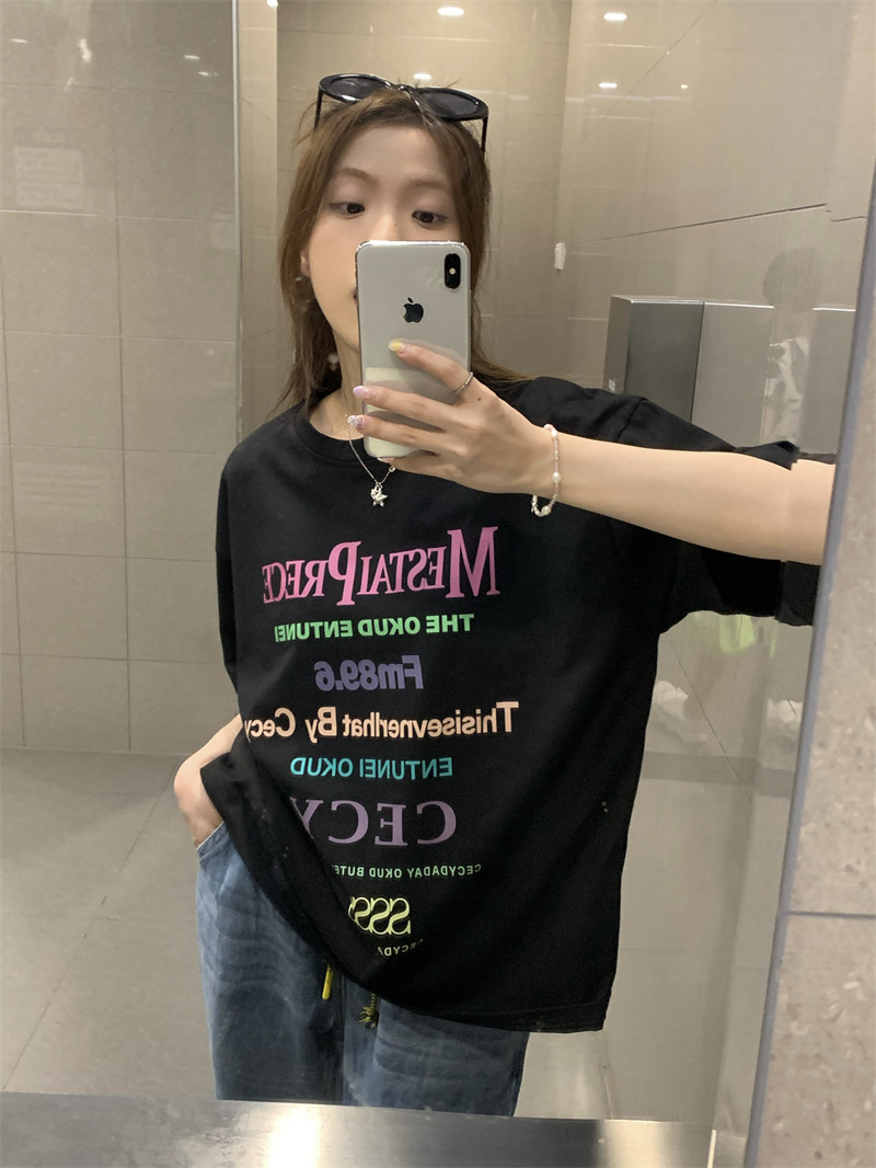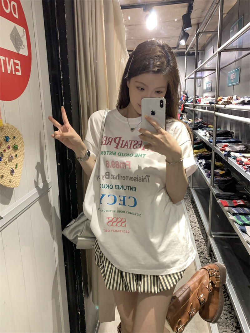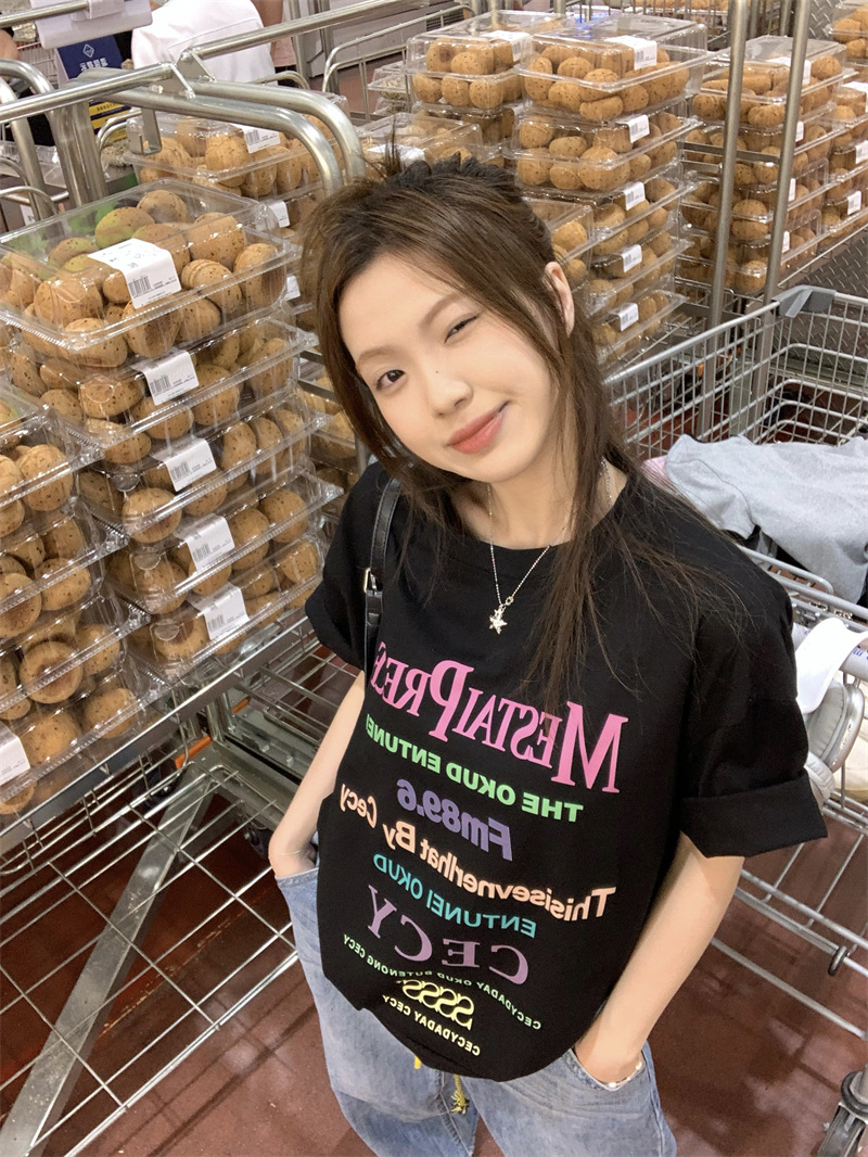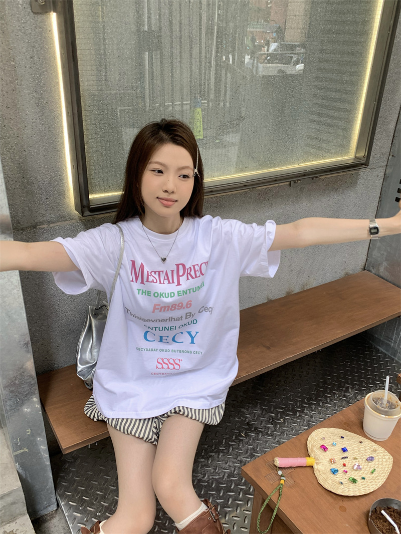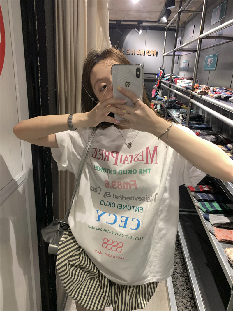 리얼 샷 ~ 미국의 게으른 컬러 글자 느슨한 반팔 티셔츠 여성용 캐주얼 조커 탑 62806스토어 가기