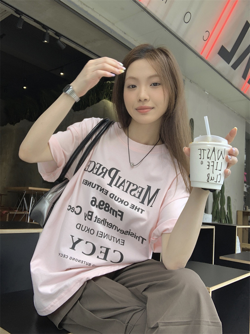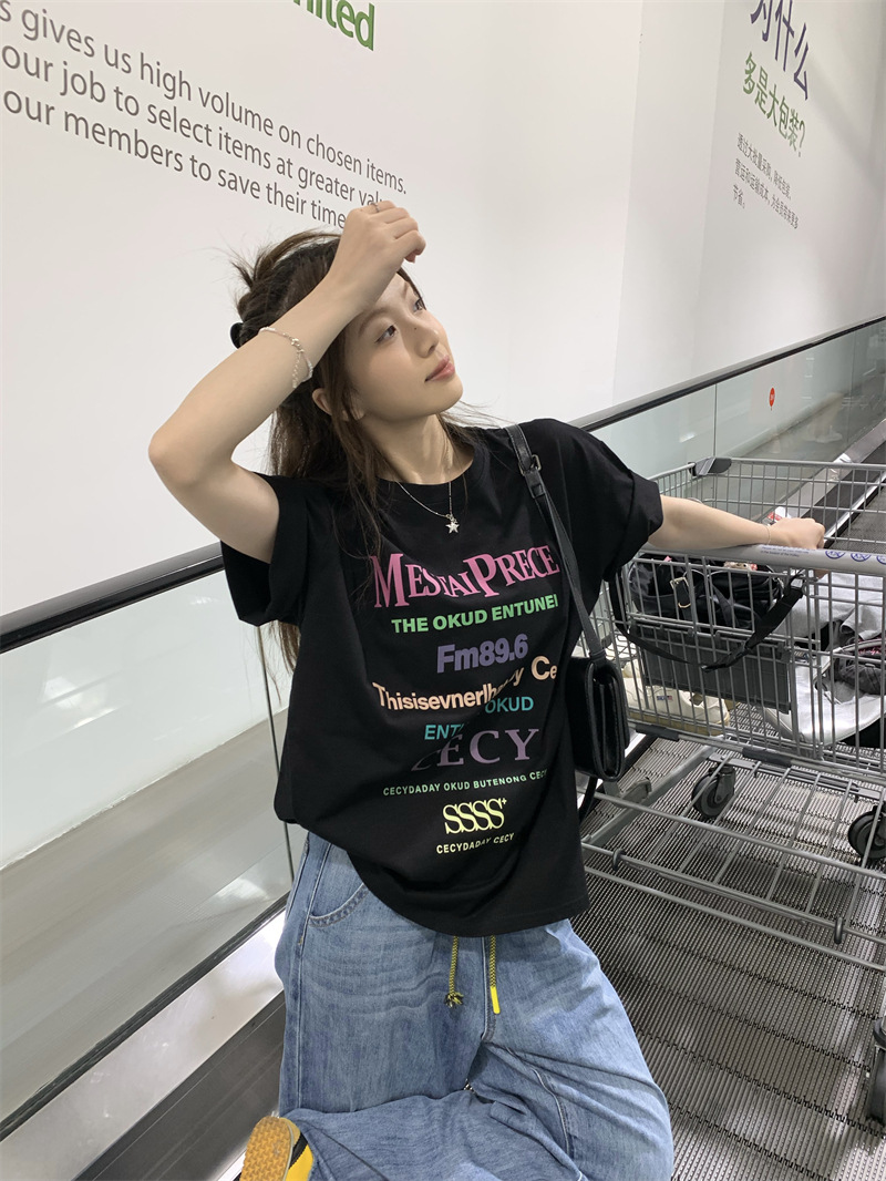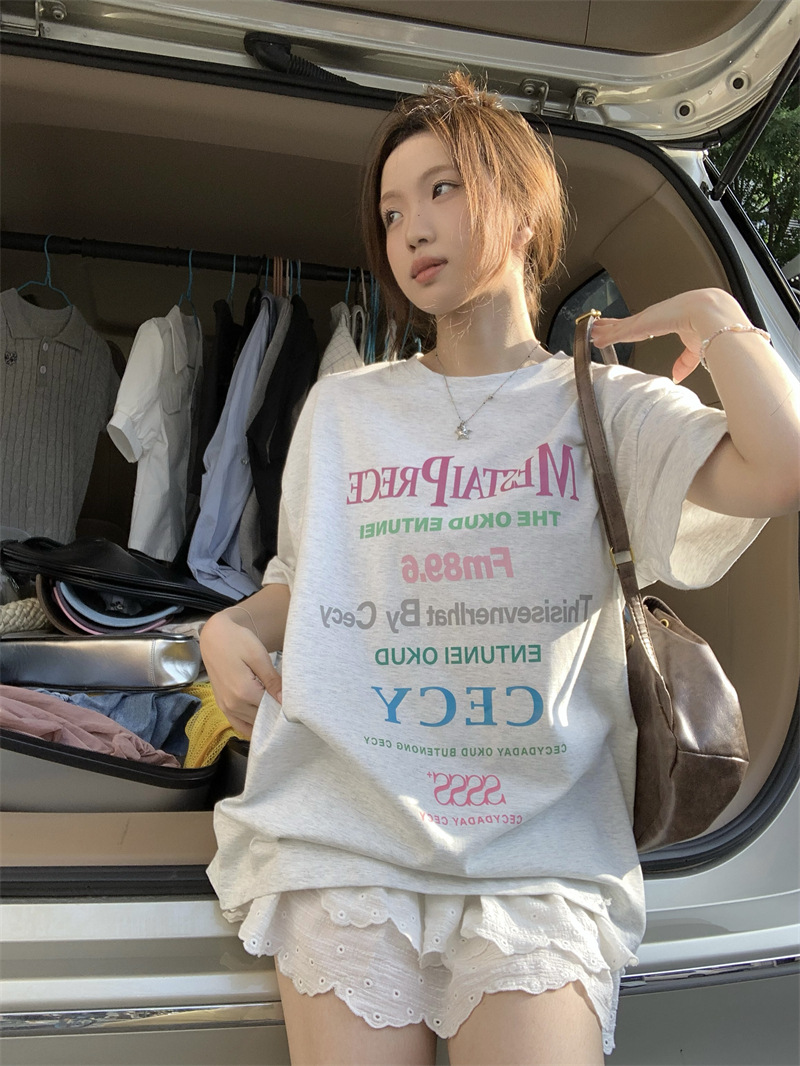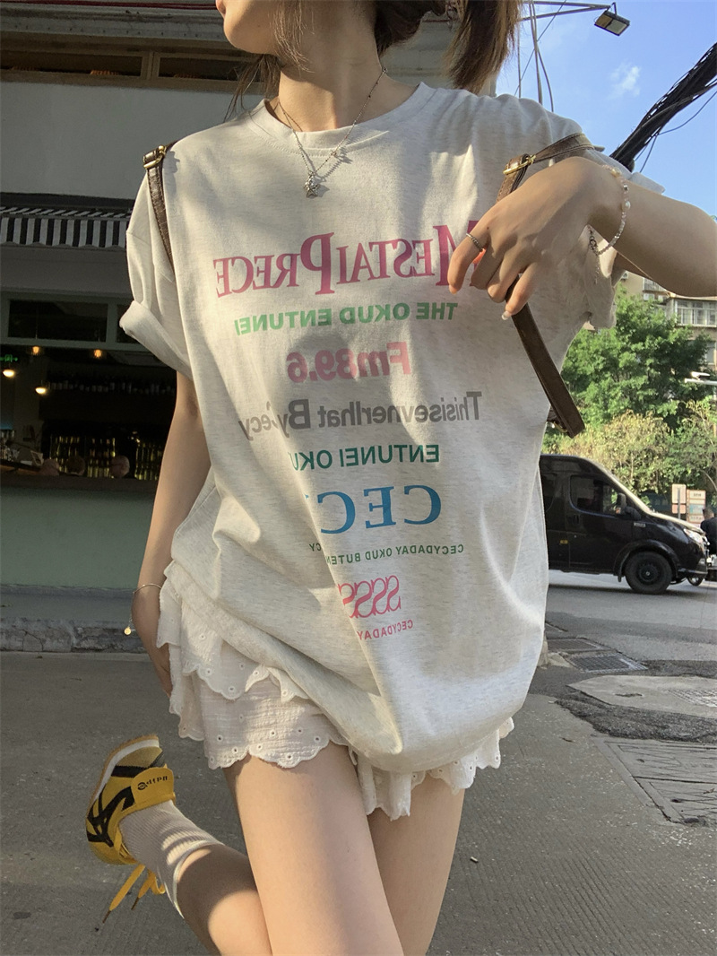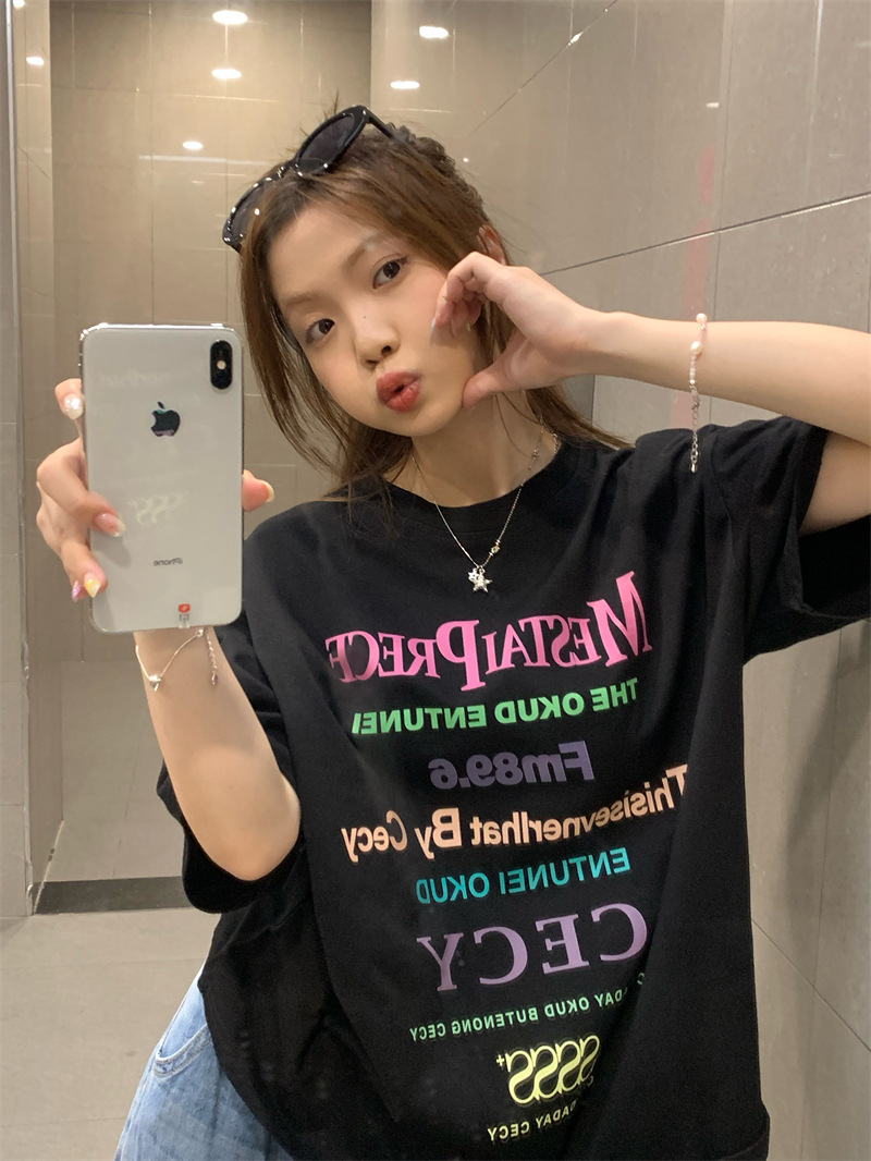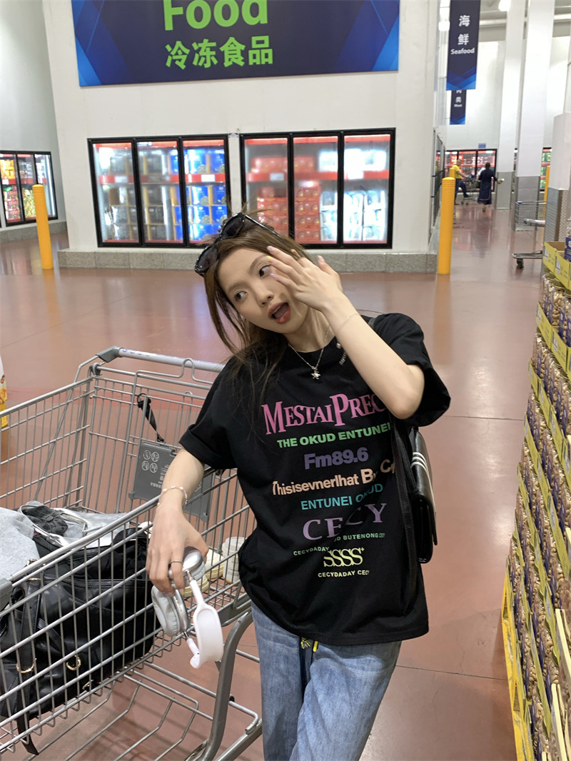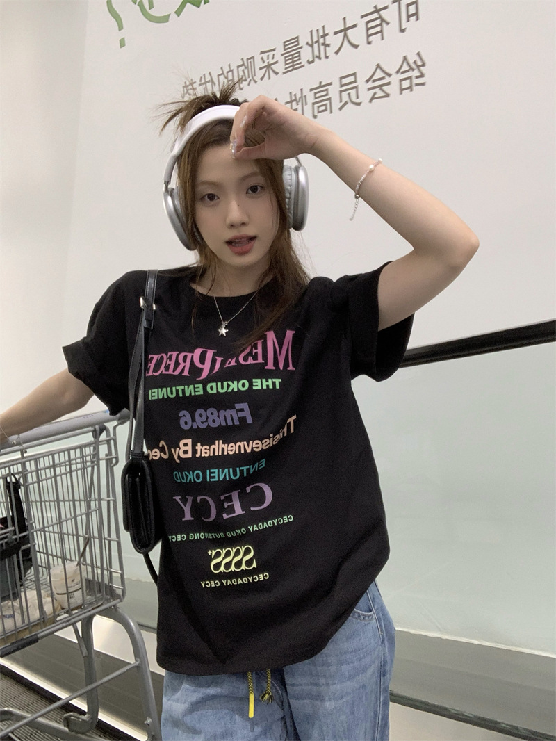 리얼 샷 ~ 미국의 게으른 컬러 글자 느슨한 반팔 티셔츠 여성용 캐주얼 조커 탑 62806스토어 가기