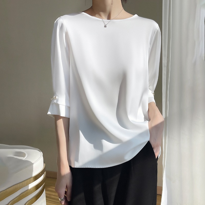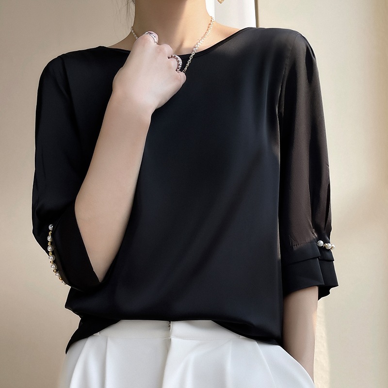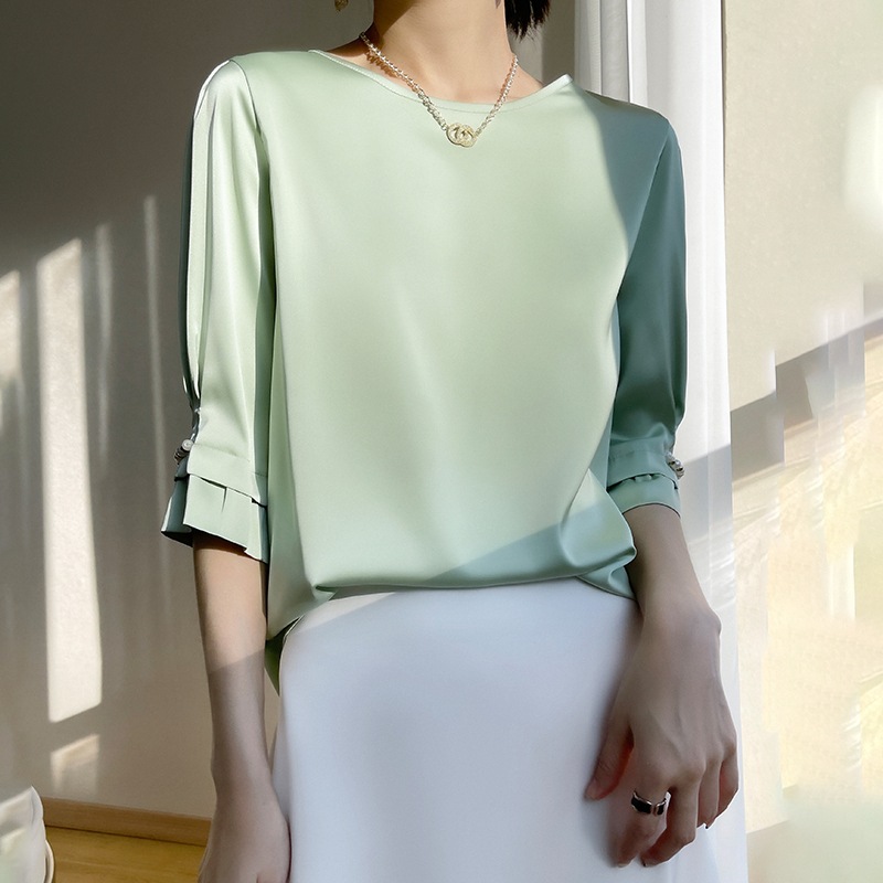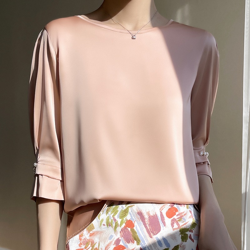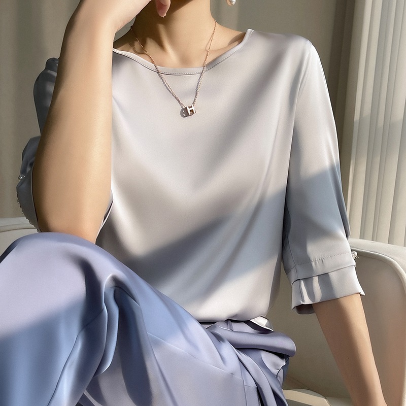 주름이없는 실키 드래핑 크루 넥 실크 블라우스 여자 여름 쉬폰 셔츠 7 점 미드 슬리브 탑 반팔 T스토어 가기