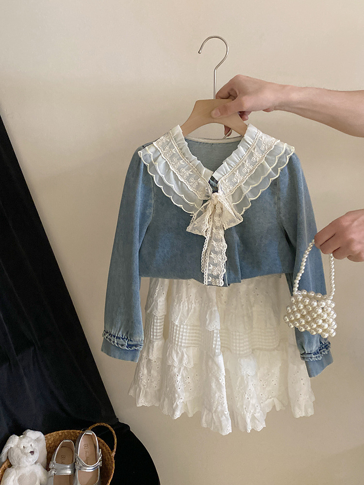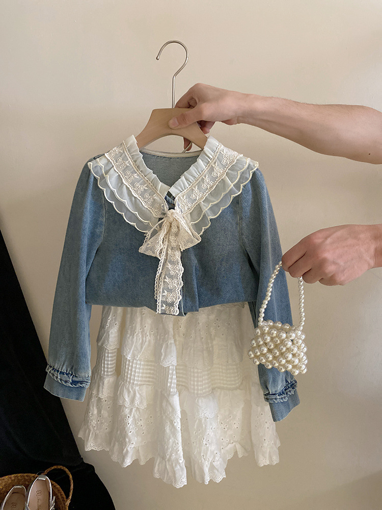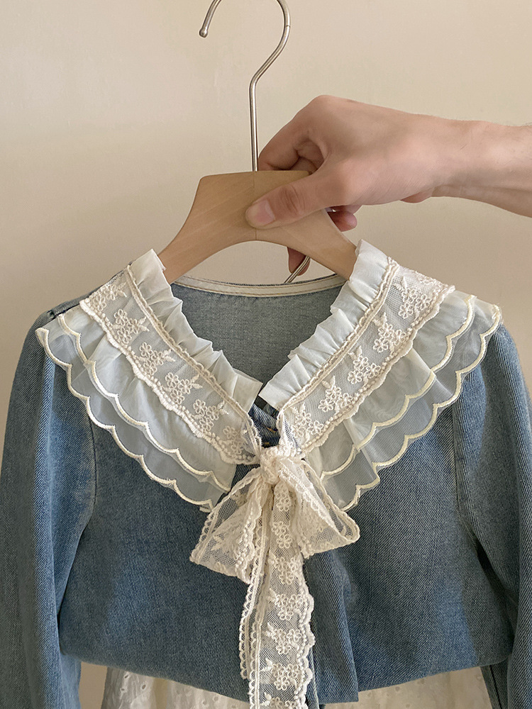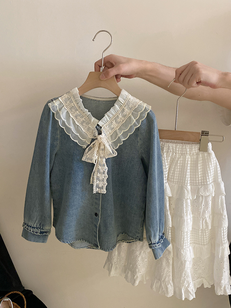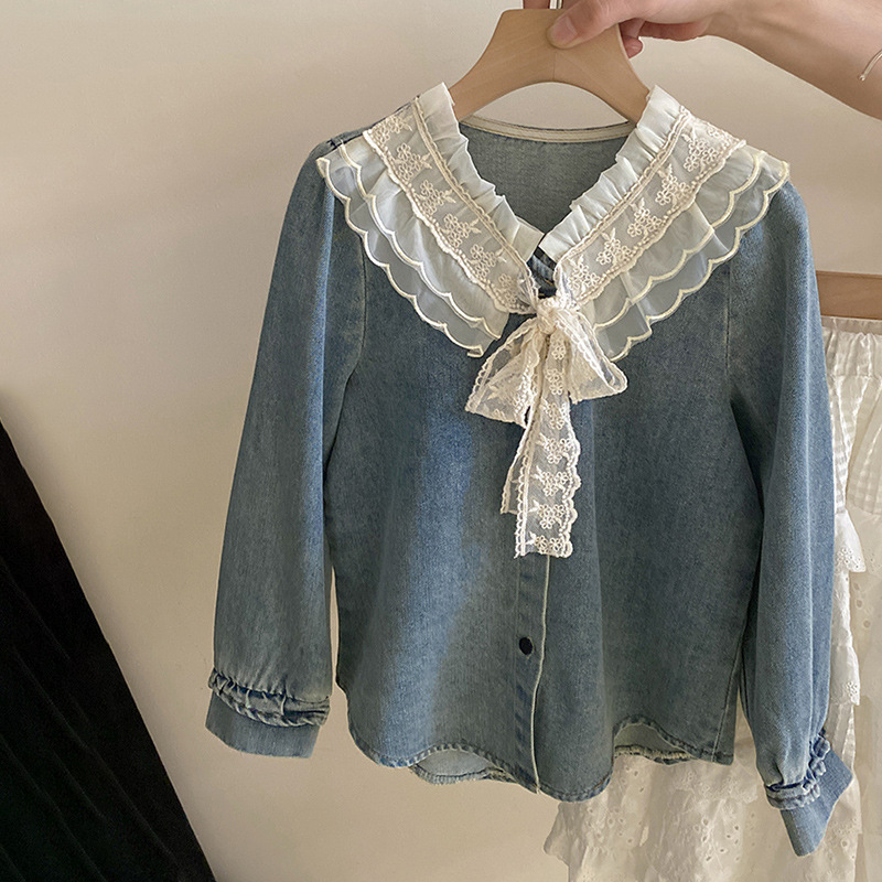 세련된 V-Neck 레이스 레이스 레트로 데님 셔츠 내부 탑 소녀 느슨한 디자인 감각 틈새 봄스토어 가기