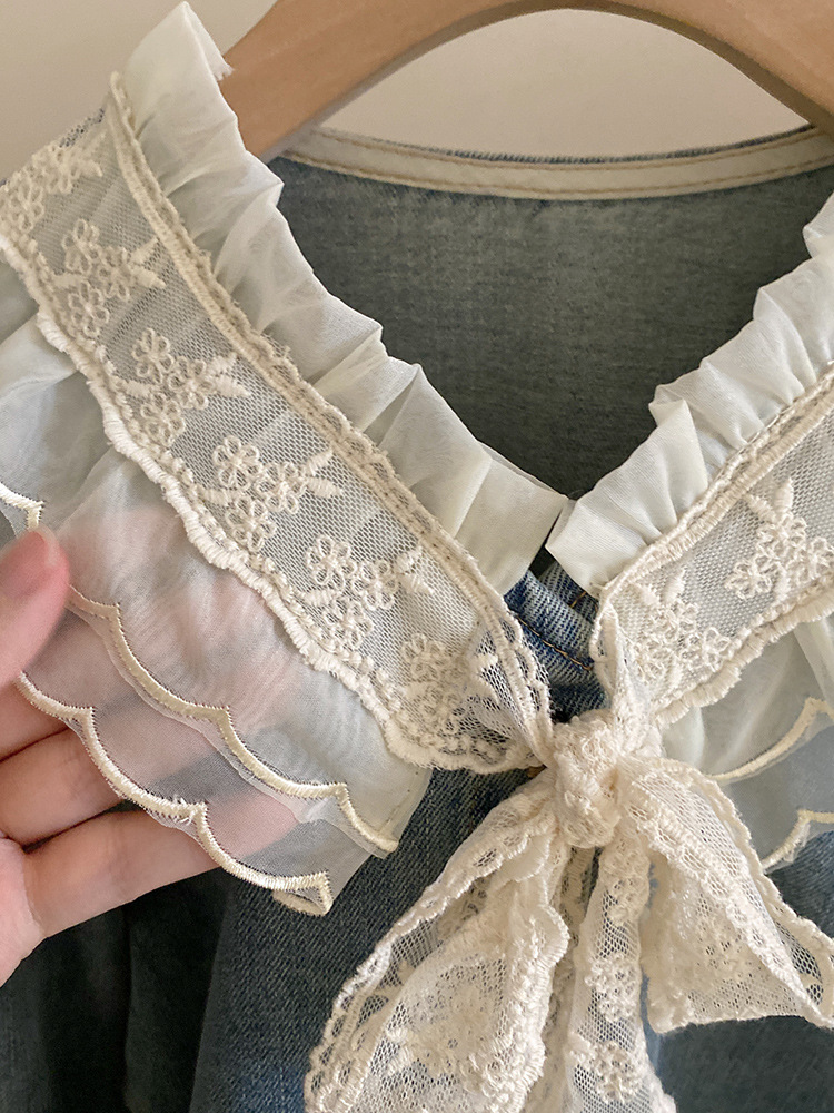 세련된 V-Neck 레이스 레이스 레트로 데님 셔츠 내부 탑 소녀 느슨한 디자인 감각 틈새 봄