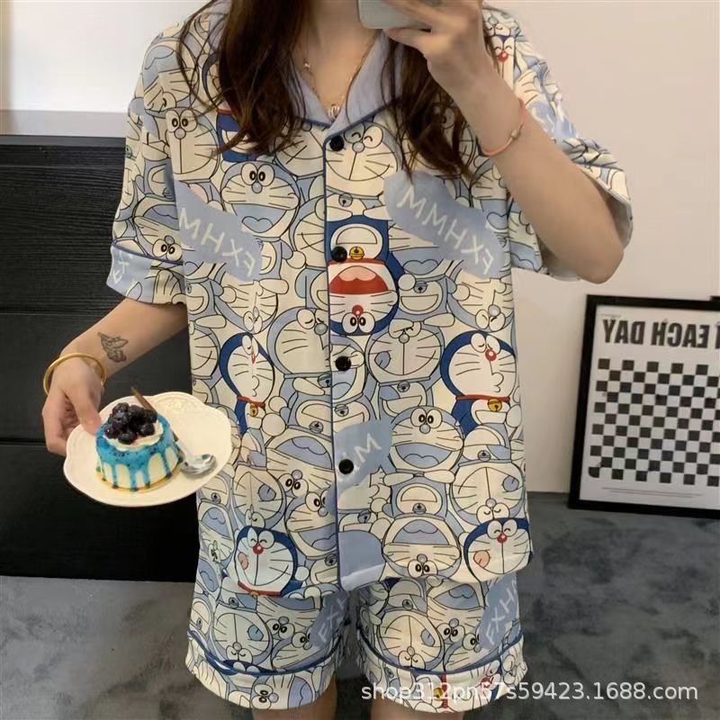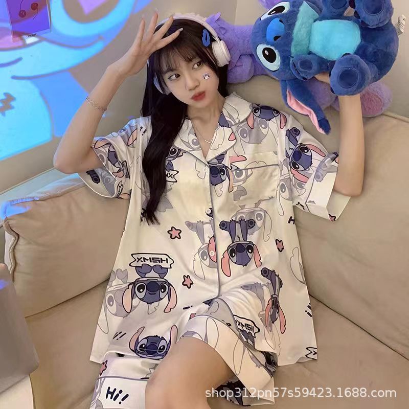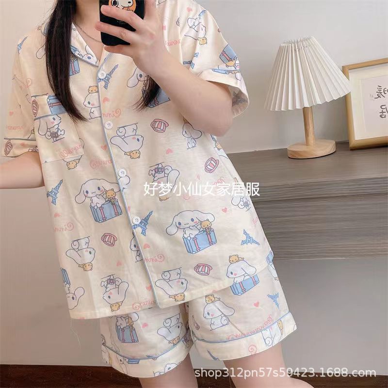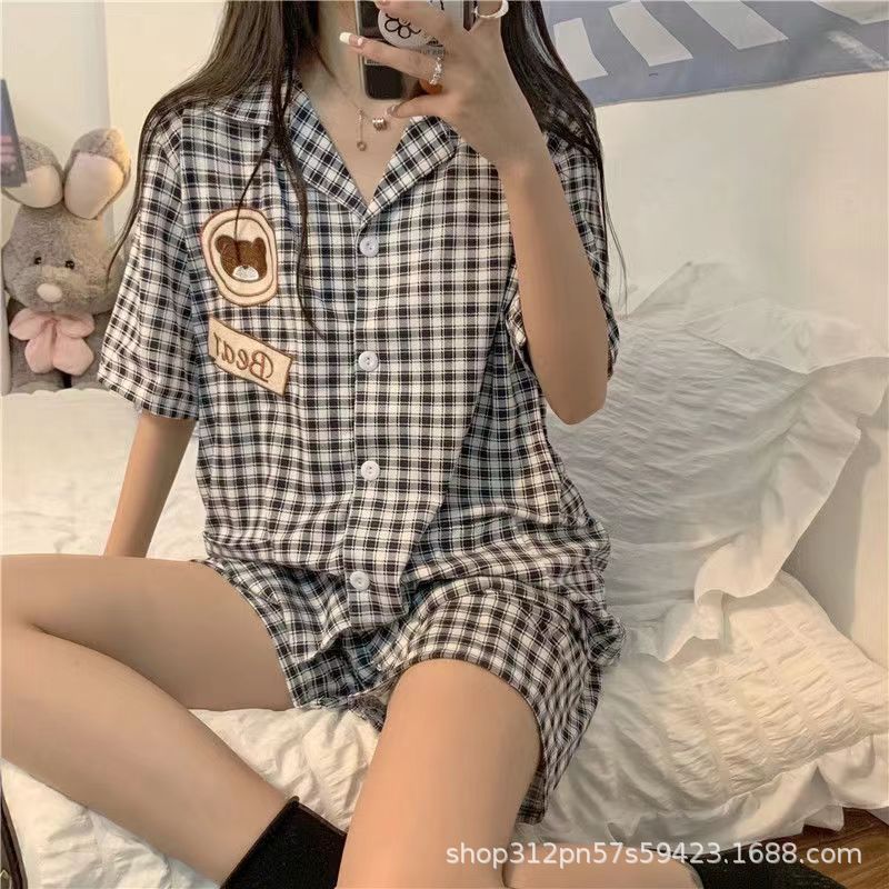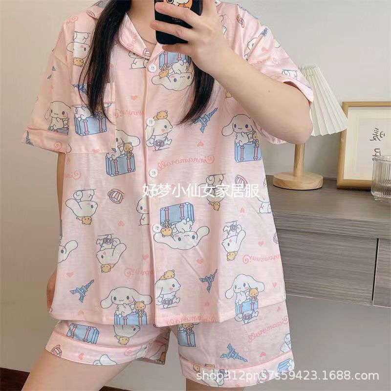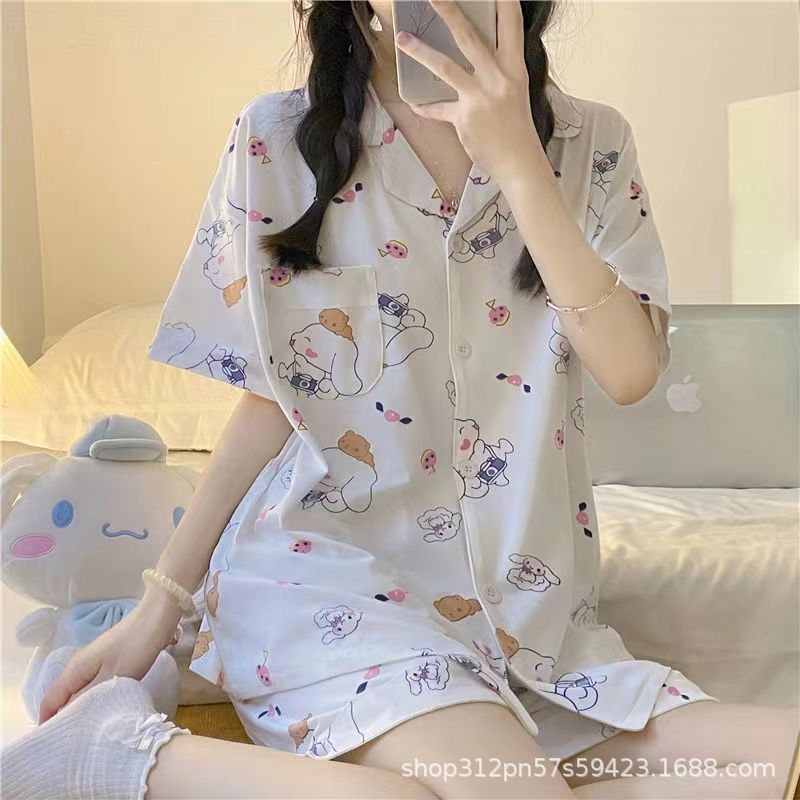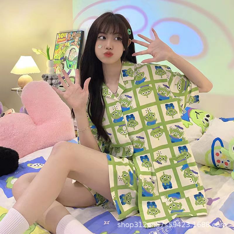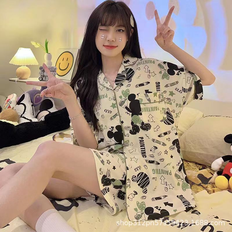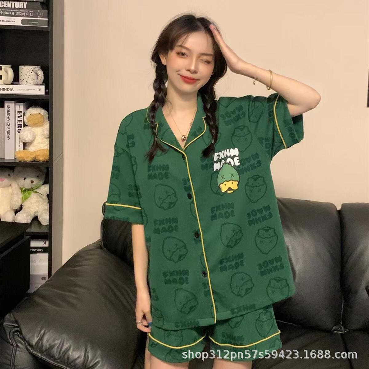2024 년 여름 새 잠옷 여성 반팔 반바지 한국 버전의 느슨한 헤어 2 피스 홈 옷을 입을 수 있습니다.스토어 가기
