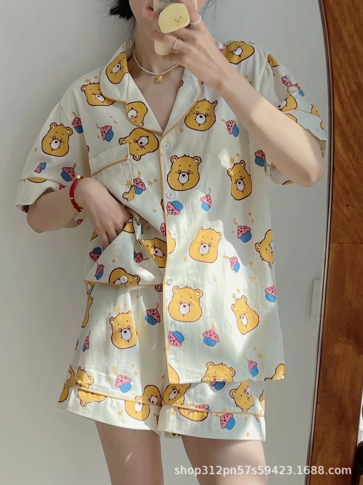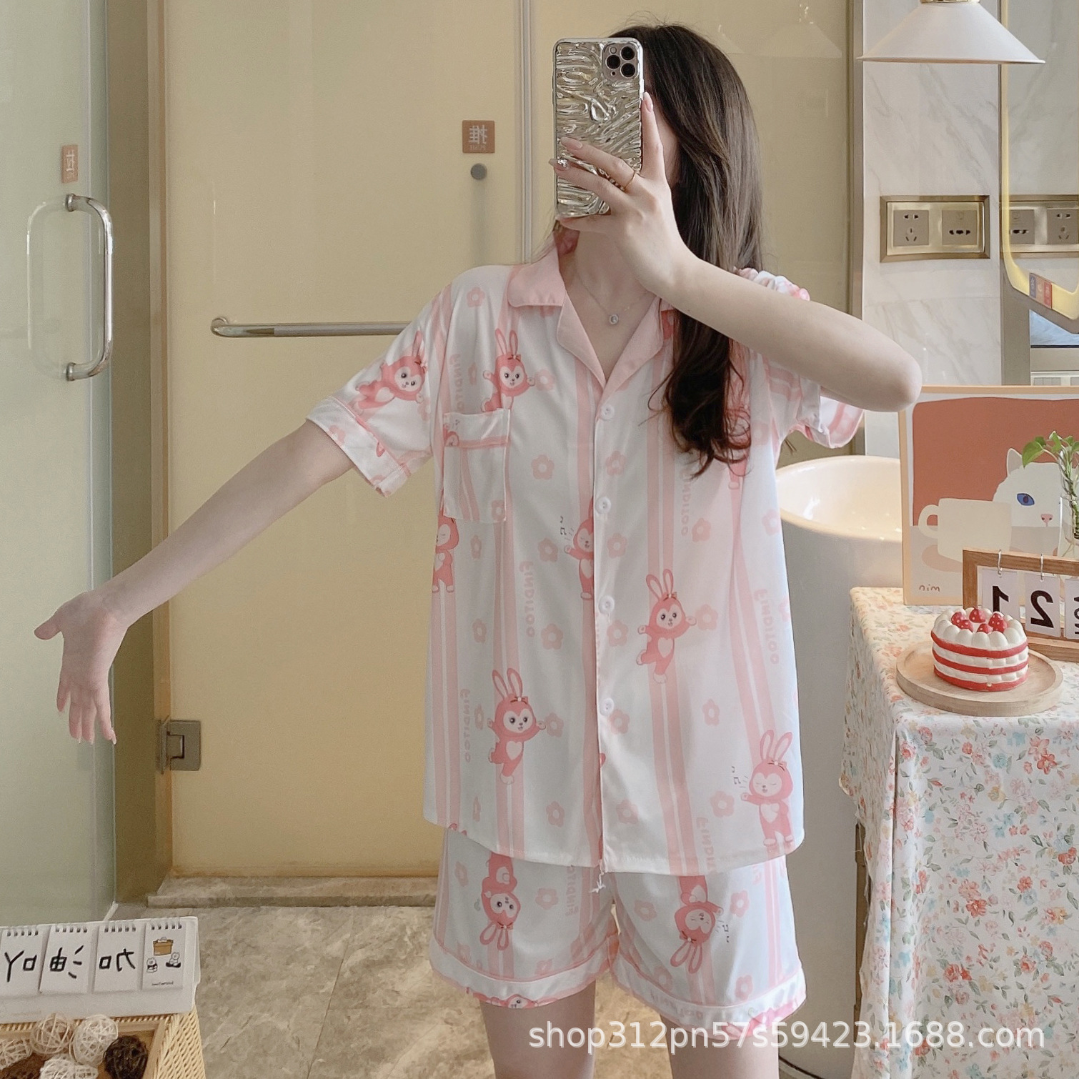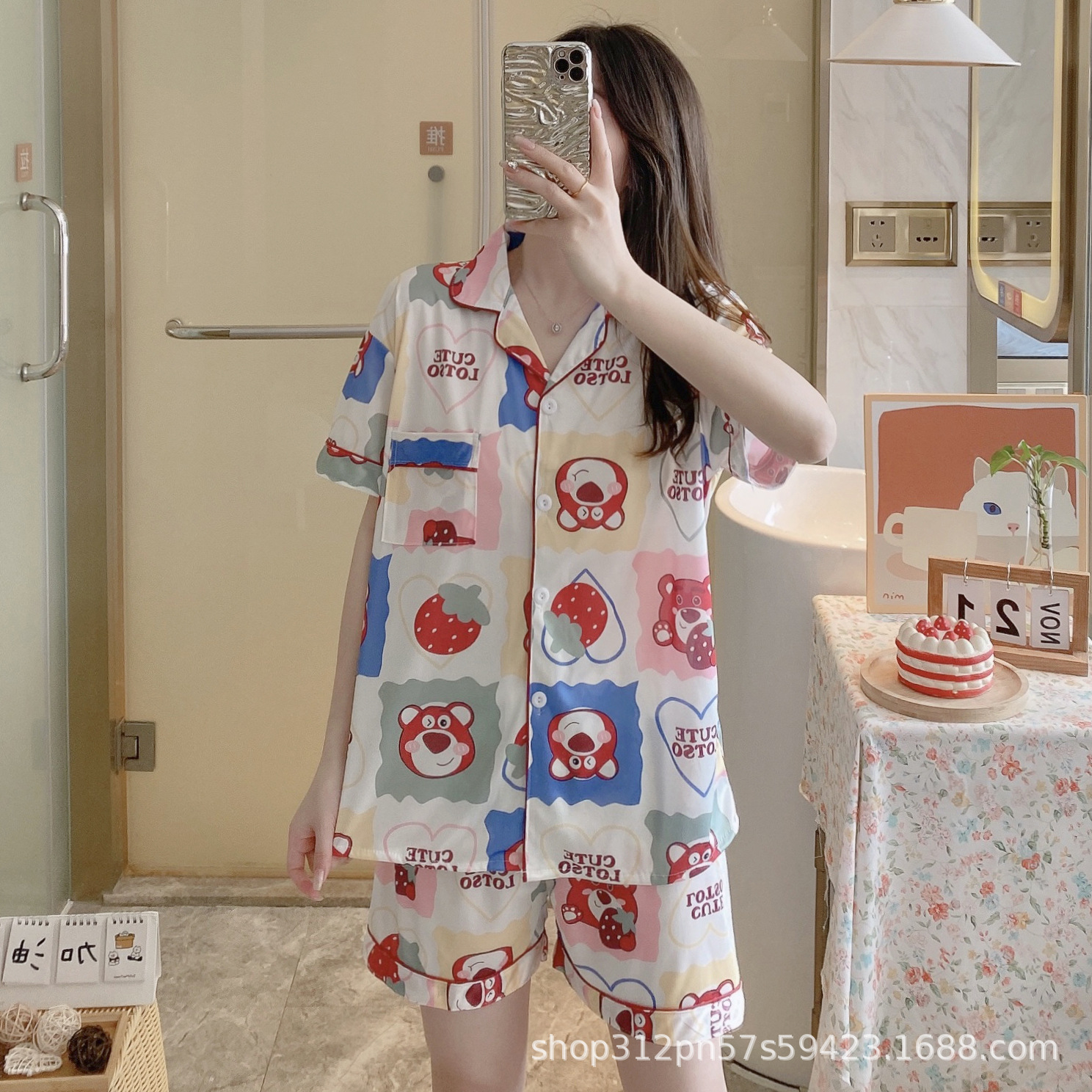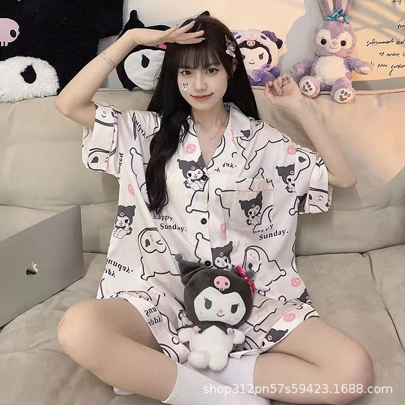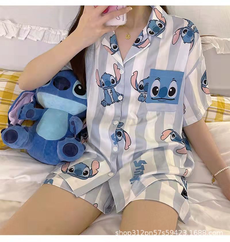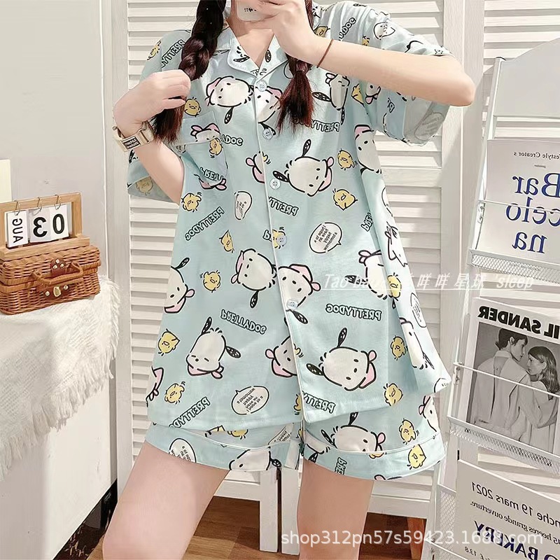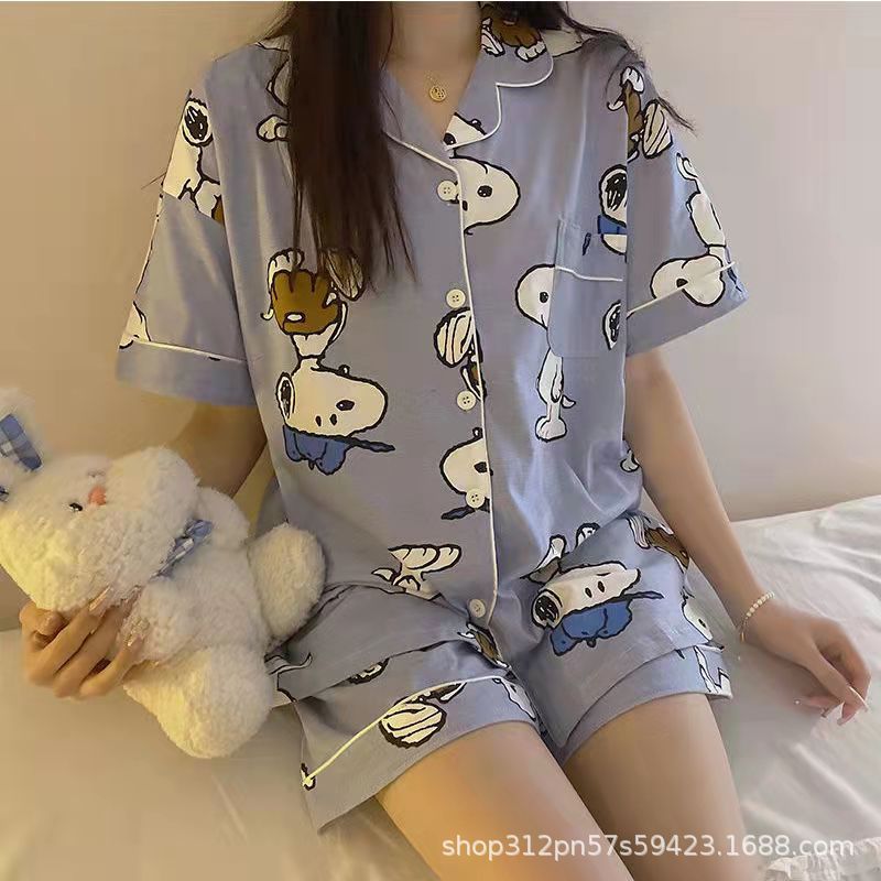 2024 년 여름 새 잠옷 여성 반팔 반바지 한국 버전의 느슨한 헤어 2 피스 홈 옷을 입을 수 있습니다.스토어 가기