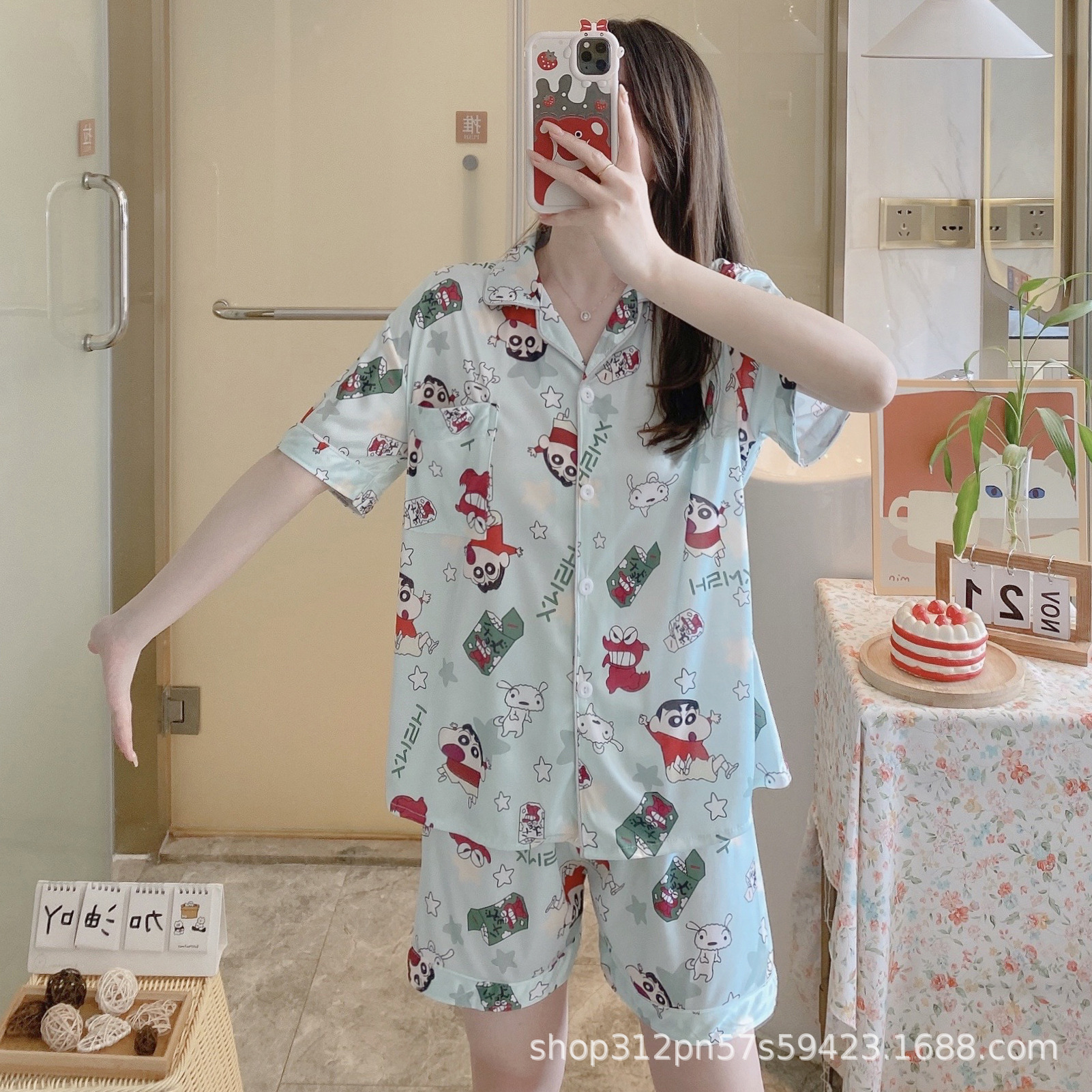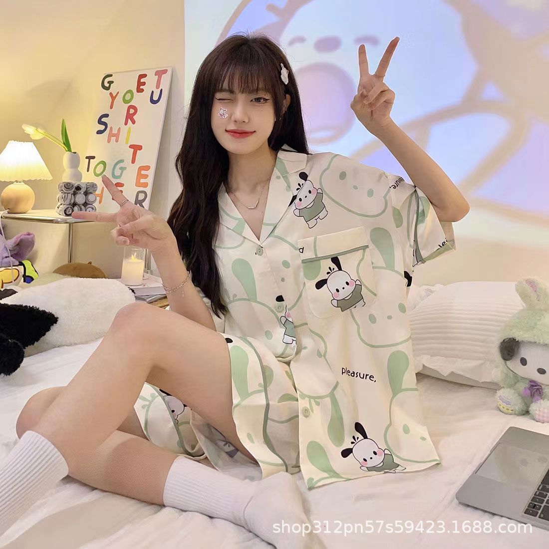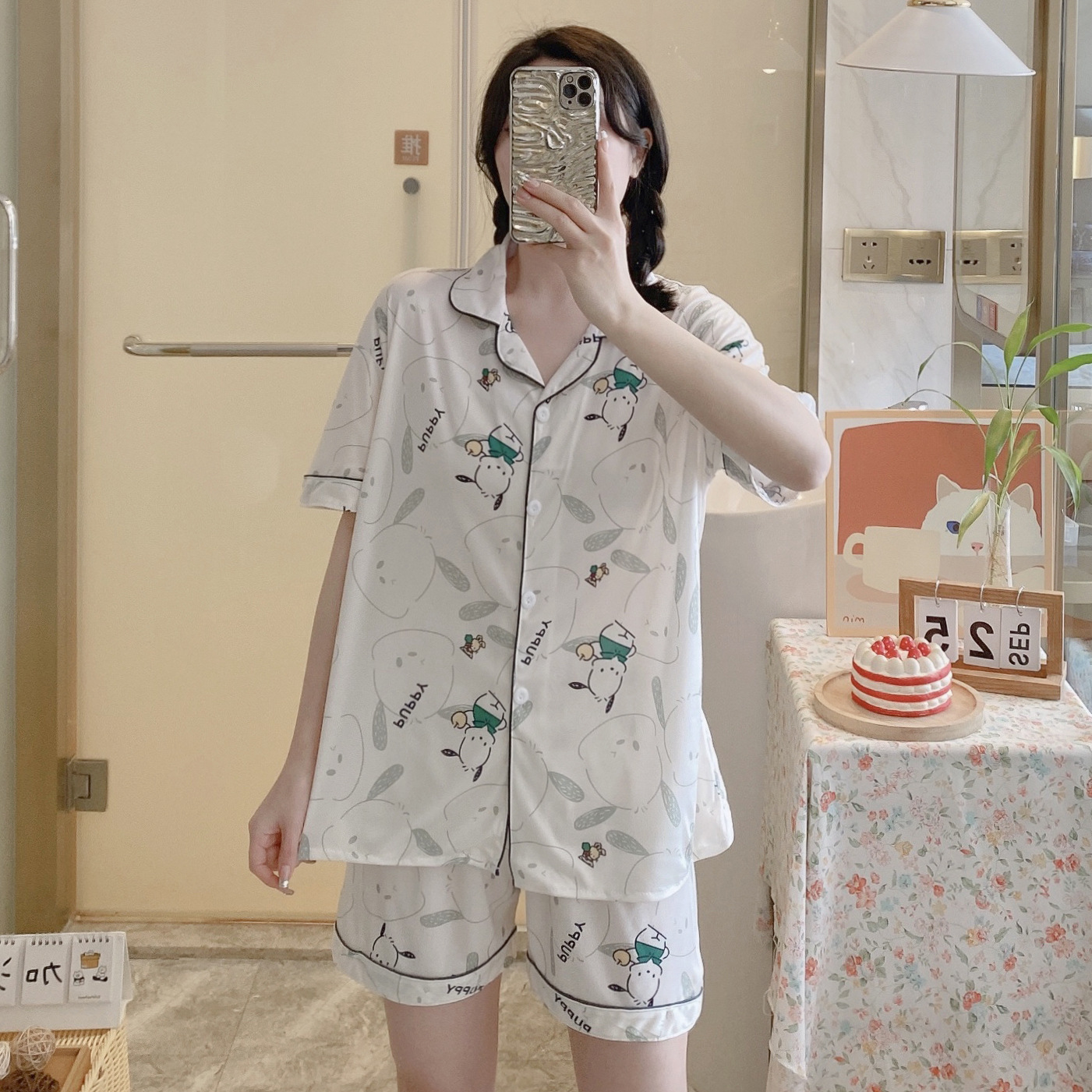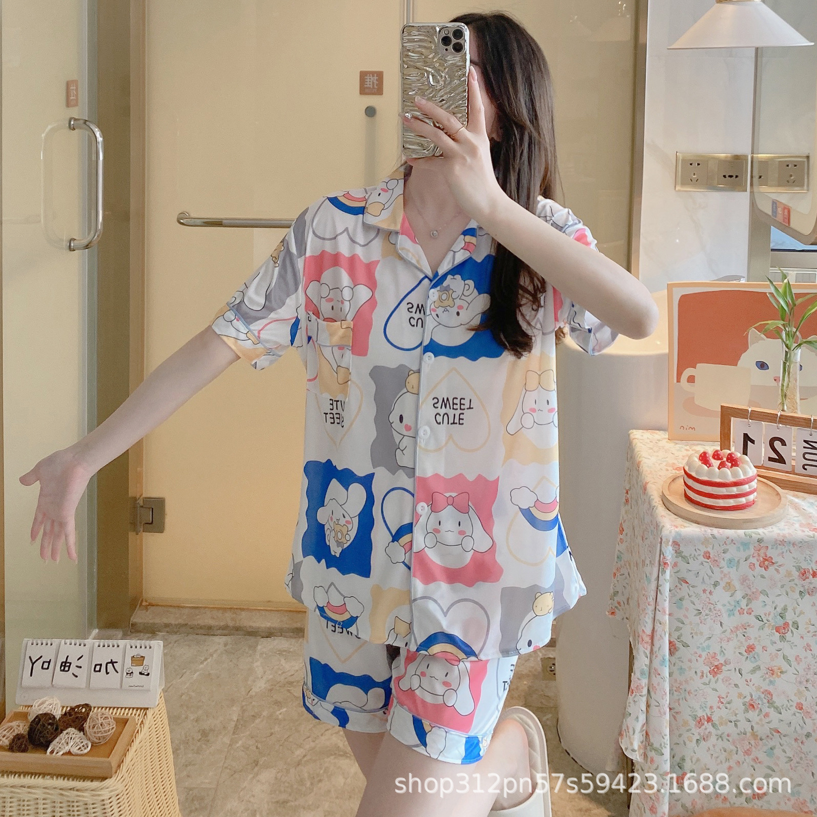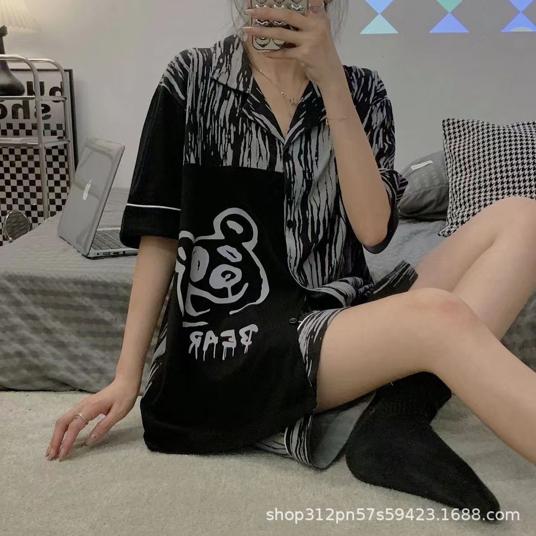 2024 년 여름 새 잠옷 여성 반팔 반바지 한국 버전의 느슨한 헤어 2 피스 홈 옷을 입을 수 있습니다.스토어 가기