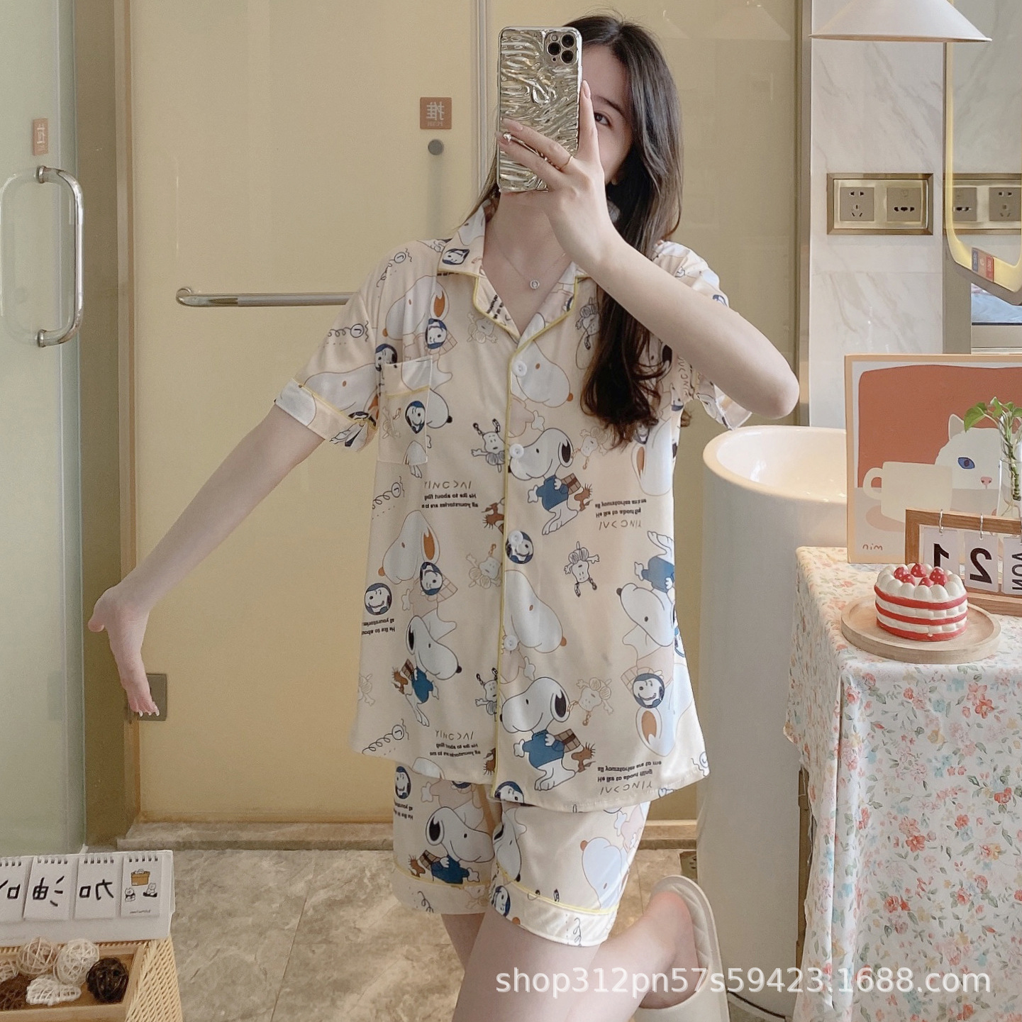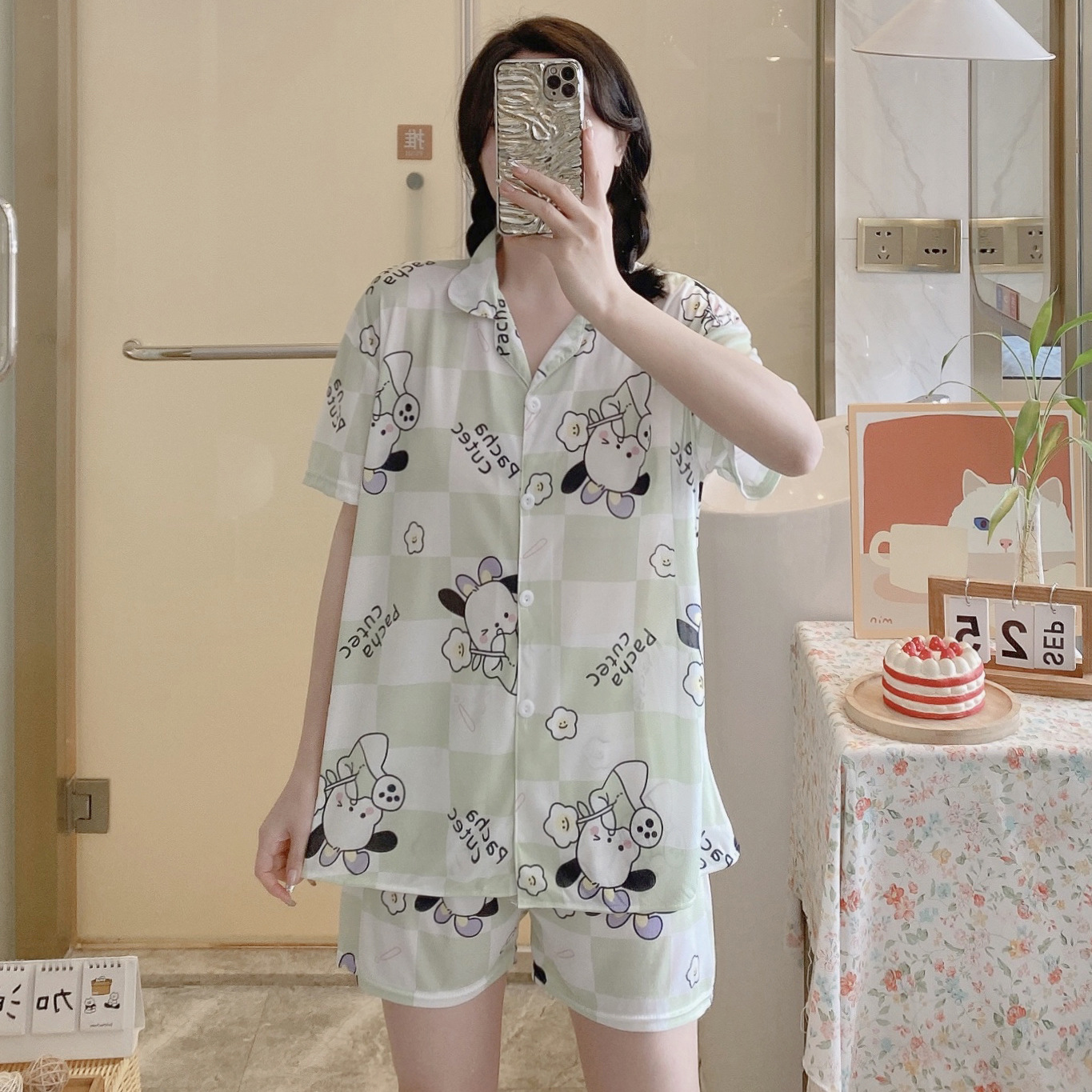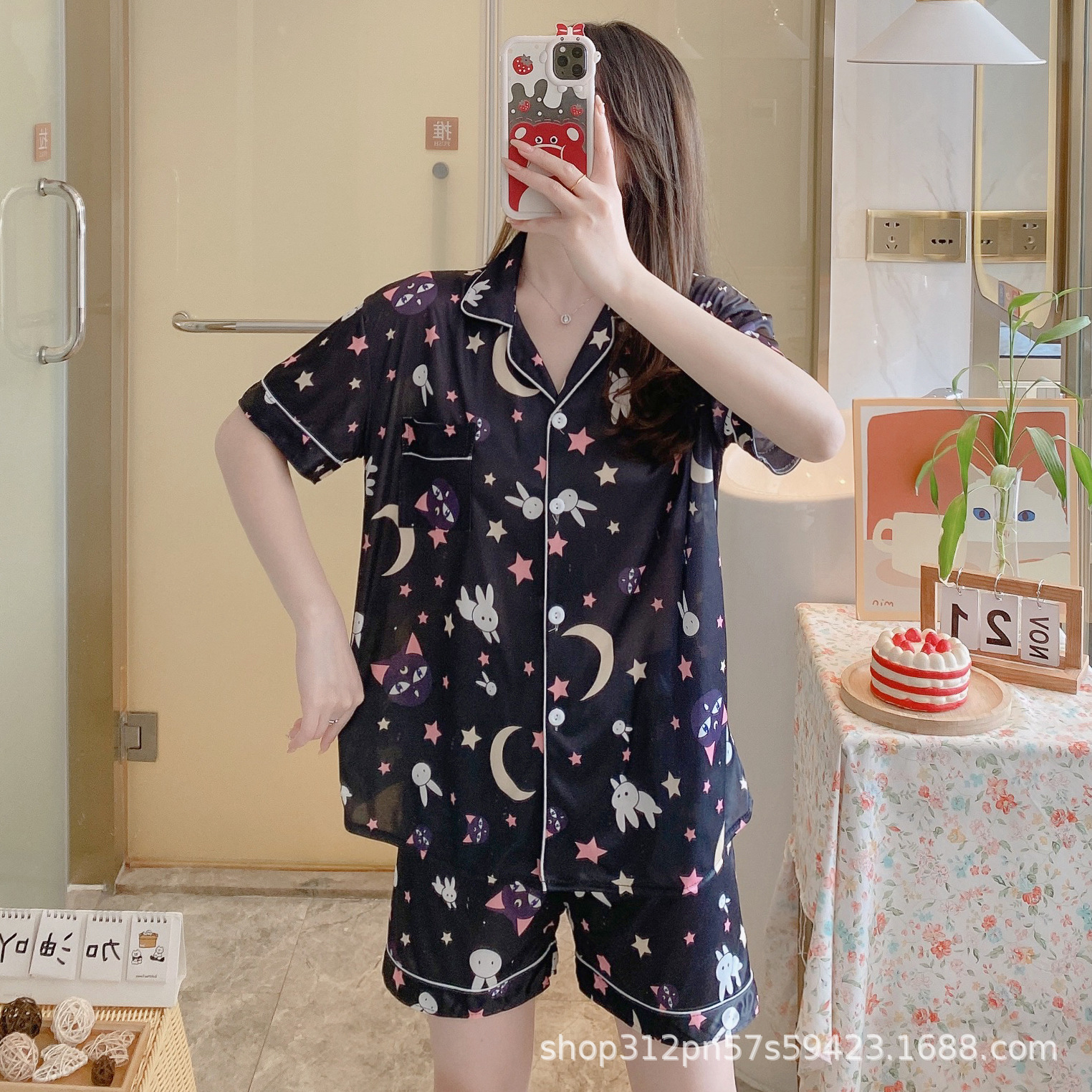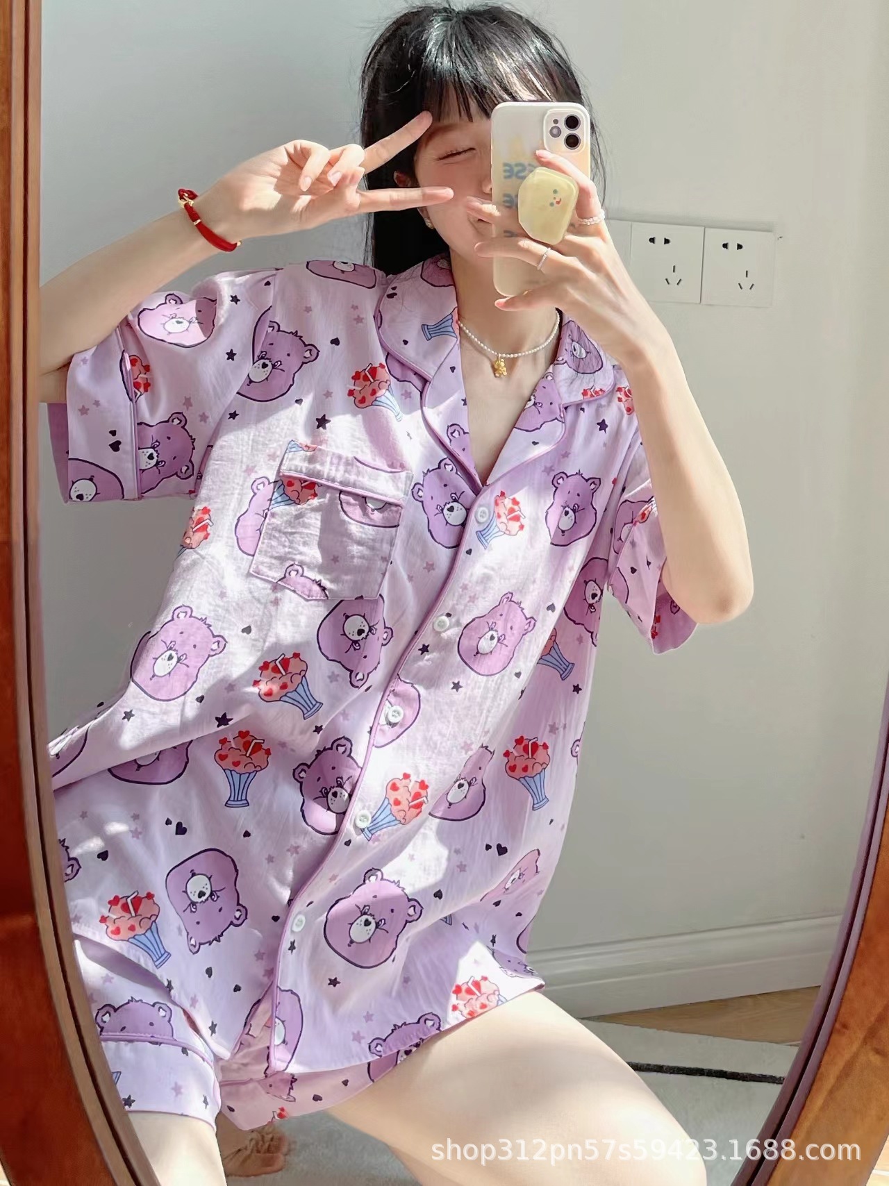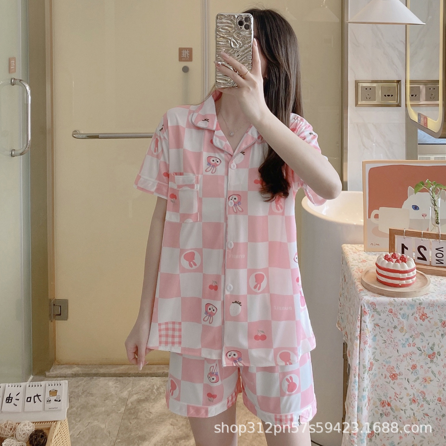 2024 년 여름 새 잠옷 여성 반팔 반바지 한국 버전의 느슨한 헤어 2 피스 홈 옷을 입을 수 있습니다.스토어 가기