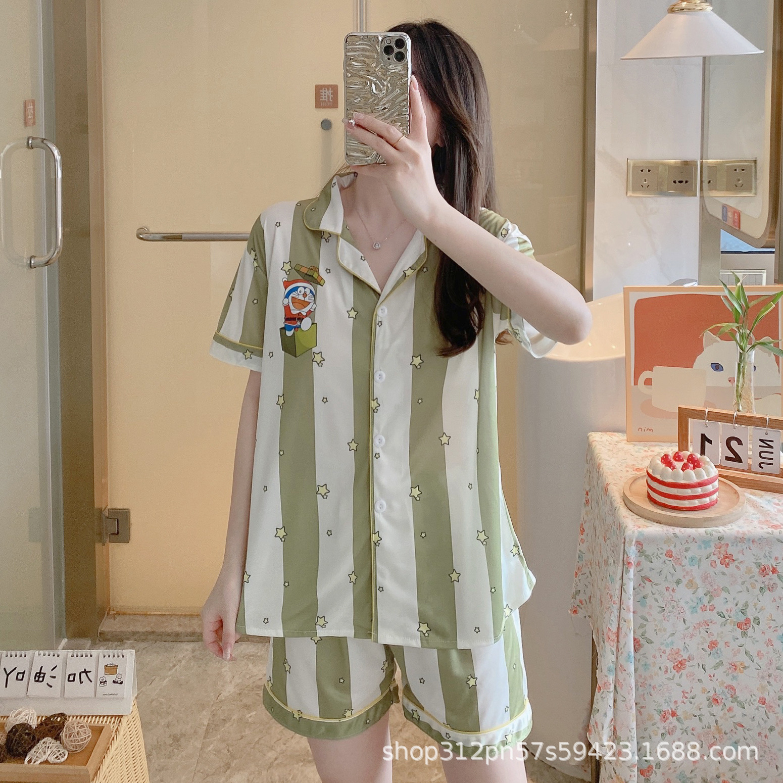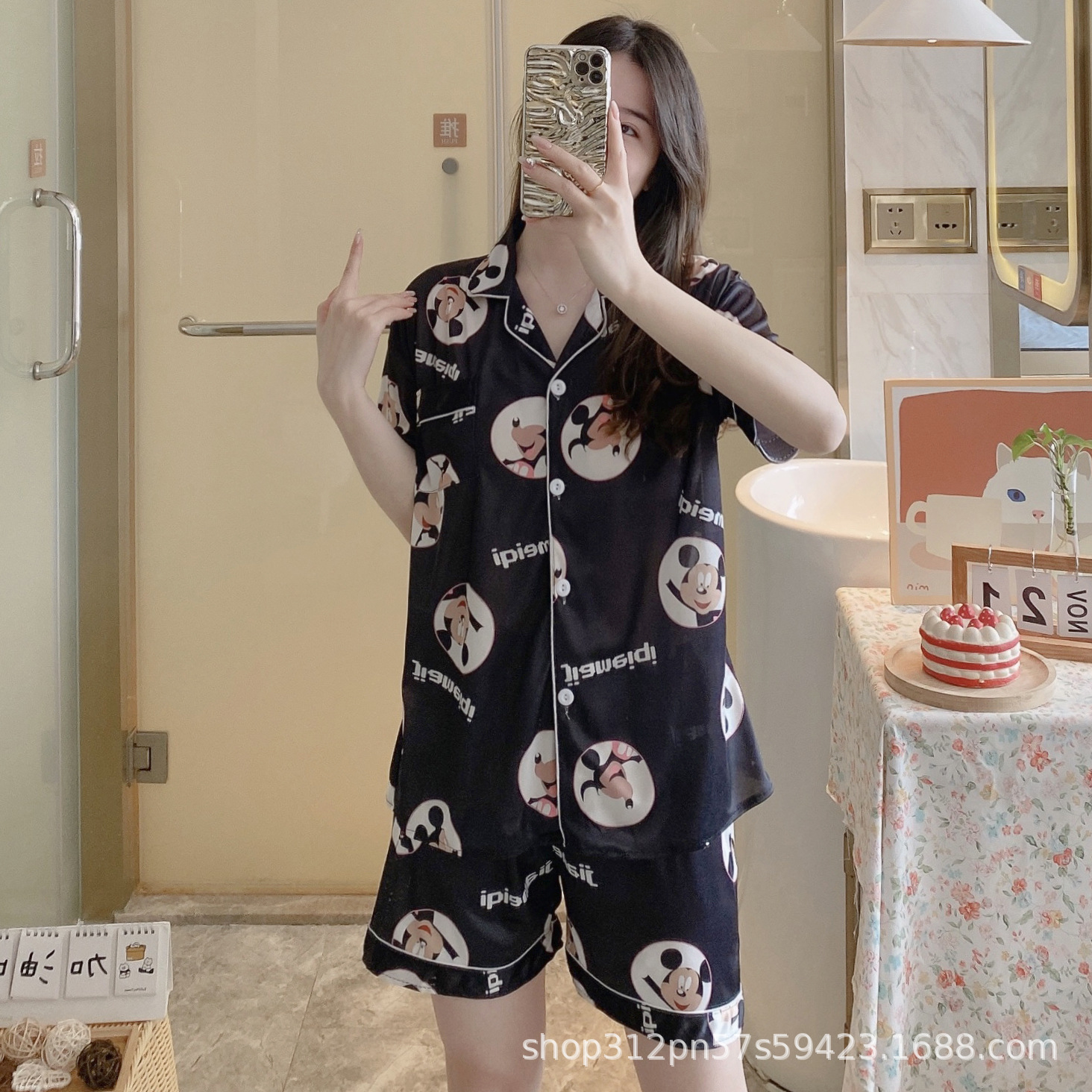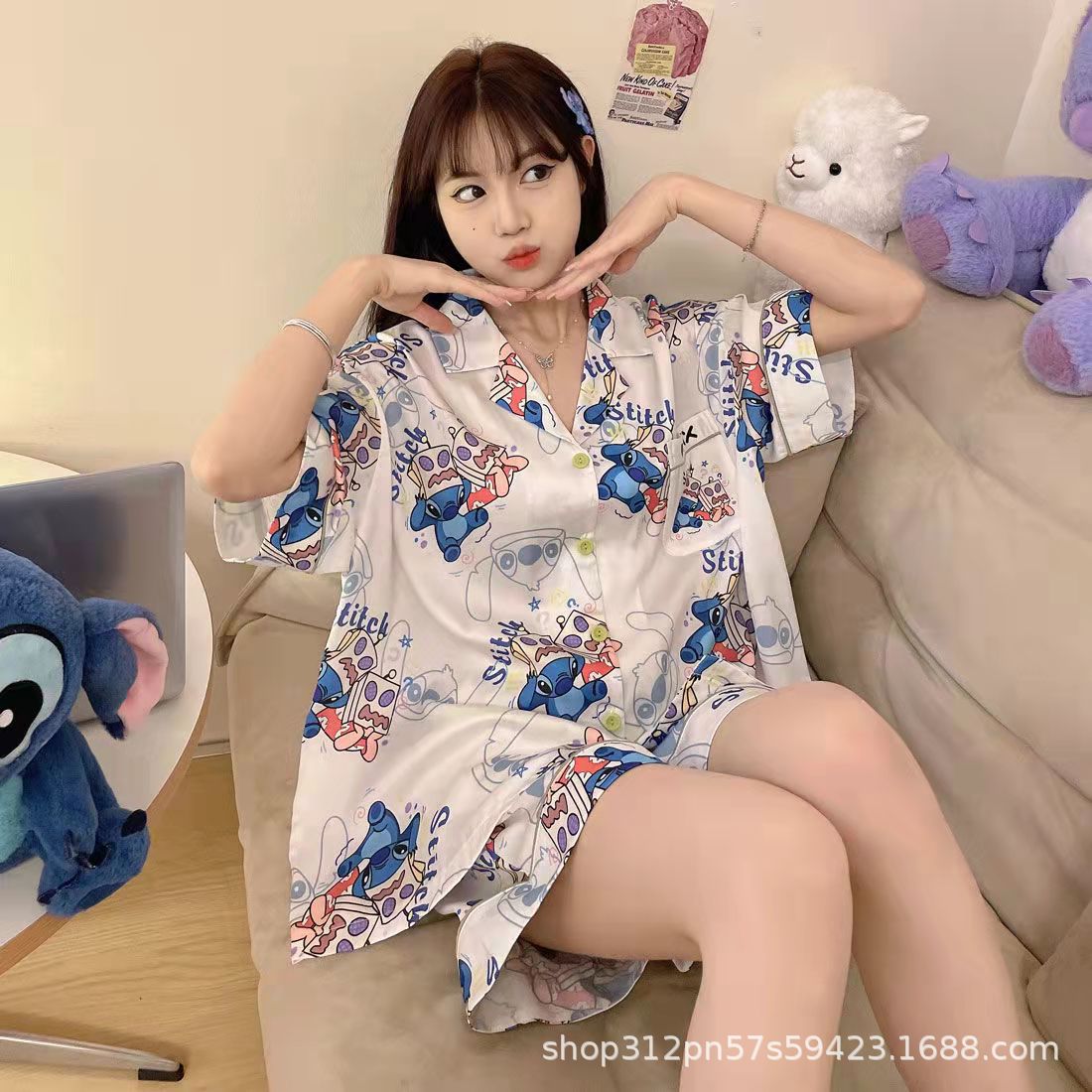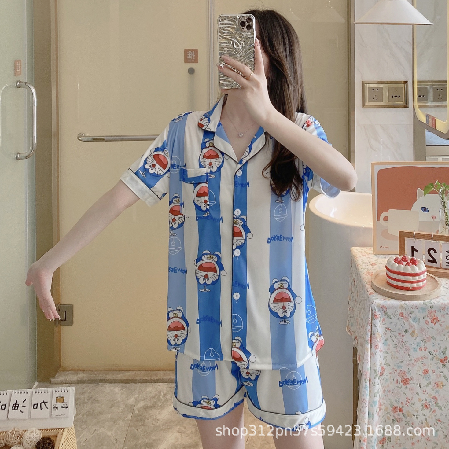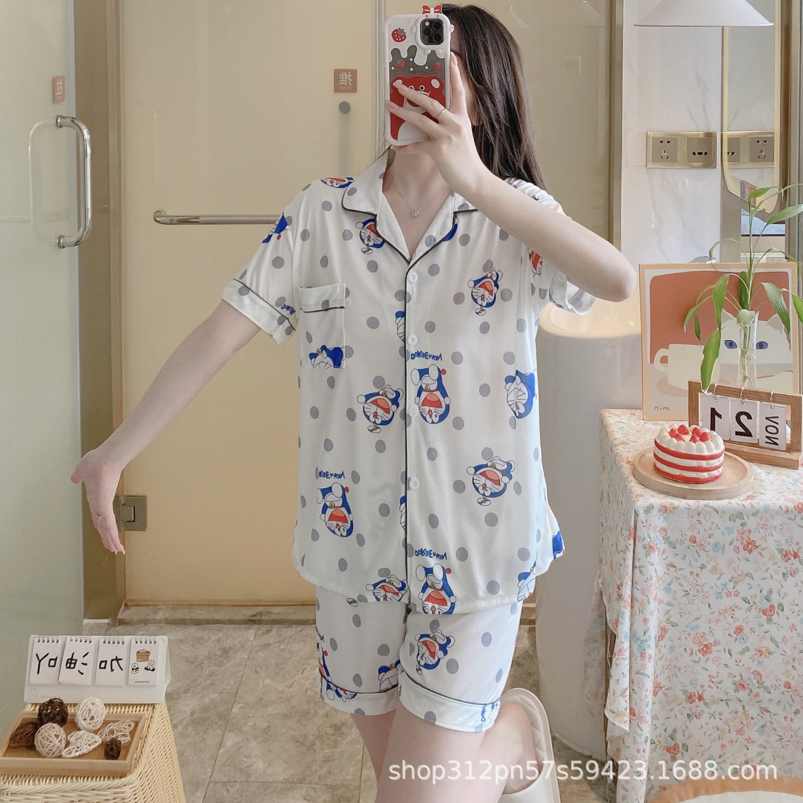 2024 년 여름 새 잠옷 여성 반팔 반바지 한국 버전의 느슨한 헤어 2 피스 홈 옷을 입을 수 있습니다.스토어 가기