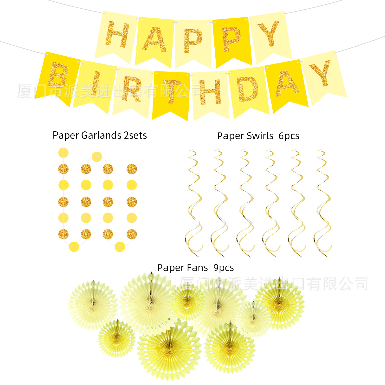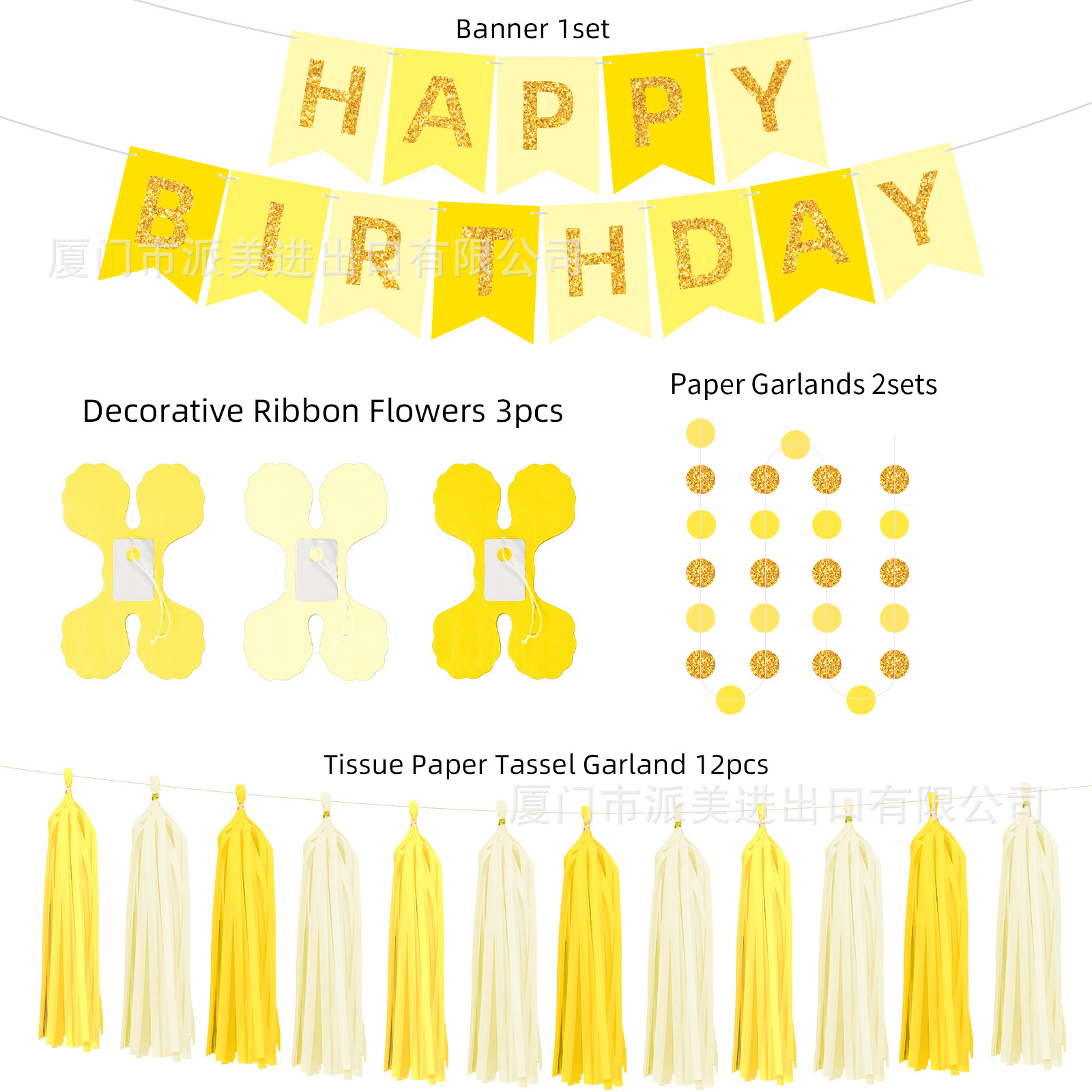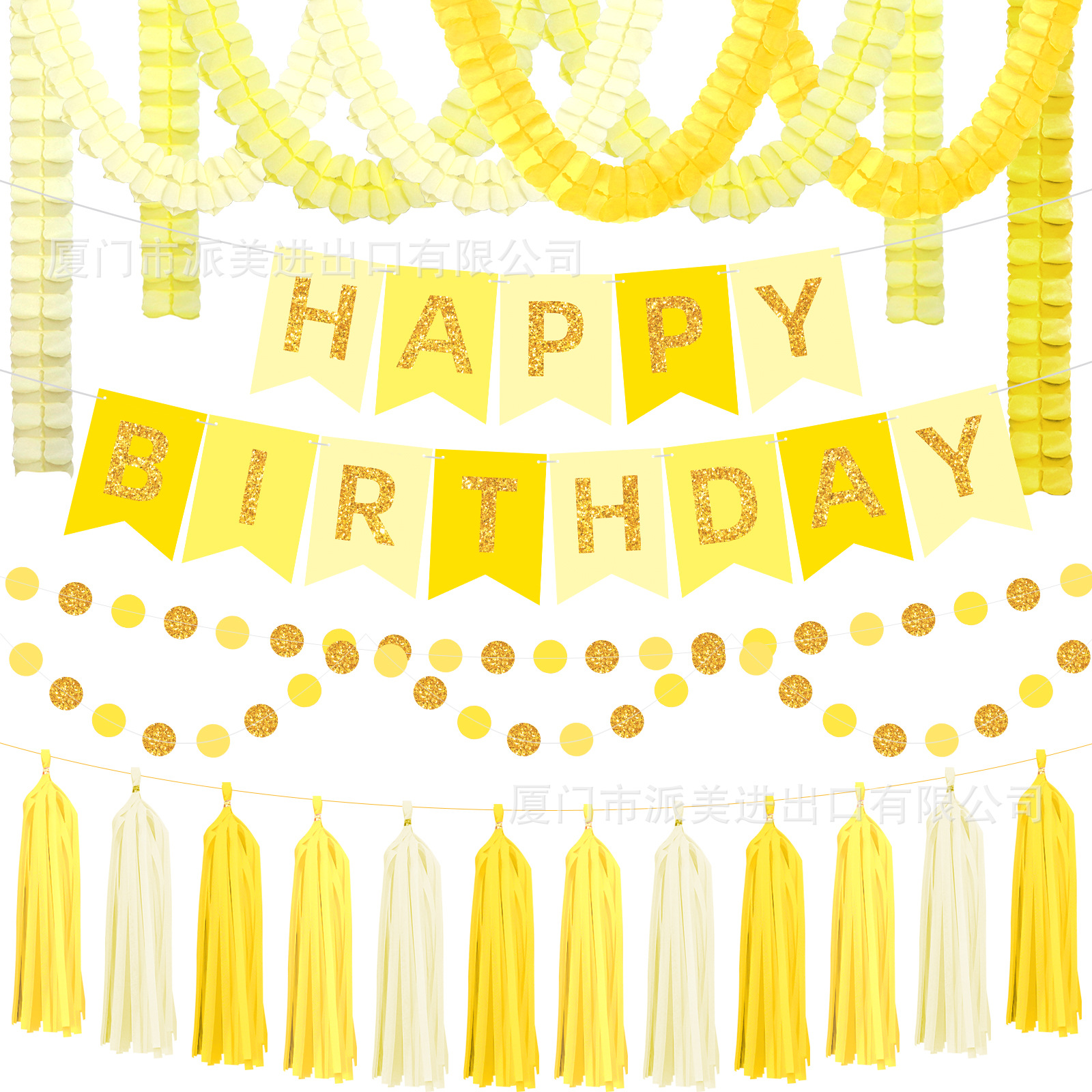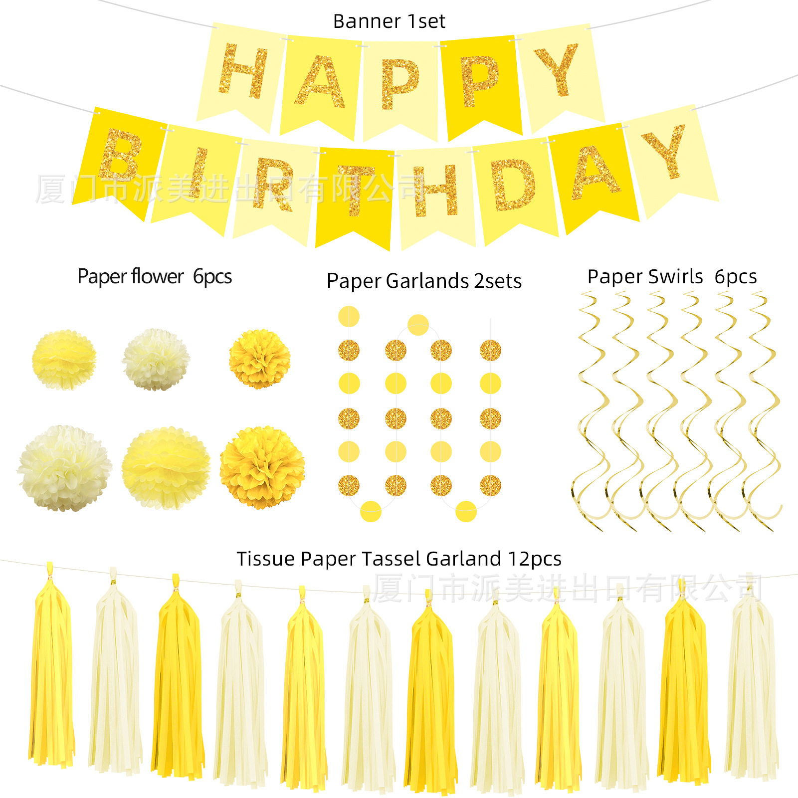 套装1包括:1条拉旗+2条纸串+1组纸花+1套流苏+6条螺旋