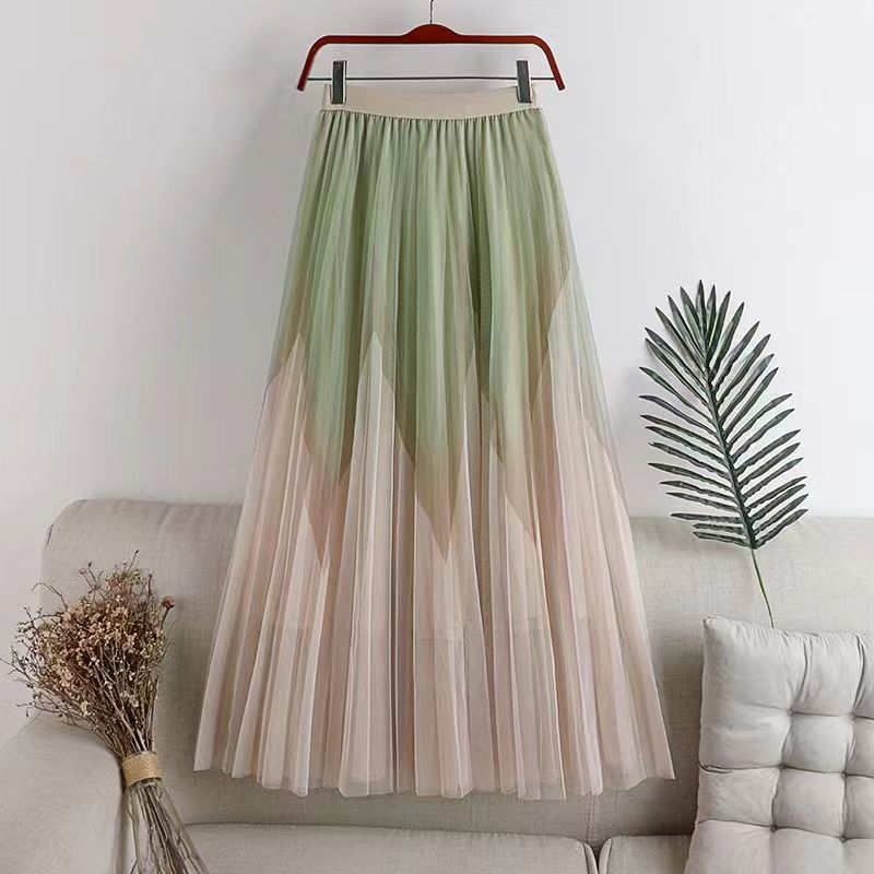 여름 새로운 달콤한 레트로 신선한 바느질 인쇄 높은 허리 미디 메쉬 스커트