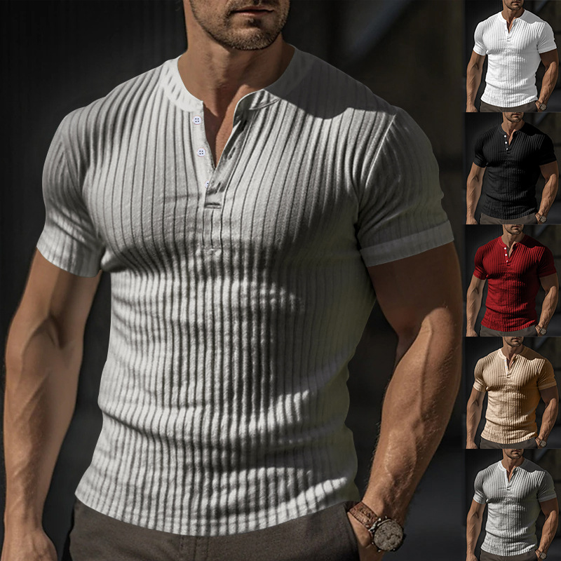 2024 국경 독립 역 AliExpress 남성 솔리드 컬러 핏 스트립 캐주얼 버튼 V-넥 슬림 핏 반팔 헨리 티셔츠스토어 가기
