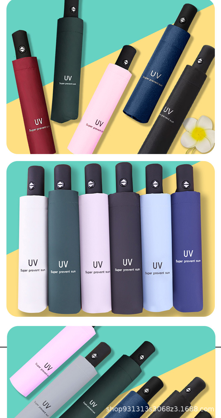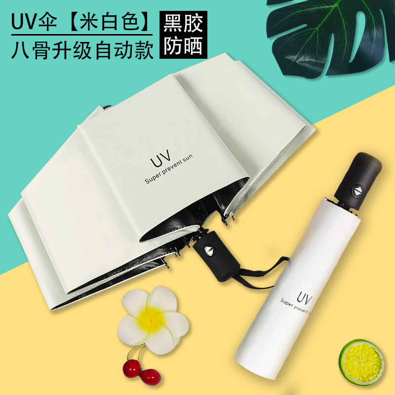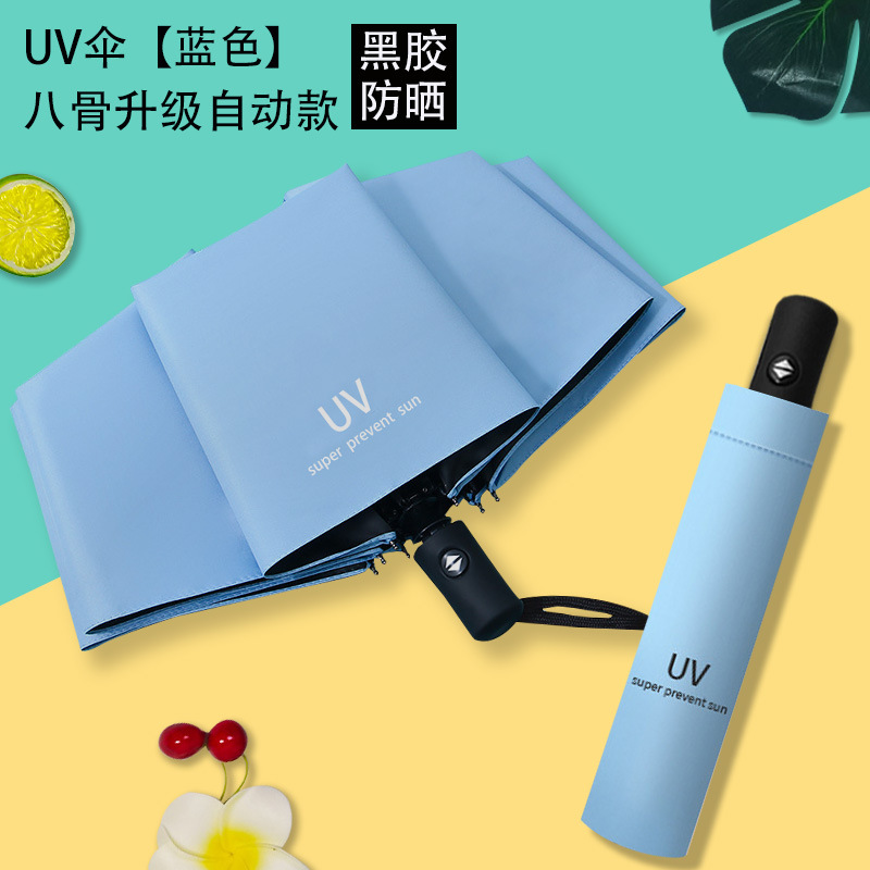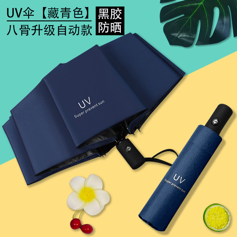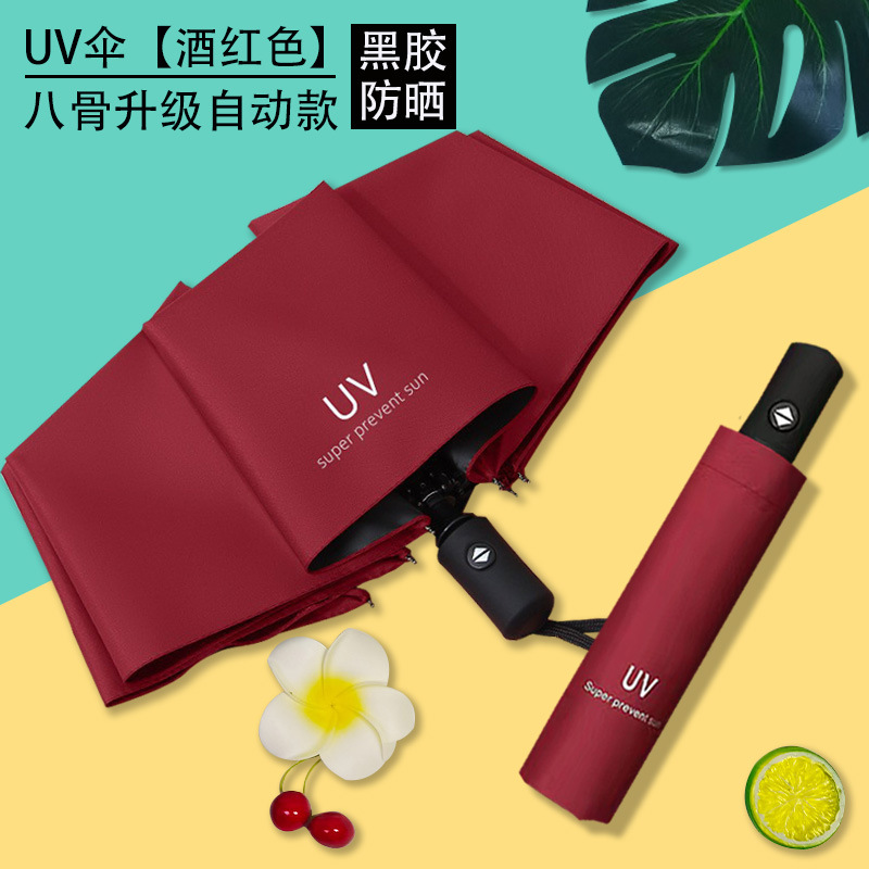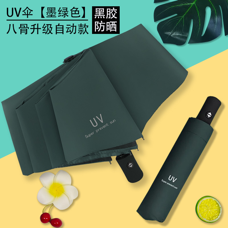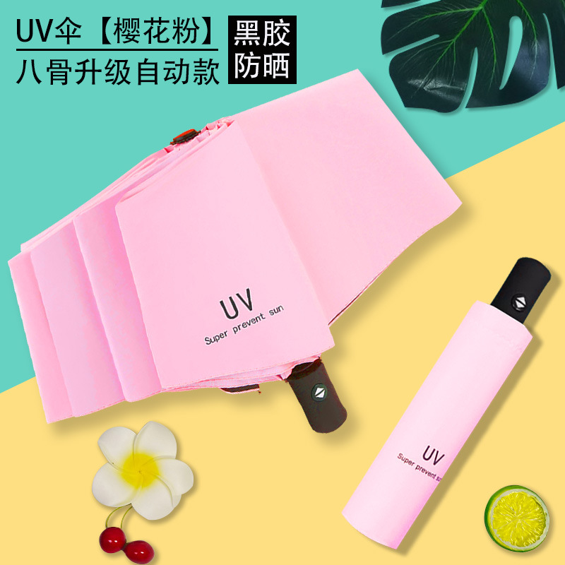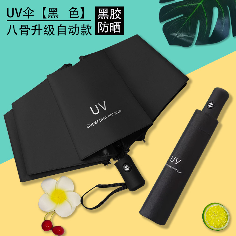 Uv 우산 여성의 높은 수준의 선 스크린 태양 우산 자동 접이식 검은 고무 비와 빛나는 이중 목적 인쇄 로고 광고 우산스토어 가기