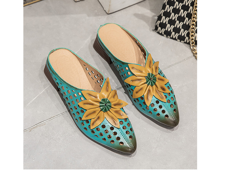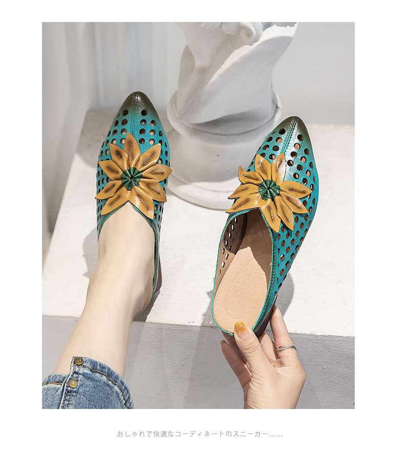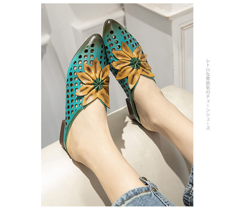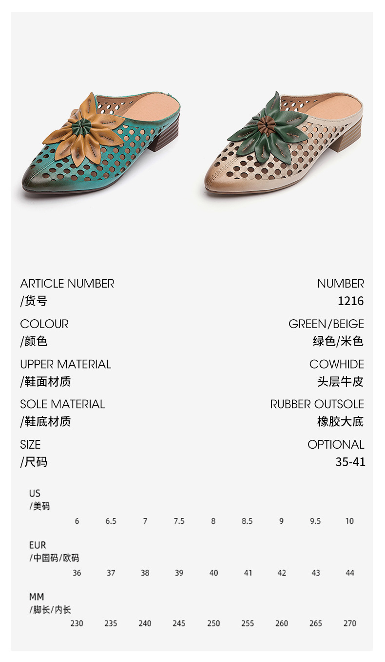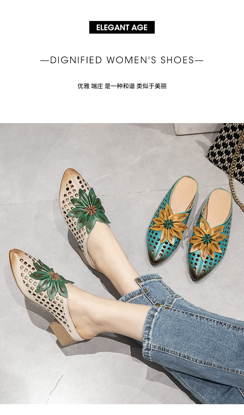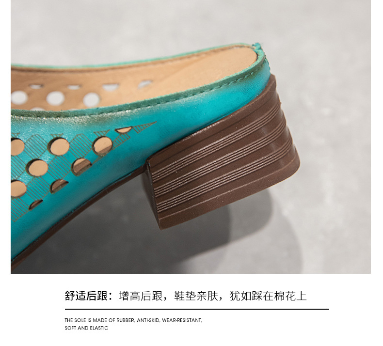 탑 레이어 Cowhide 포인팅 미드 힐 슬리퍼 여성용 미끄럼 방지 올 매치 민족 스타일 정품 가죽 두꺼운 힐 샌들 (Baotou 포함)스토어 가기